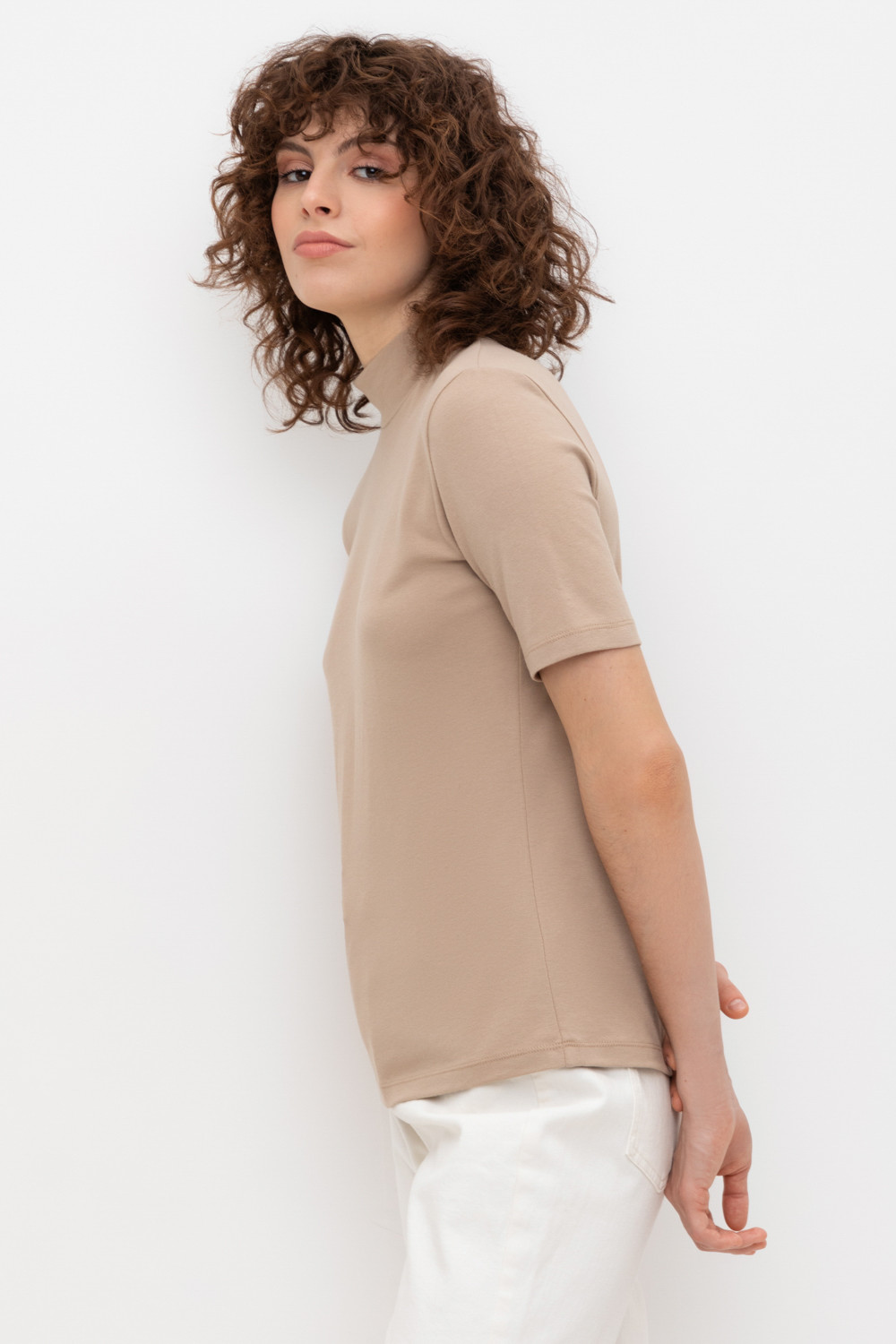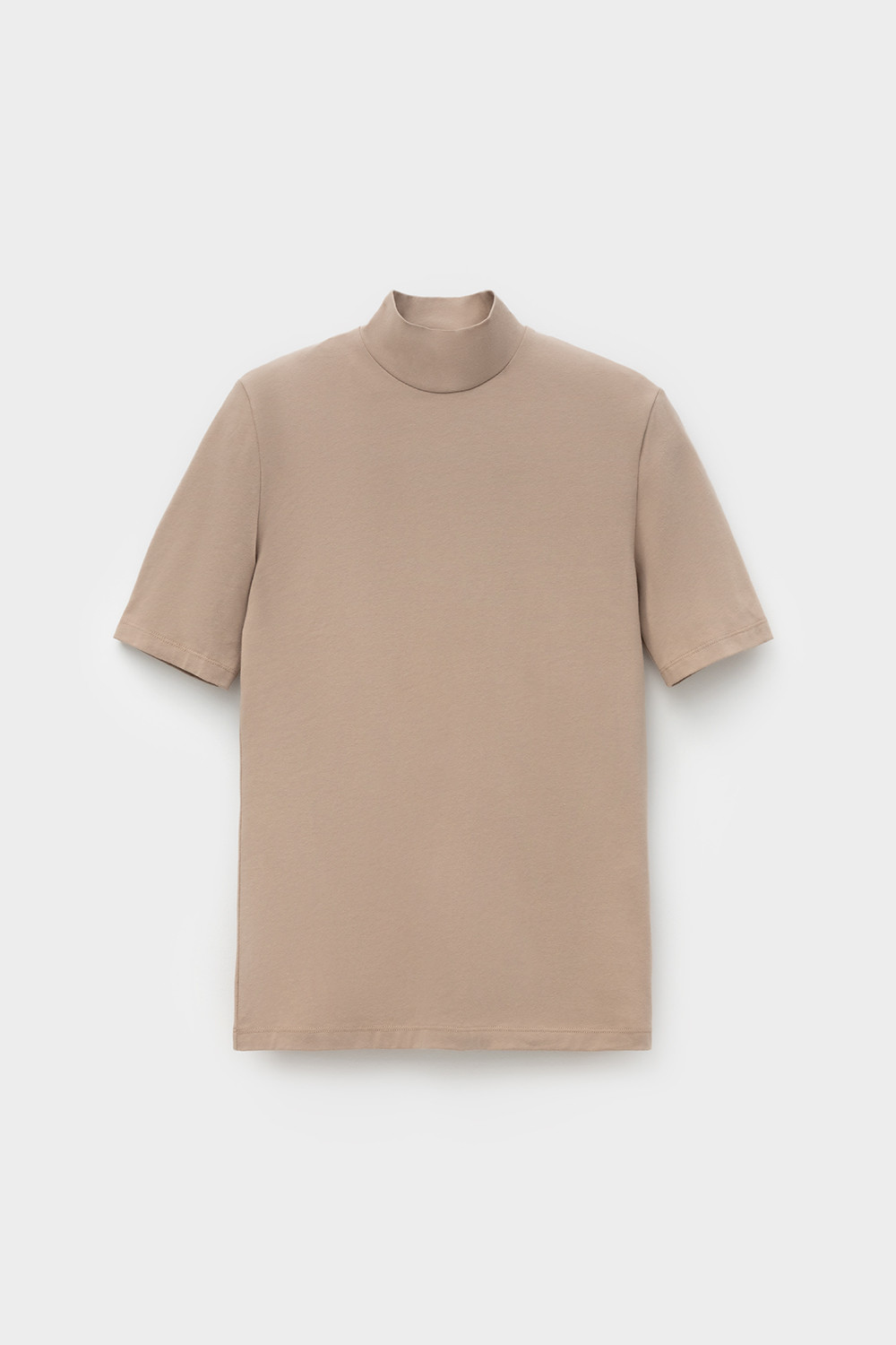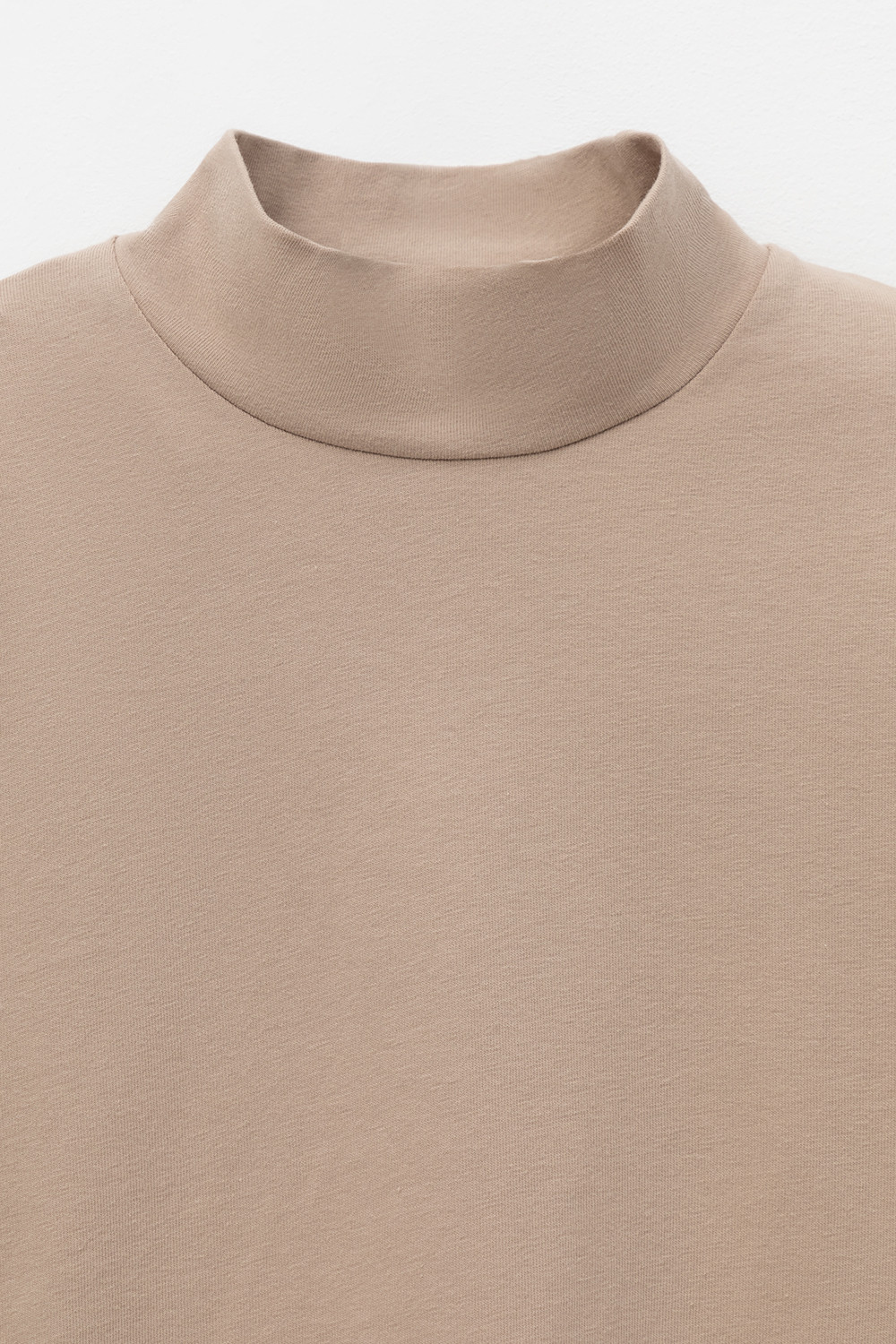 Базовый джемпер с короткими рукавами и воротником-стойкой из плотного однотонного трикотажа супрем с добавлением спандекса.