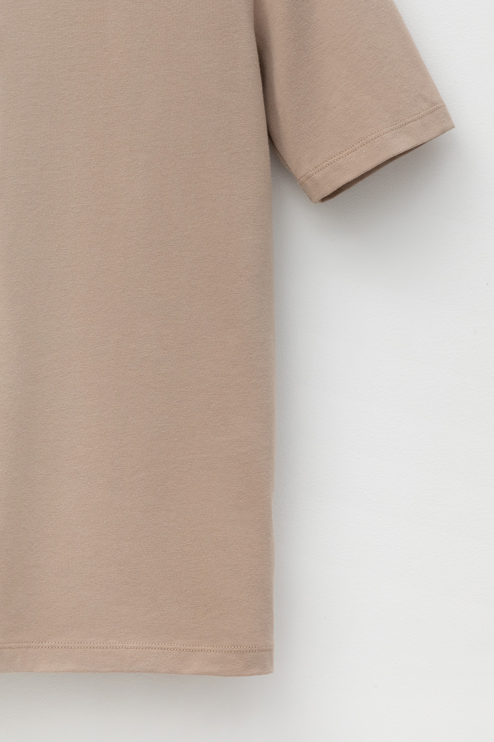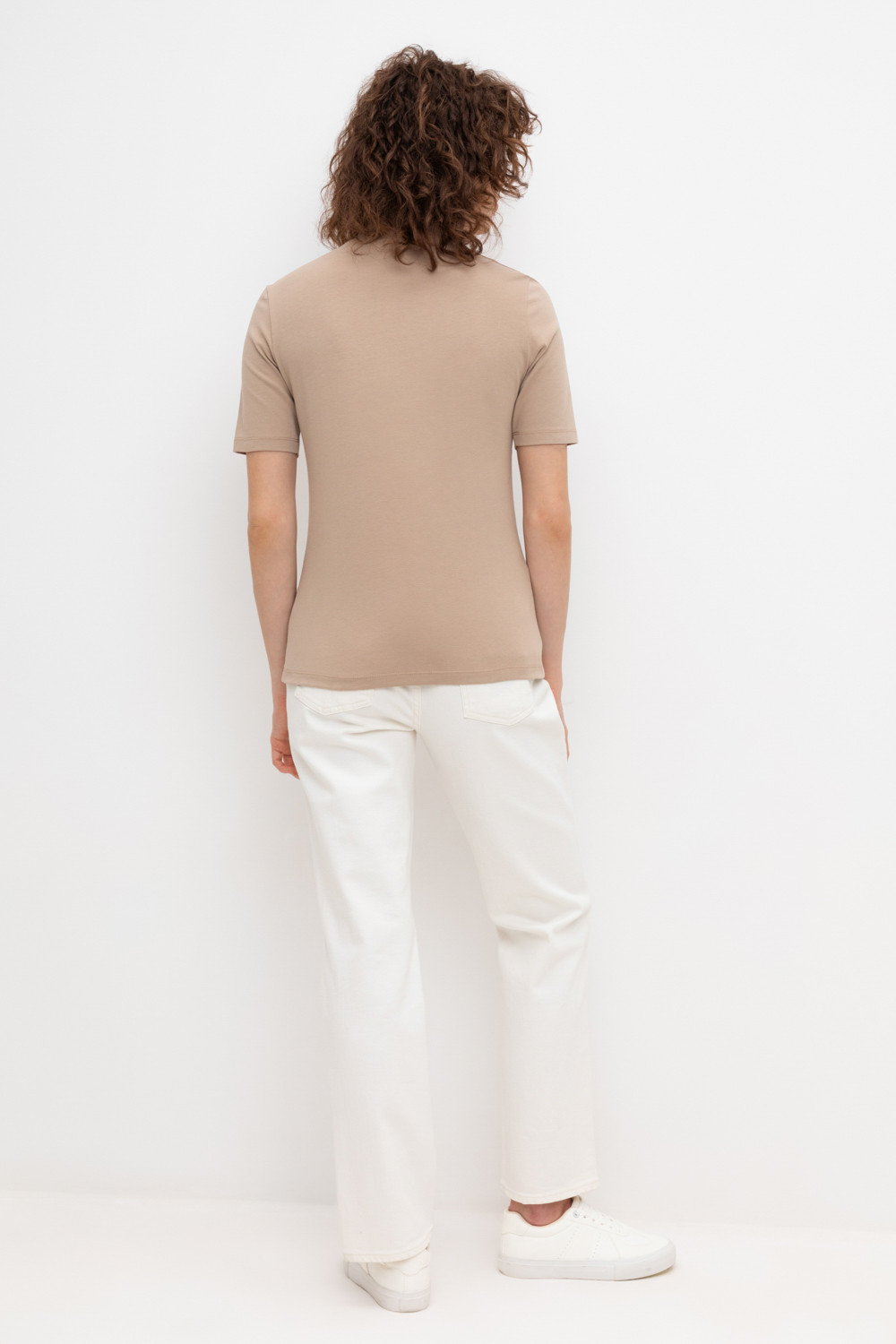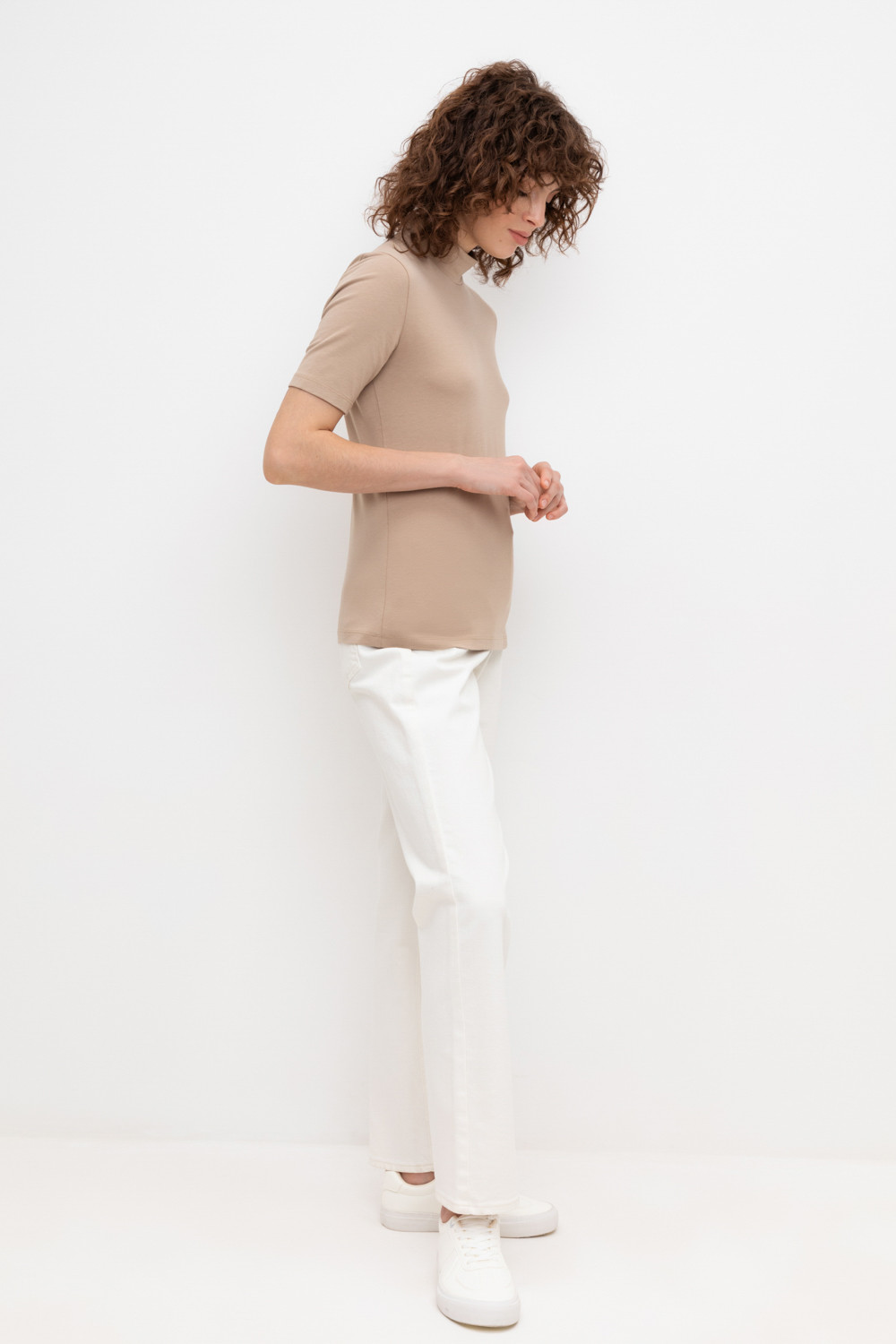 Базовый джемпер с короткими рукавами и воротником-стойкой из плотного однотонного трикотажа супрем с добавлением спандекса.