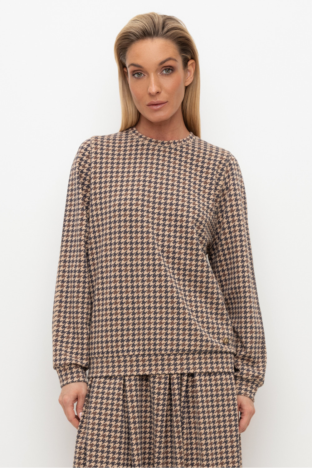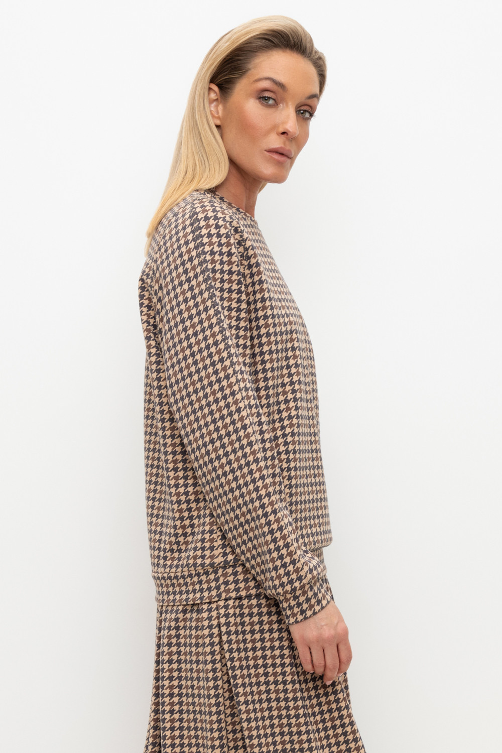 Уютный джемпер со спущенным плечом и объемными рукавами из плотного гладкого трикотажа интерлок.