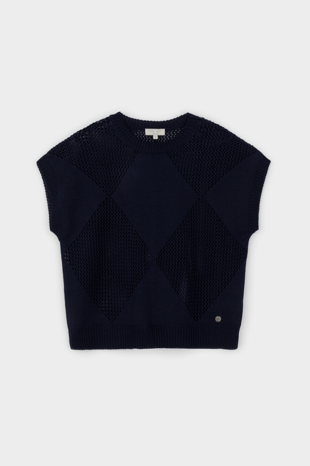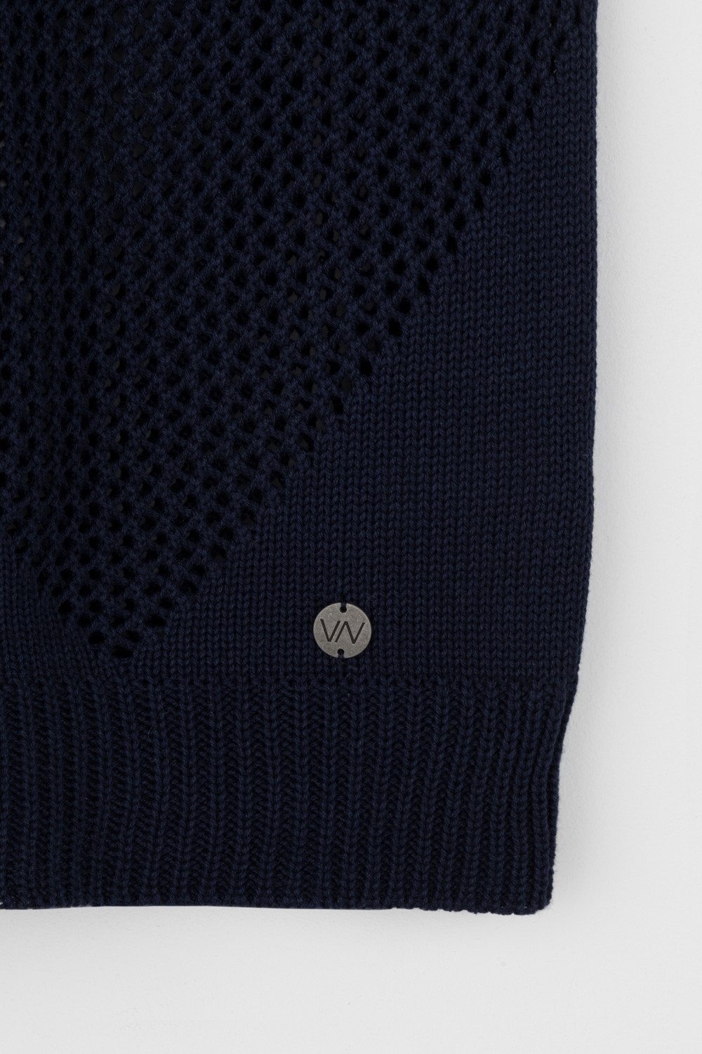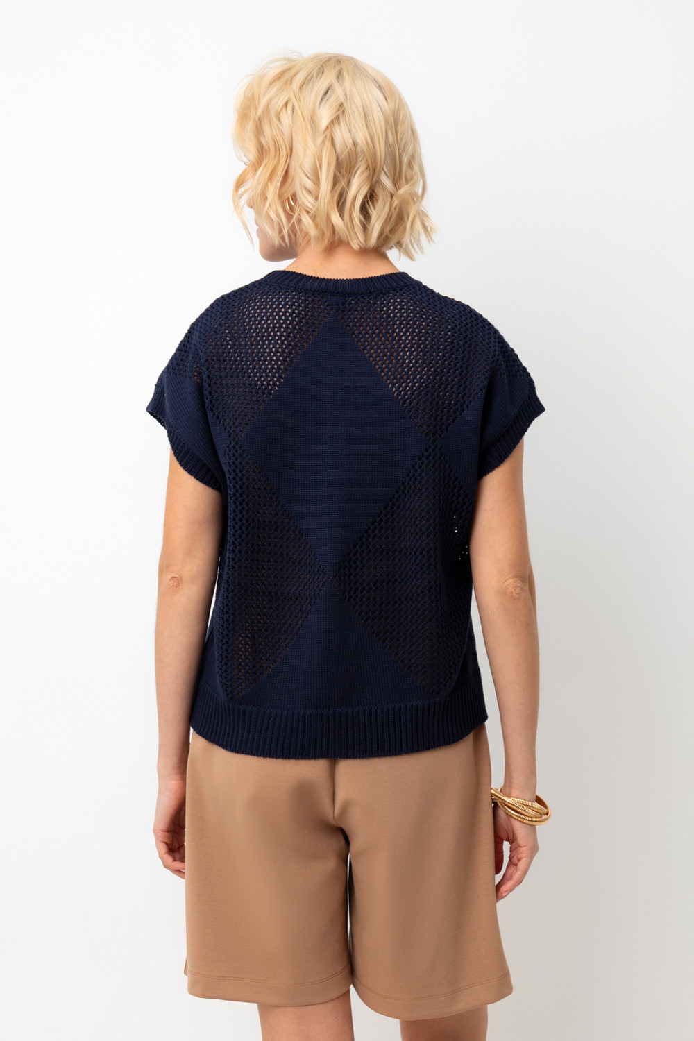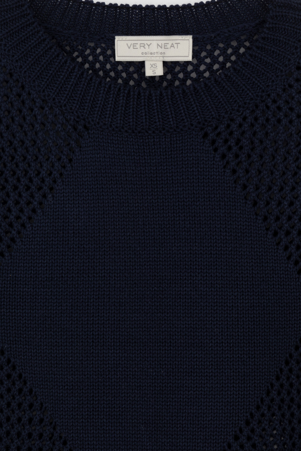 Джемпер со спущенным плечом ажурной вязки из итальянского хлопка. Умеренное переплетение, хлопок в составе придают изделию форму и ощущение комфорта во время носки. Незаменим в повседневном летнем гардеробе.