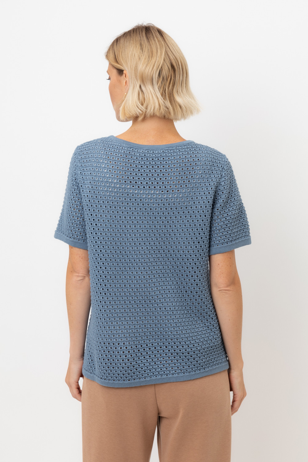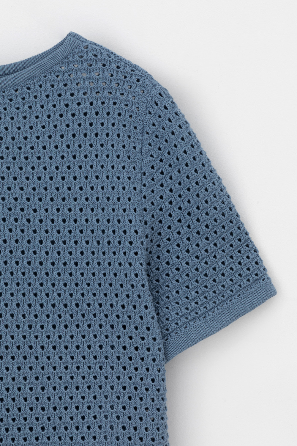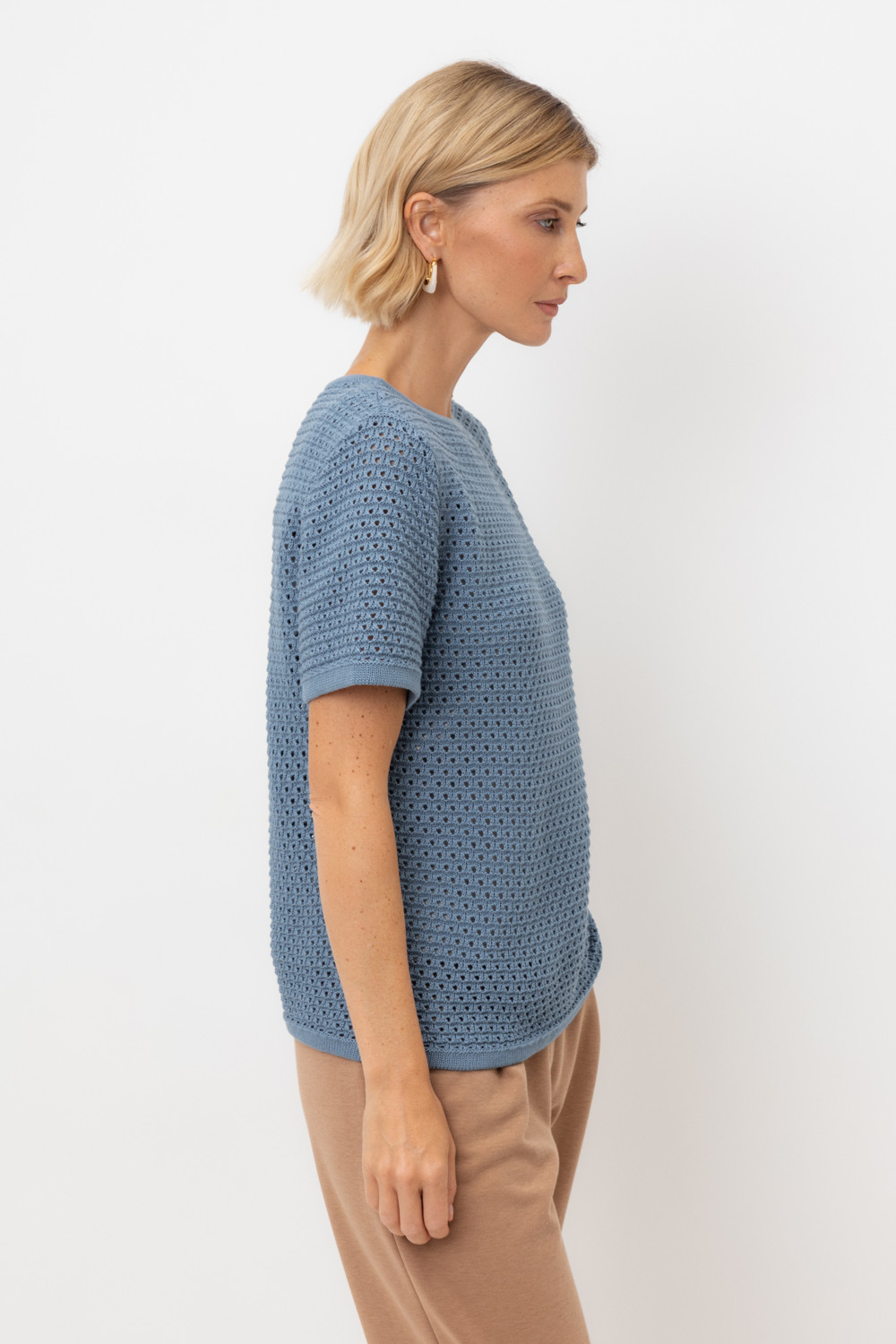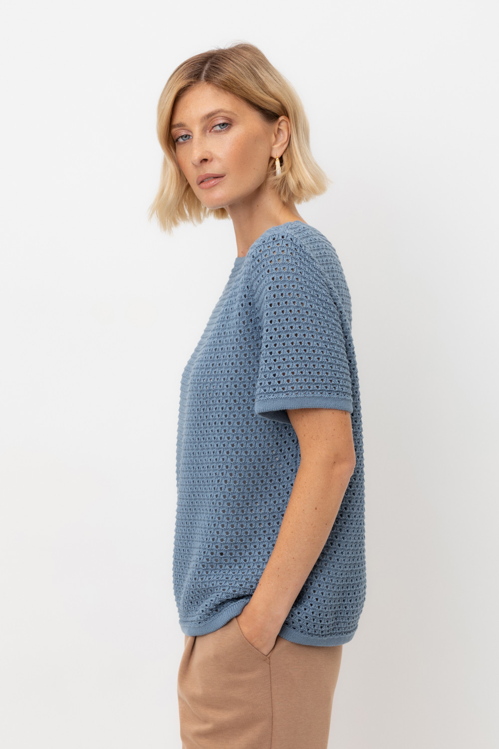 Джемпер с коротким рукавом ажурной вязки из итальянского хлопка. Умеренное переплетение, хлопок в составе придают изделию форму и дают ощущение комфорта во время носки. Незаменим в повседневном летнем гардеробе.