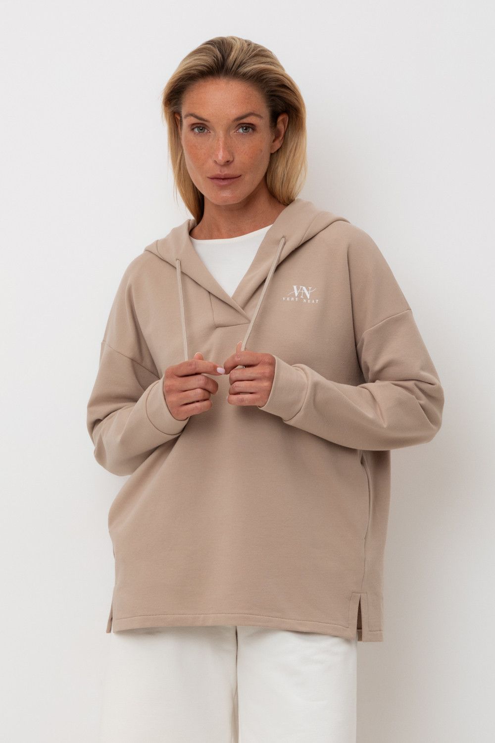 Подарите себе ощущение комфорта и уюта с худи из мягкого эластичного футера в теплом песочном оттенке. Спущенные плечи, удлиненная спинка и объёмный капюшон в сочетании с вместительными карманами придают изделию расслабленный вид.