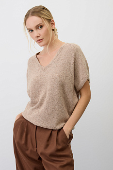 Джемпер с коротким  руковом из уникальной коллекции премиальных изделий, выполненных из итальянской шерсти, включает в себя мягчайшую шерсть мериноса и натуральный шелк. Это идеальное сочетание обеспечивает комфортное прилегание к телу, отличную терморегуляцию, воздухопроницаемость и отсутствие раздражения даже на самой чувствительной коже. Гладкая текстура с изысканными вкраплениями выглядит особенно стильно и современно.