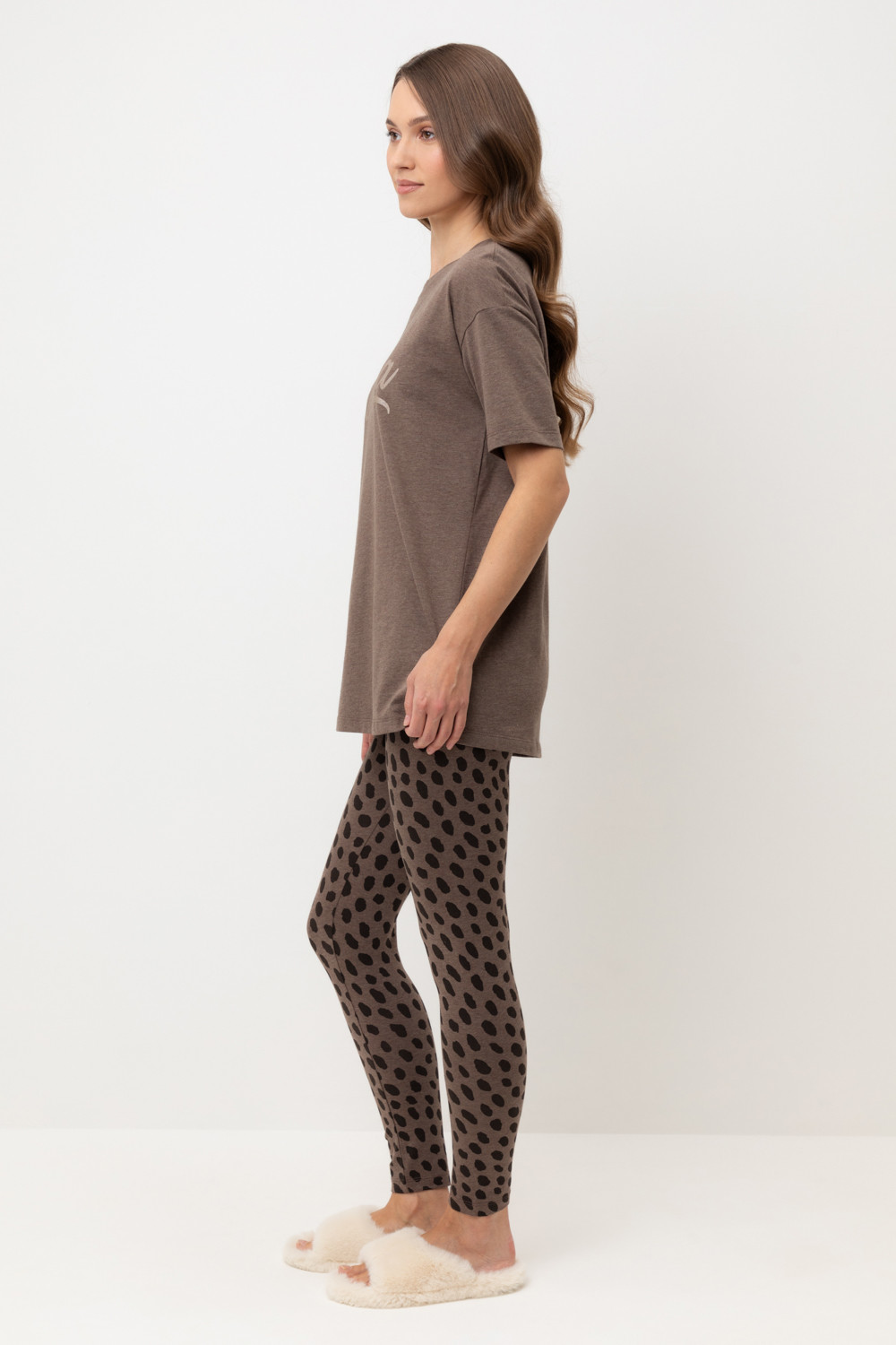 Комплект для сна и отдыха из меланжевого трикотажа. Удлиненная футболка комфортно садится по фигуре. Бриджи из набивного трикотажа с добавлением лайкры с мягким поясом на резинке.