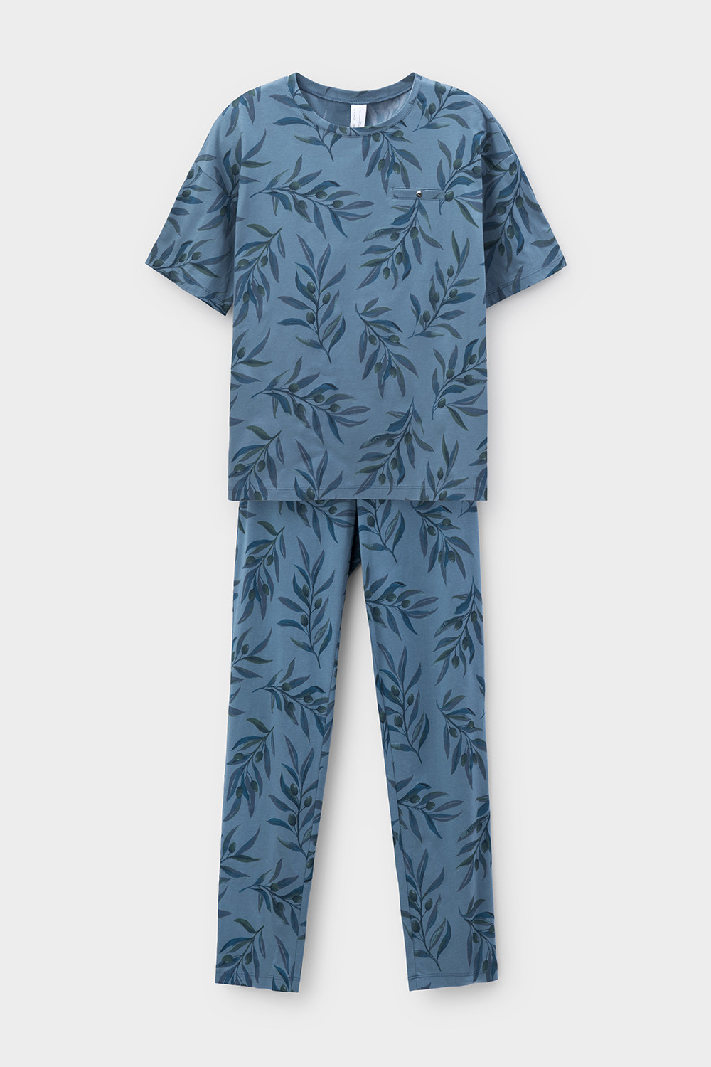 Легкий комплект для комфортного сна и отдыха из натурального хлопка. Футболка с карманом и спущенной линией плеча комфортно садится по фигуре.  Брюки с поясом на резинке выполнены из набивного трикотажа. Гладкий материал приятен к телу и позволяет коже дышать.