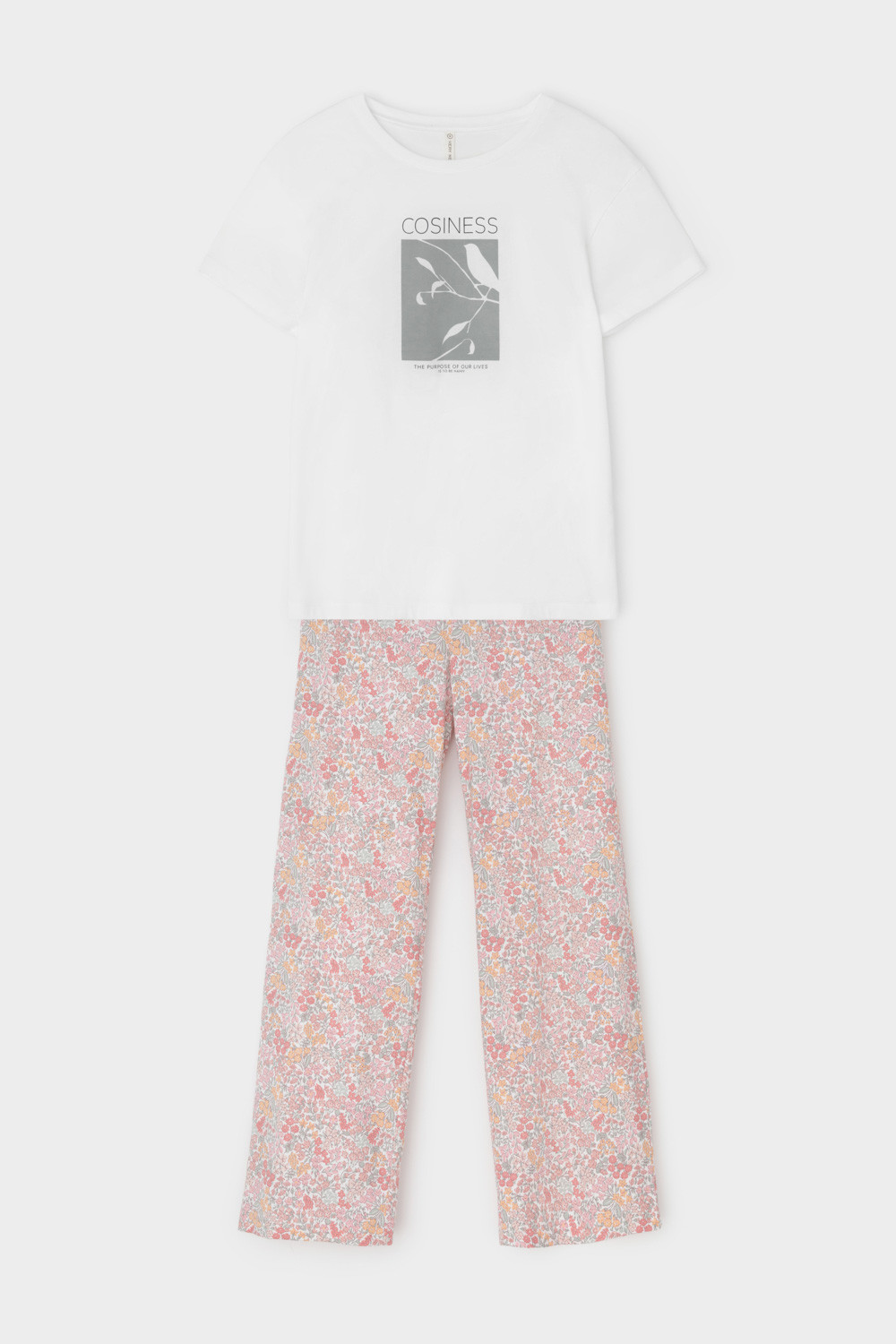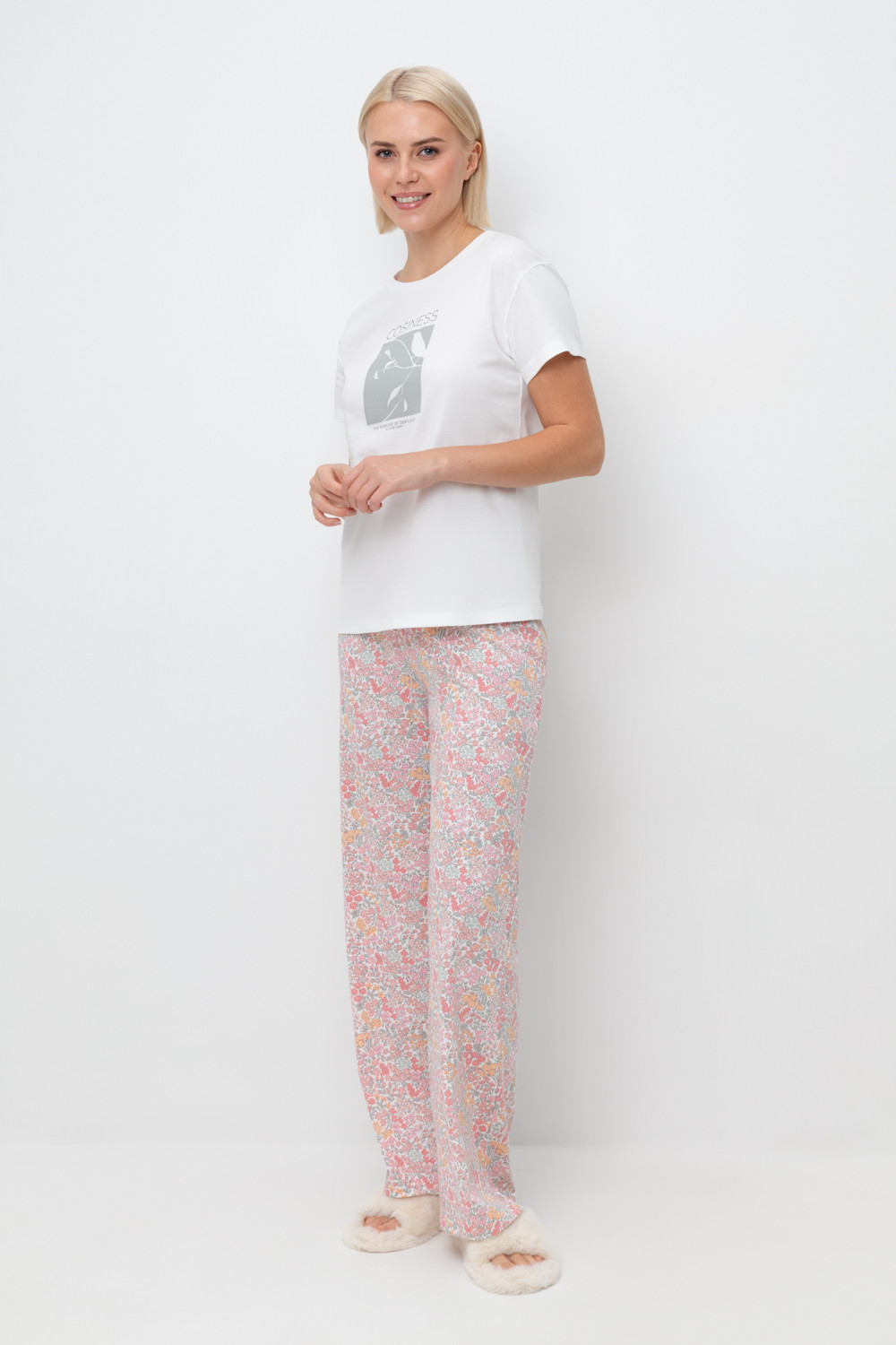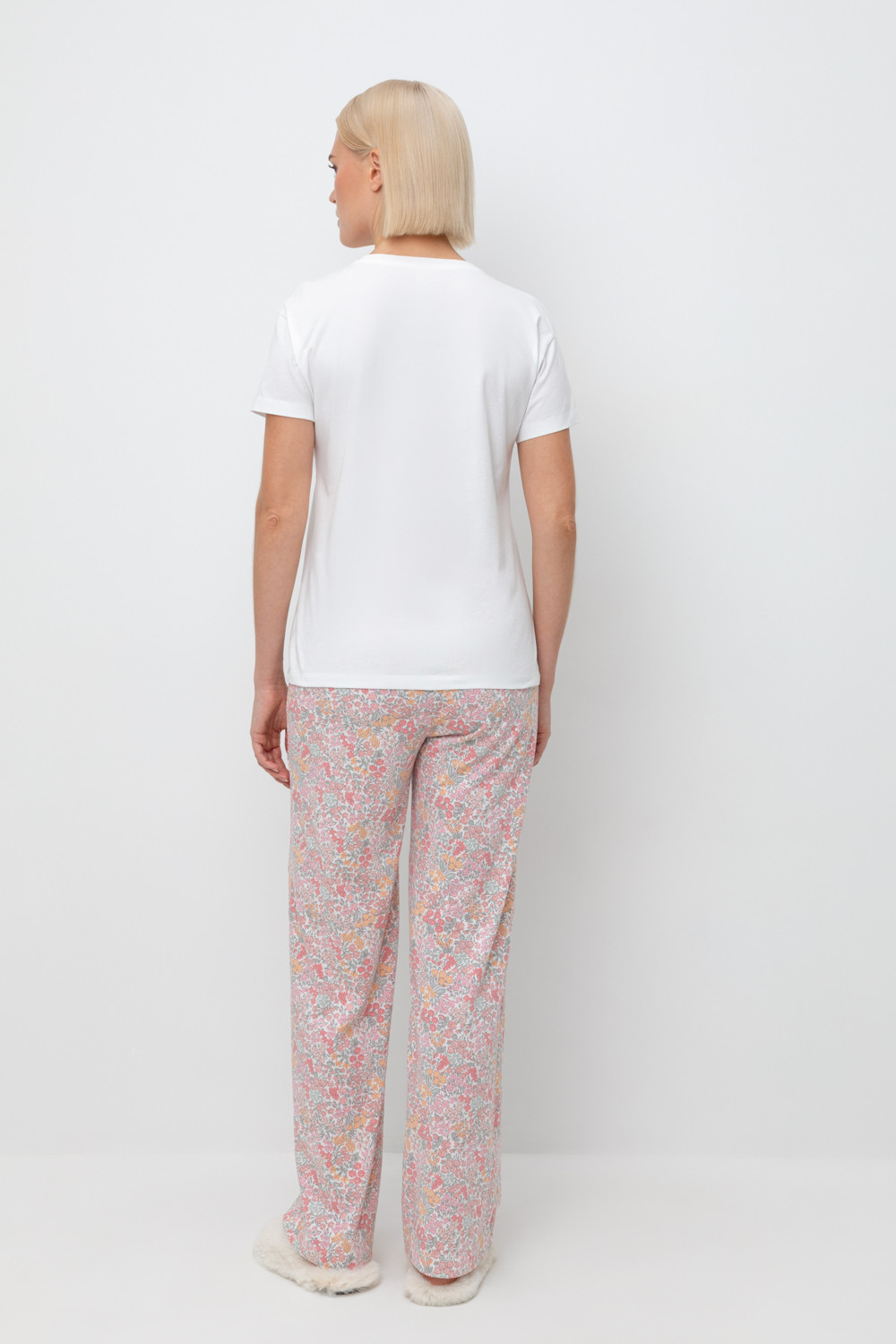 Комплект из высококачественного гребенного хлопка. Свободный крой брюк дополнен широким, удобным поясом, а футболку молочного цвета украшает мягкий на ощупь принт, который выполнен на основе  водных красок, что обеспечивает устойчивость к многократным стиркам.