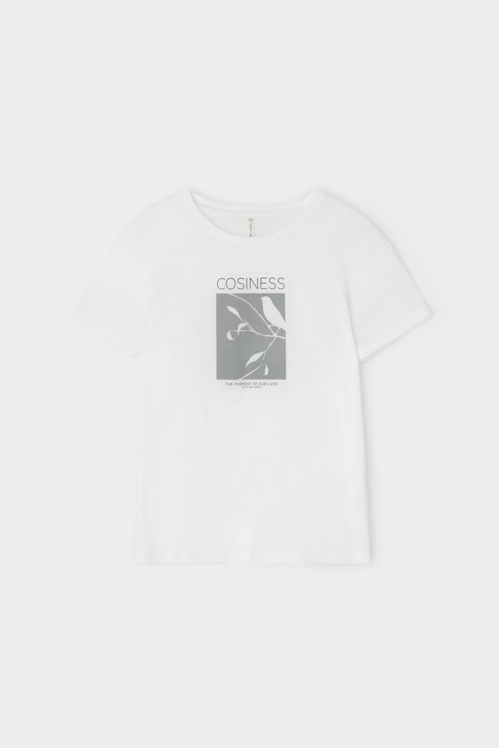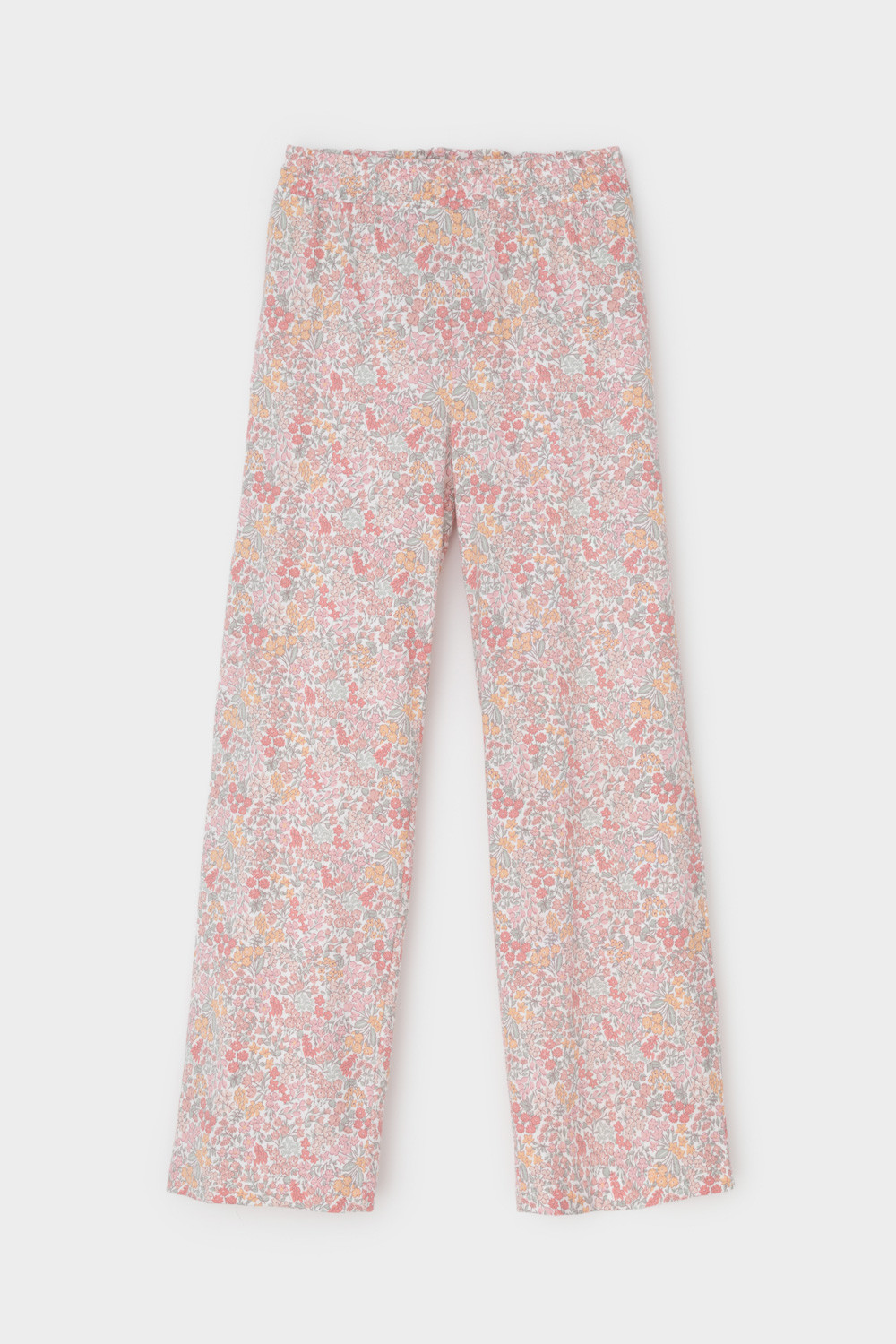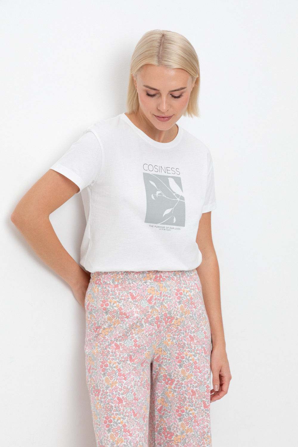 Комплект из высококачественного гребенного хлопка. Свободный крой брюк дополнен широким, удобным поясом, а футболку молочного цвета украшает мягкий на ощупь принт, который выполнен на основе  водных красок, что обеспечивает устойчивость к многократным стиркам.