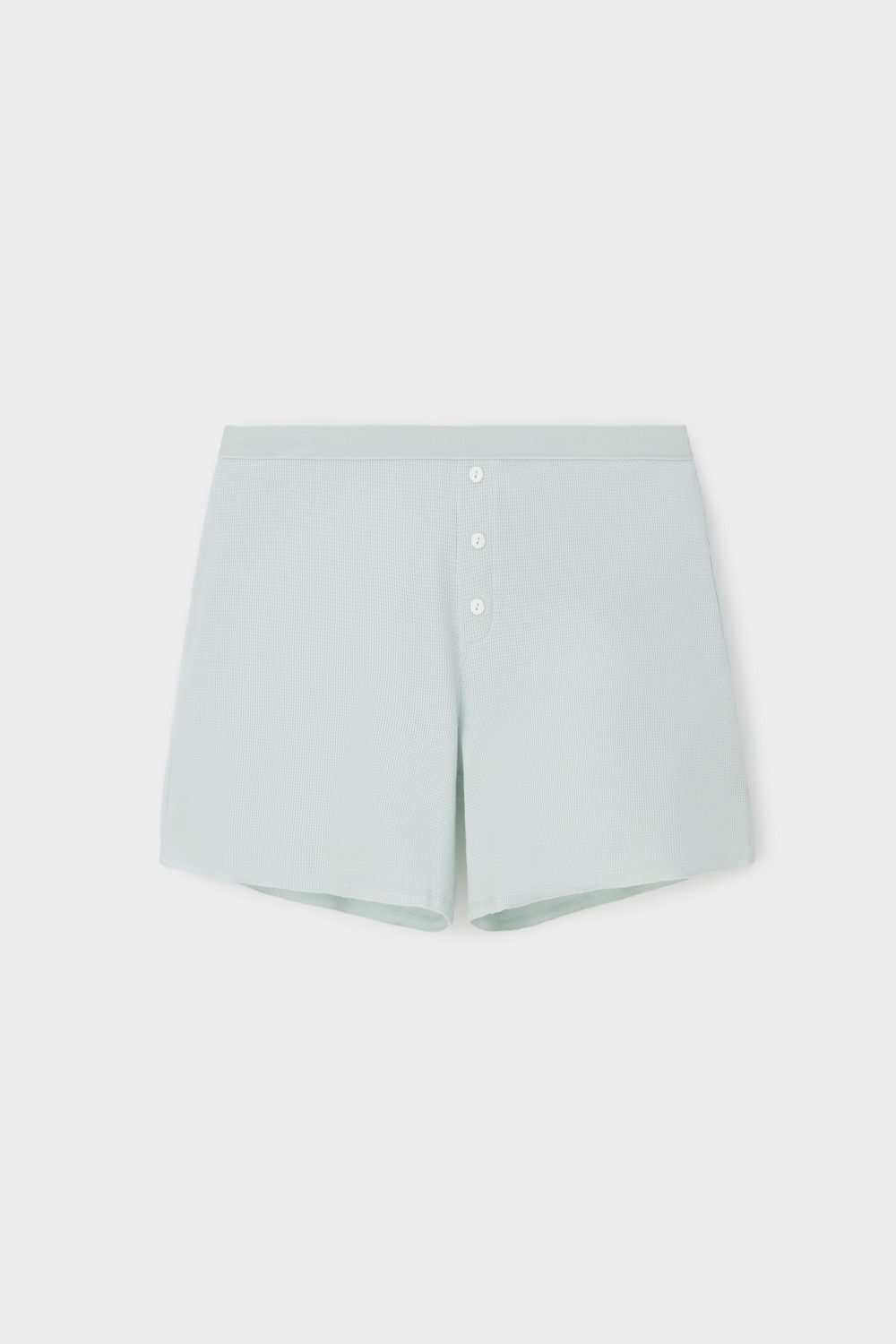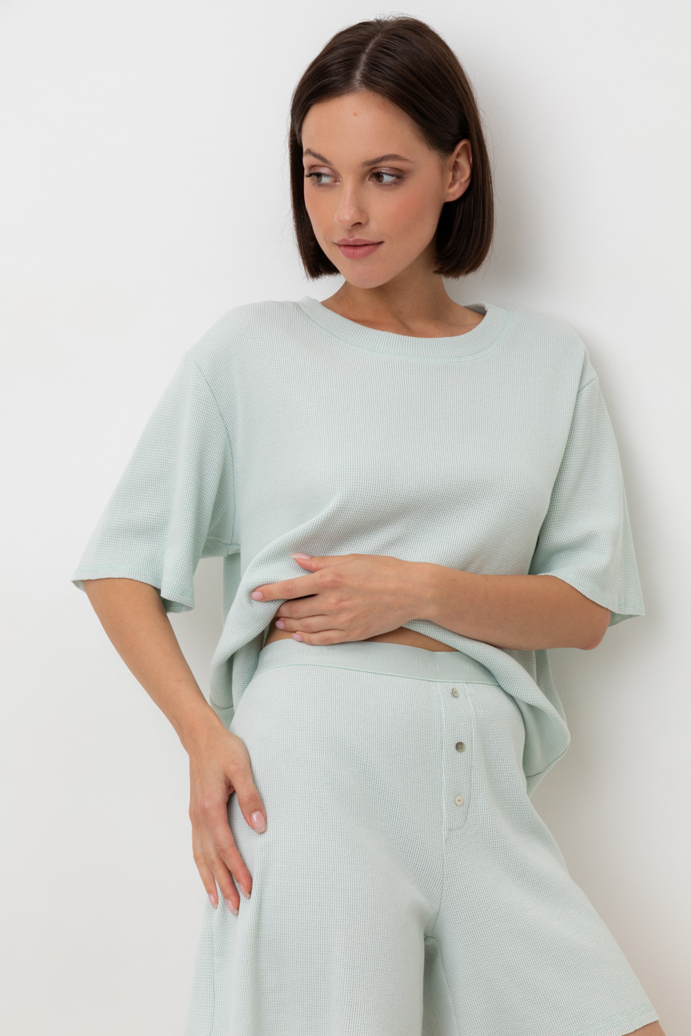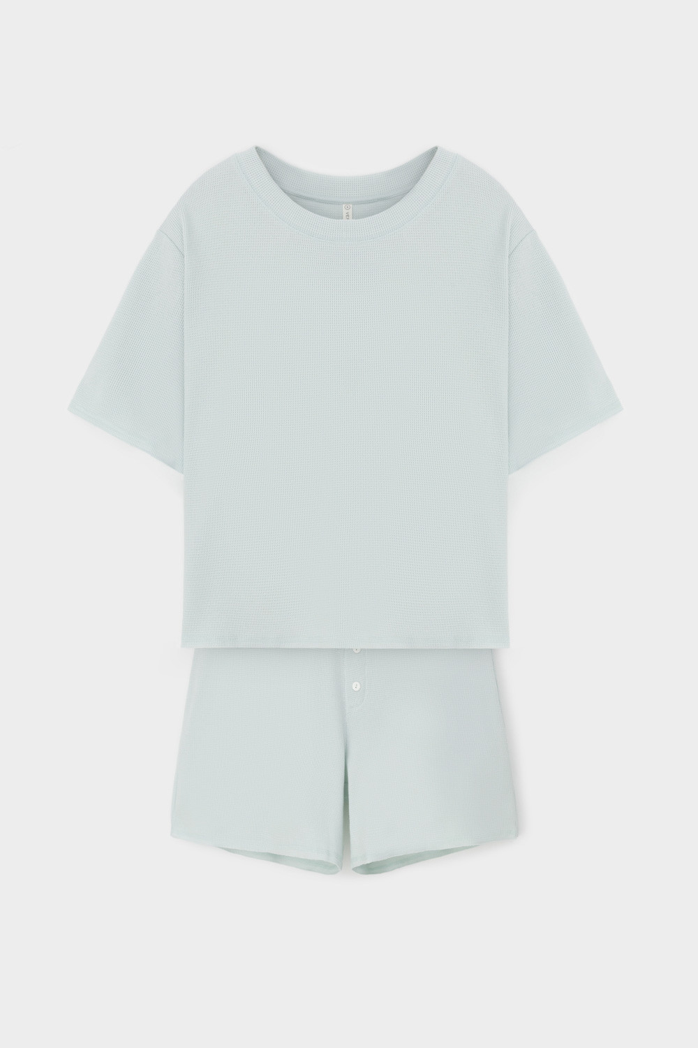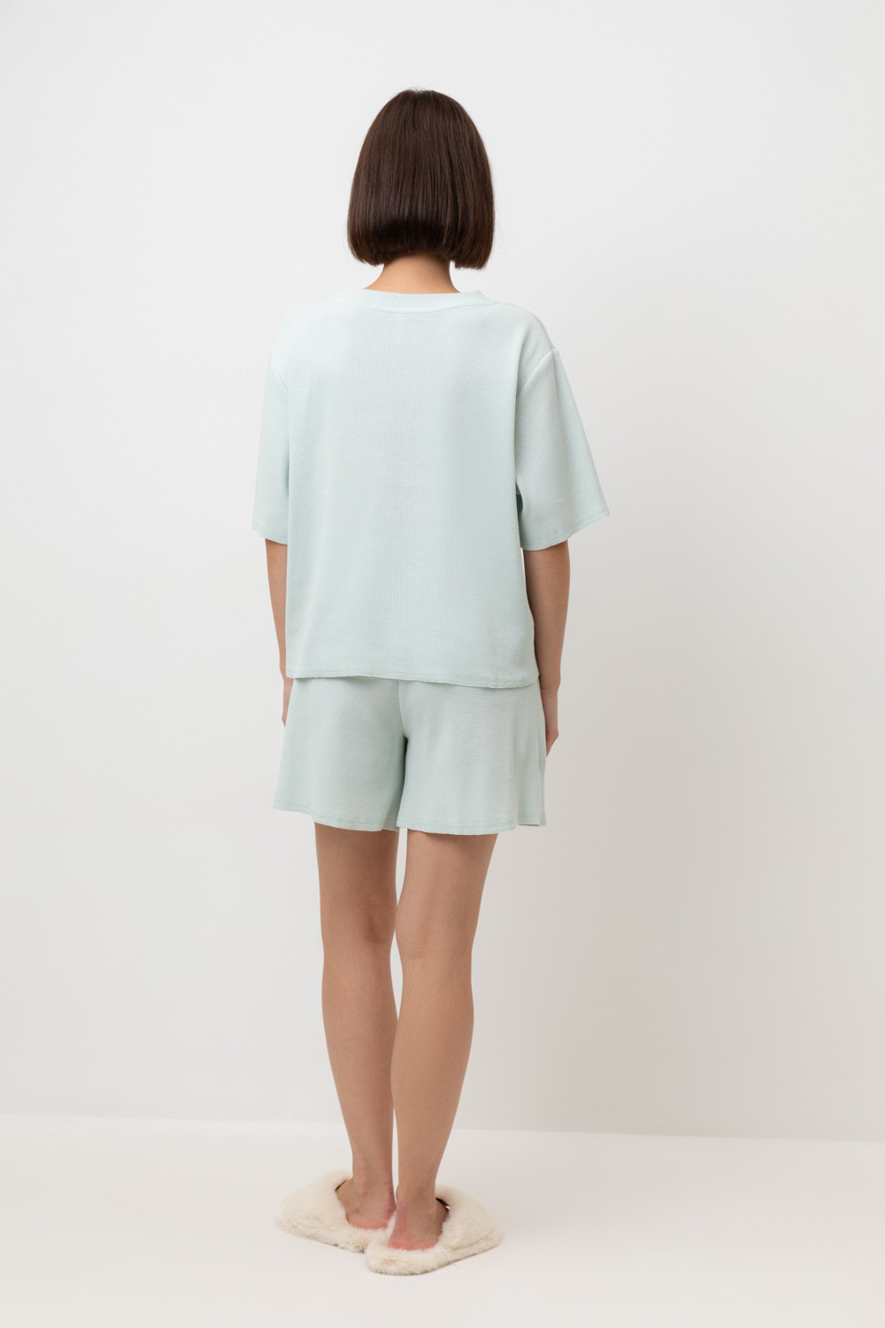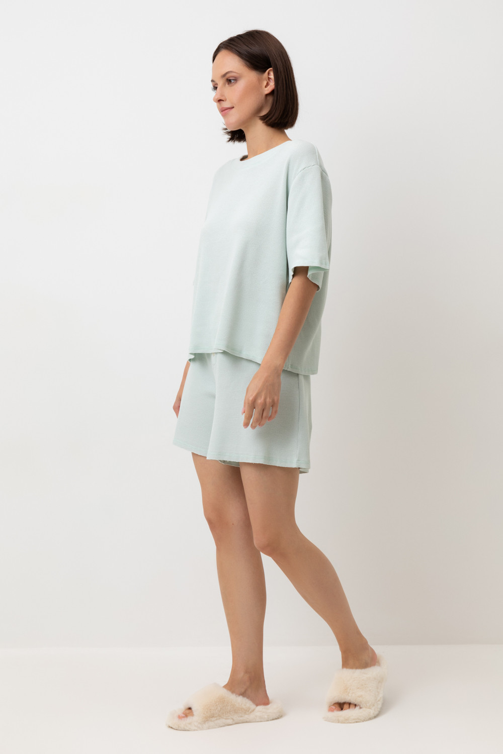 Комплект из объемного трикотажа с добавлением эластичных волокон. Свободный силуэт и мягкий пояс  обеспечат комфорт во время сна и отдыха.
