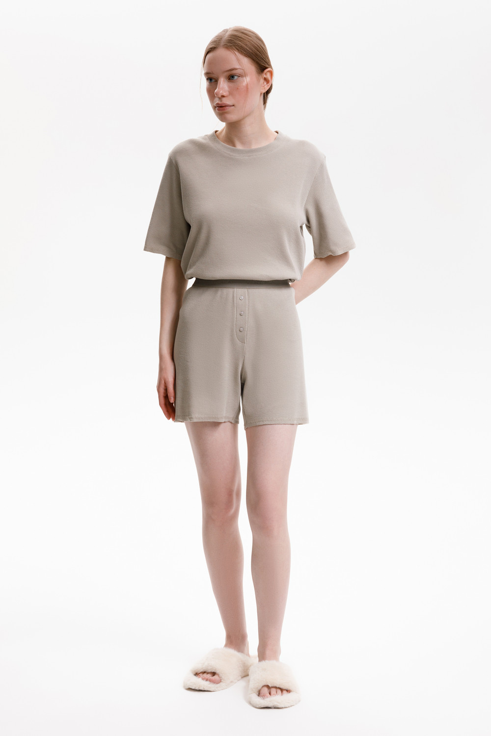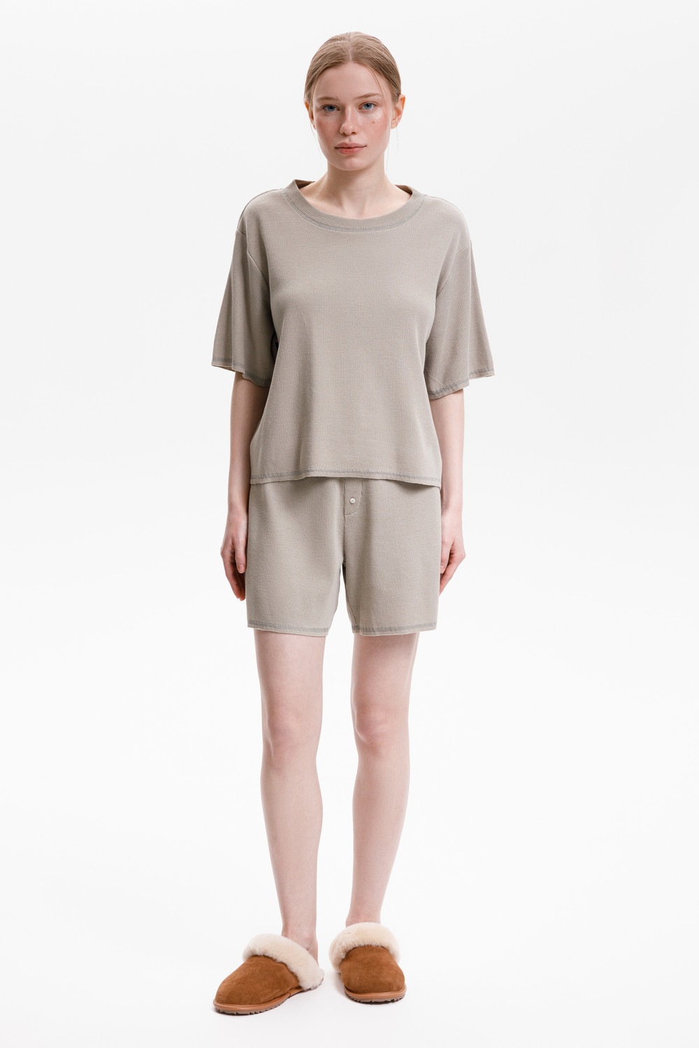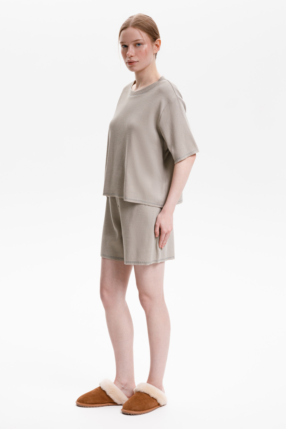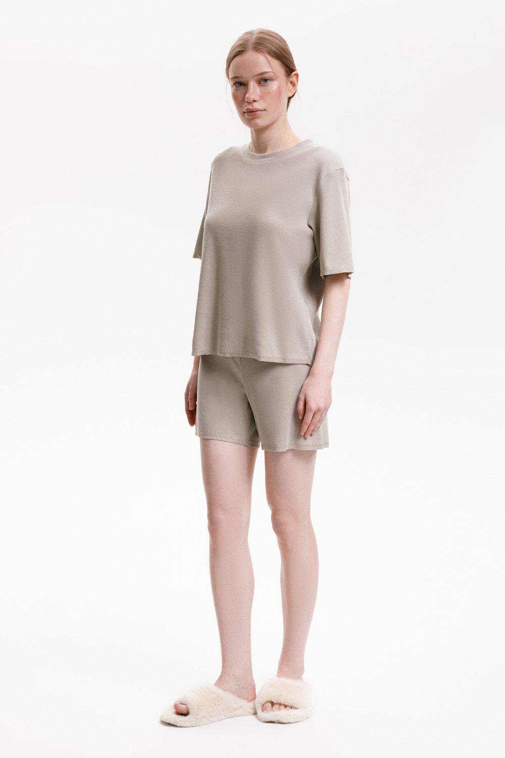 Комплект из объемного трикотажа с добавлением эластичных волокон. Свободный силуэт и мягкий пояс  обеспечат комфорт во время сна и отдыха.