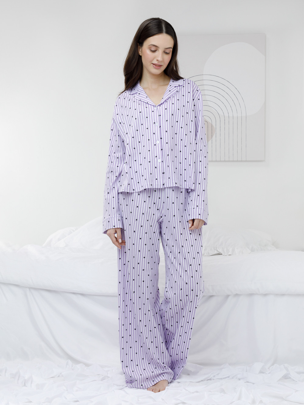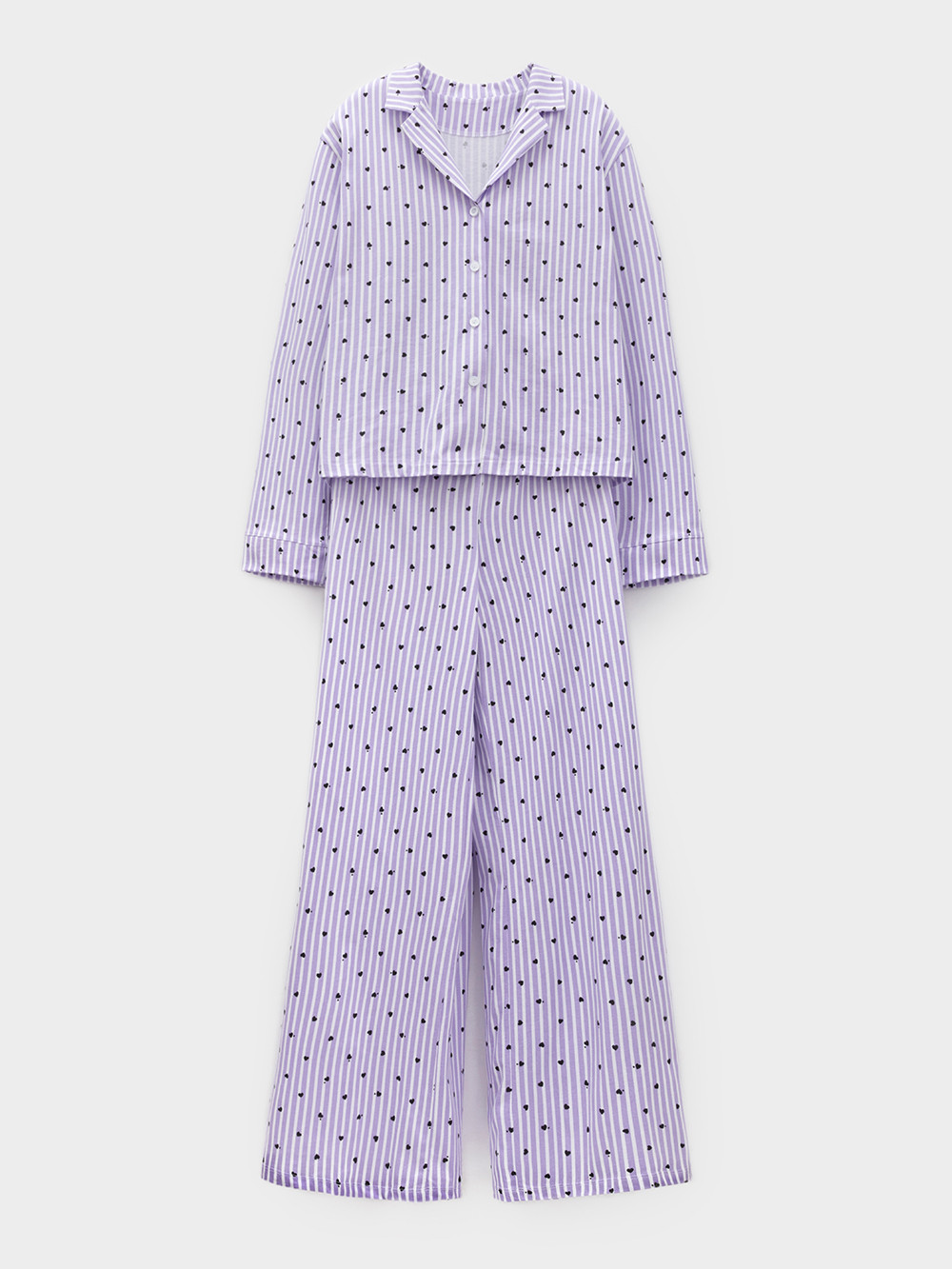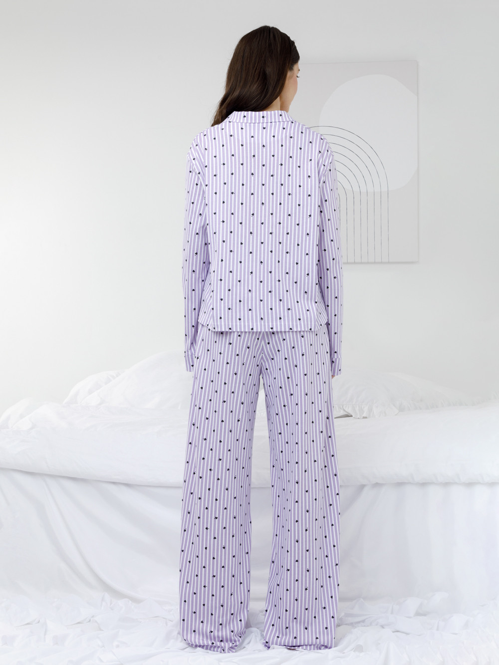 Трикотажная пижама из натурального хлопка для комфортного сна и отдыха. Рубашка на пуговицах с длинными рукавами и широкие брюки с мягкой эластичной резинкой в поясе. Гладкий материал приятен к телу, не теряет форму и позволяет коже дышать. Набивной рисунок выполнен из стойких текстильных гипоаллергенных красителей. Все трикотажные полотна производятся в соответствии с нормами швейцарского сертификата ЭкоТекс.