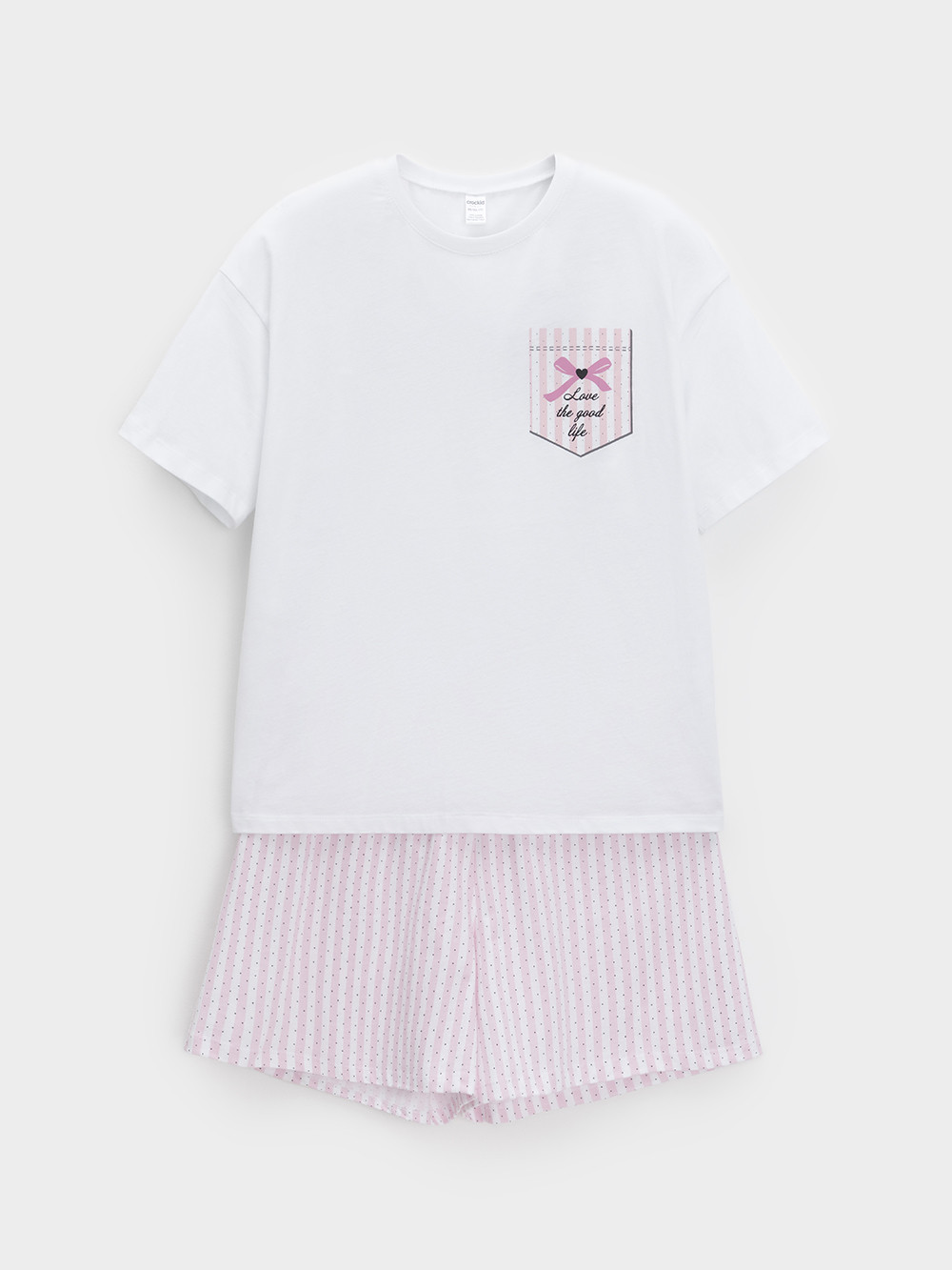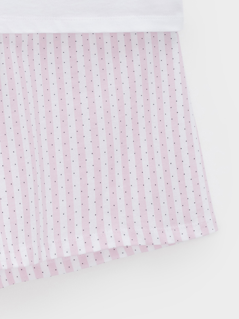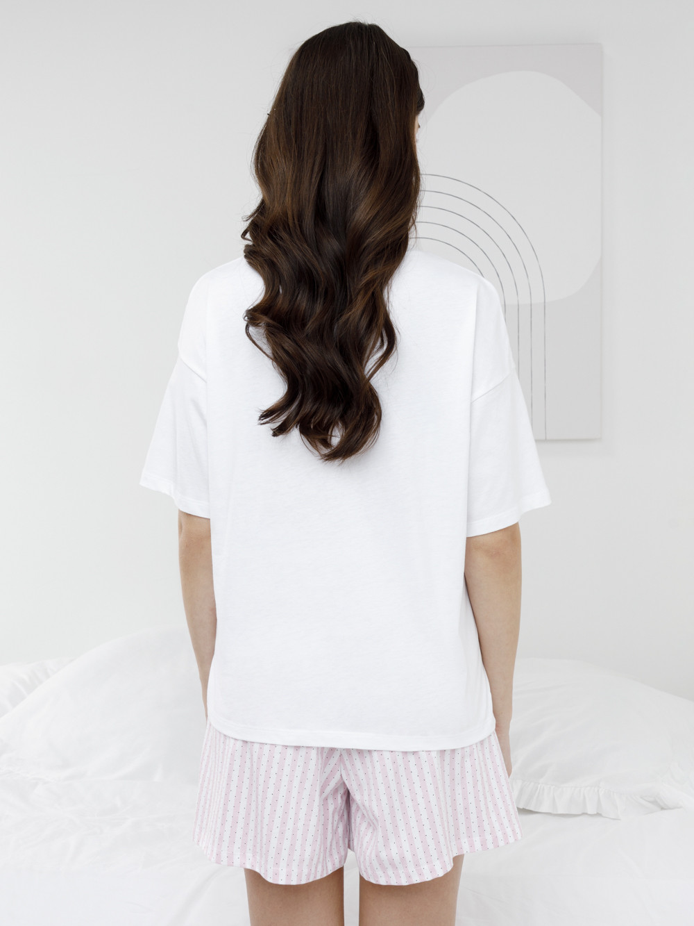 Трикотажная пижама из натурального хлопка для комфортного сна и отдыха. Свободная футболка с короткими спущенными рукавами и шорты с мягкой эластичной резинкой в поясе. Гладкий материал приятен к телу, не теряет форму и позволяет коже дышать. Оригинальный рисунок выполнен из стойких текстильных гипоаллергенных красителей. Все трикотажные полотна производятся в соответствии с нормами швейцарского сертификата ЭкоТекс.