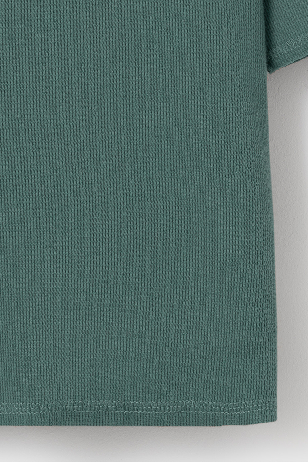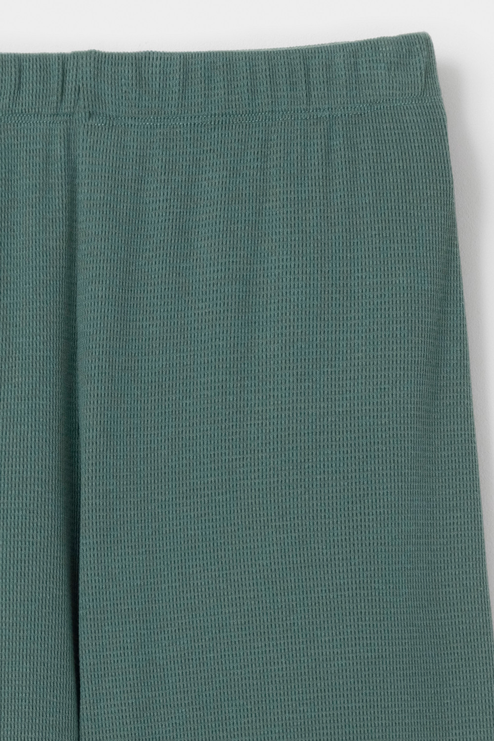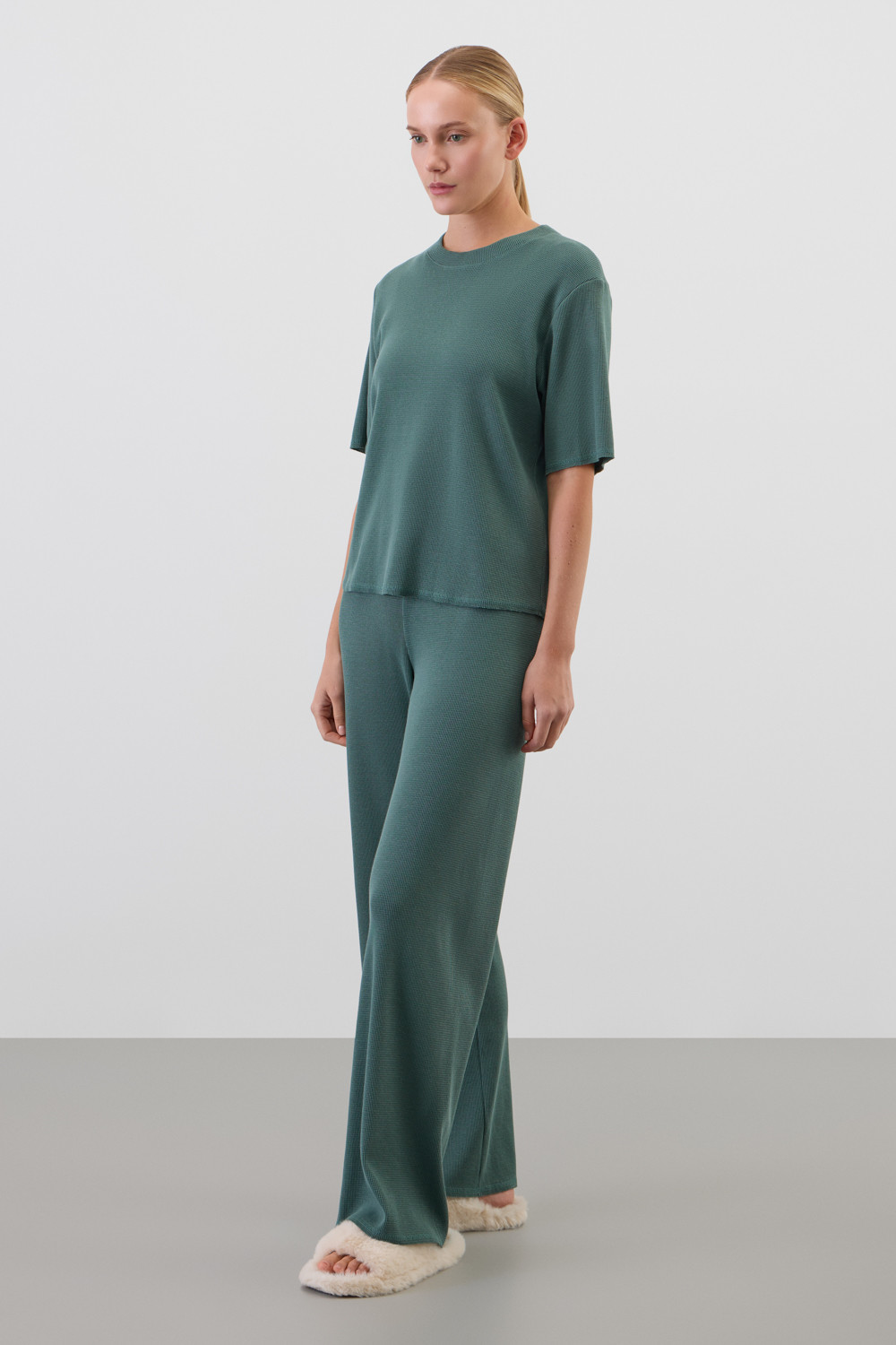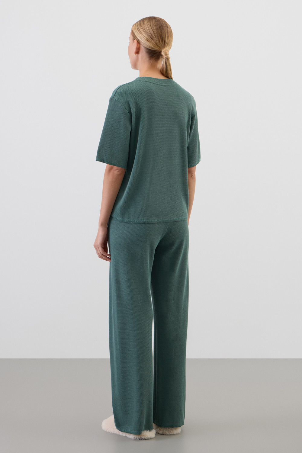 Комплект из объемного трикотажа с добавлением эластичных волокон. Свободный силуэт и мягкий пояс брюк обеспечат комфорт во время сна и отдыха.