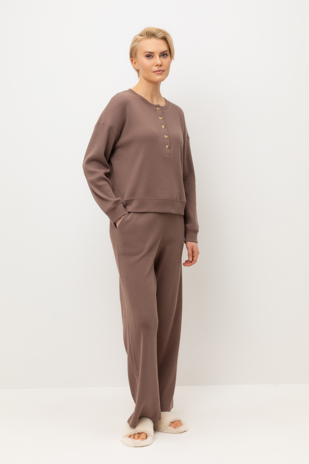 Комплект из объемного трикотажа с добавлением эластичных волокон. Свободный крой обеспечивает легкость и свободу движений.