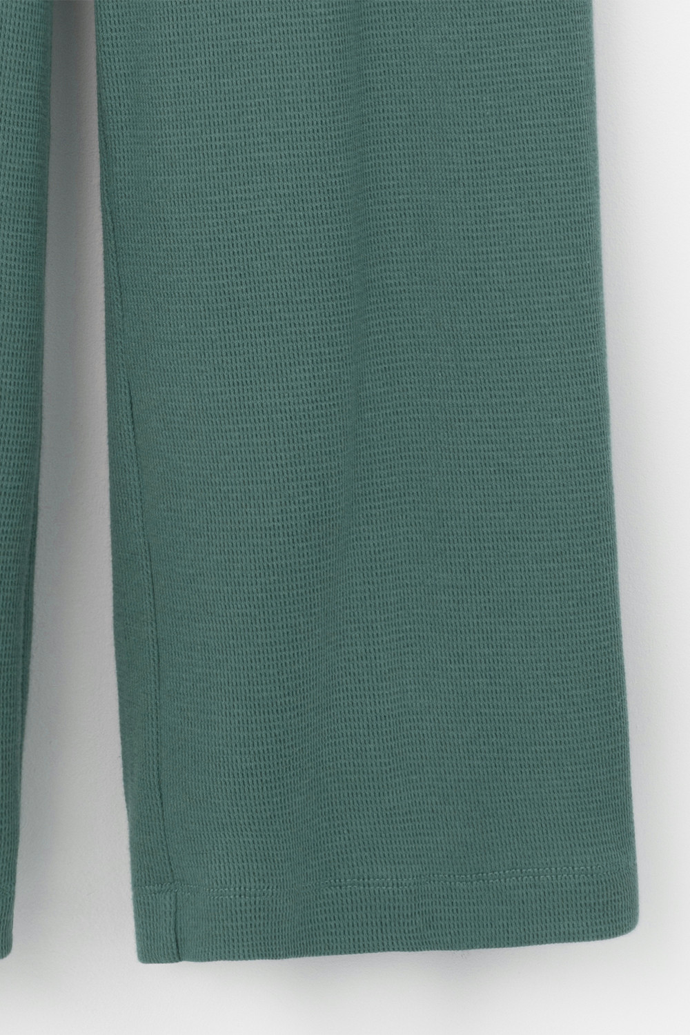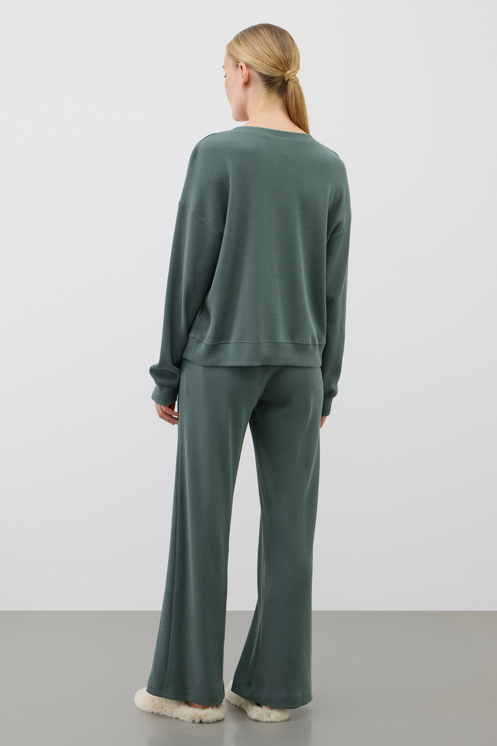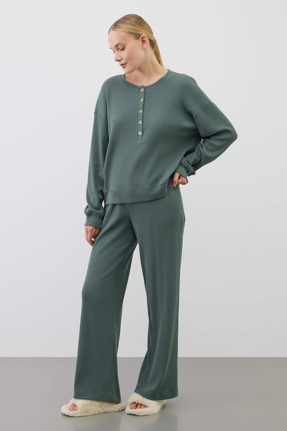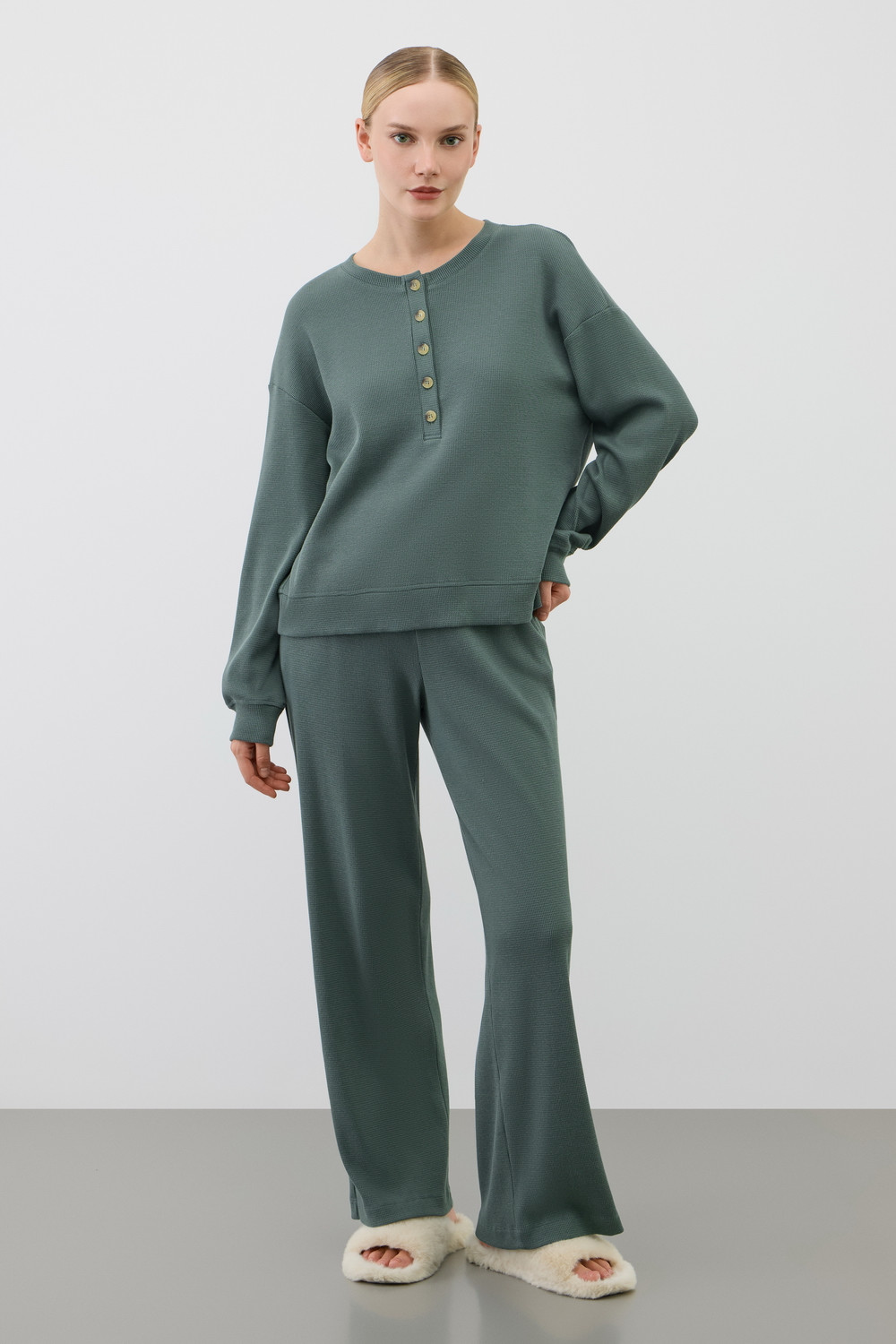 Комплект из объемного трикотажа с добавлением эластичных волокон. Свободный крой обеспечивает легкость и свободу движений.