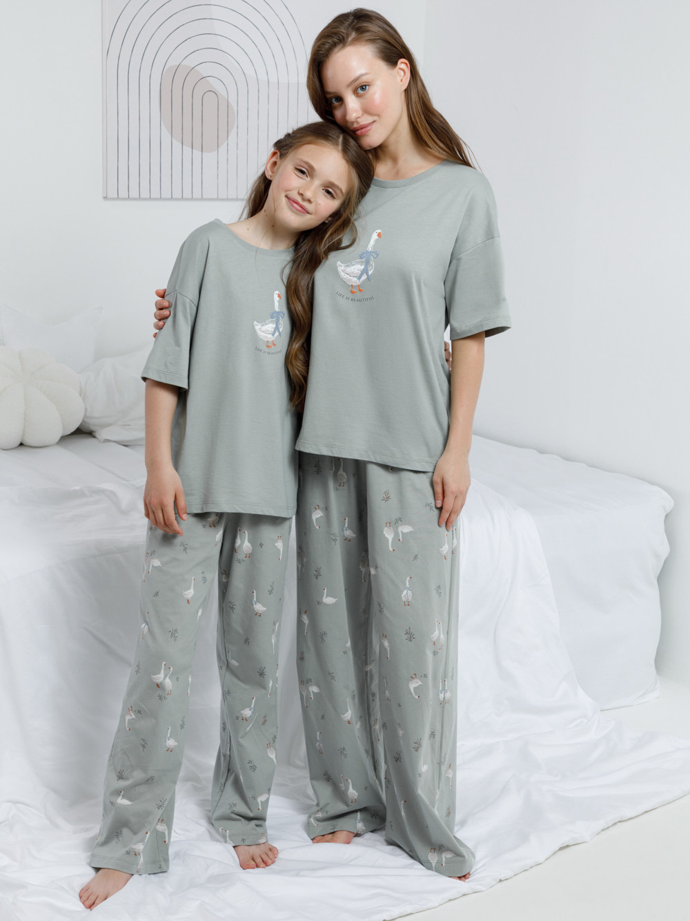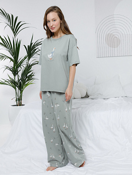 Комплект для комфортного сна и отдыха из гладкого трикотажного полотна. Футболка с короткими спущенными рукавами и прямые брюки с мягкой эластичной резинкой в поясе, которые удобно садятся по фигуре. Лёгкий материал приятен к телу, не теряет форму и позволяет коже дышать. Все трикотажные полотна производятся в соответствии с нормами швейцарского сертификата ЭкоТекс.