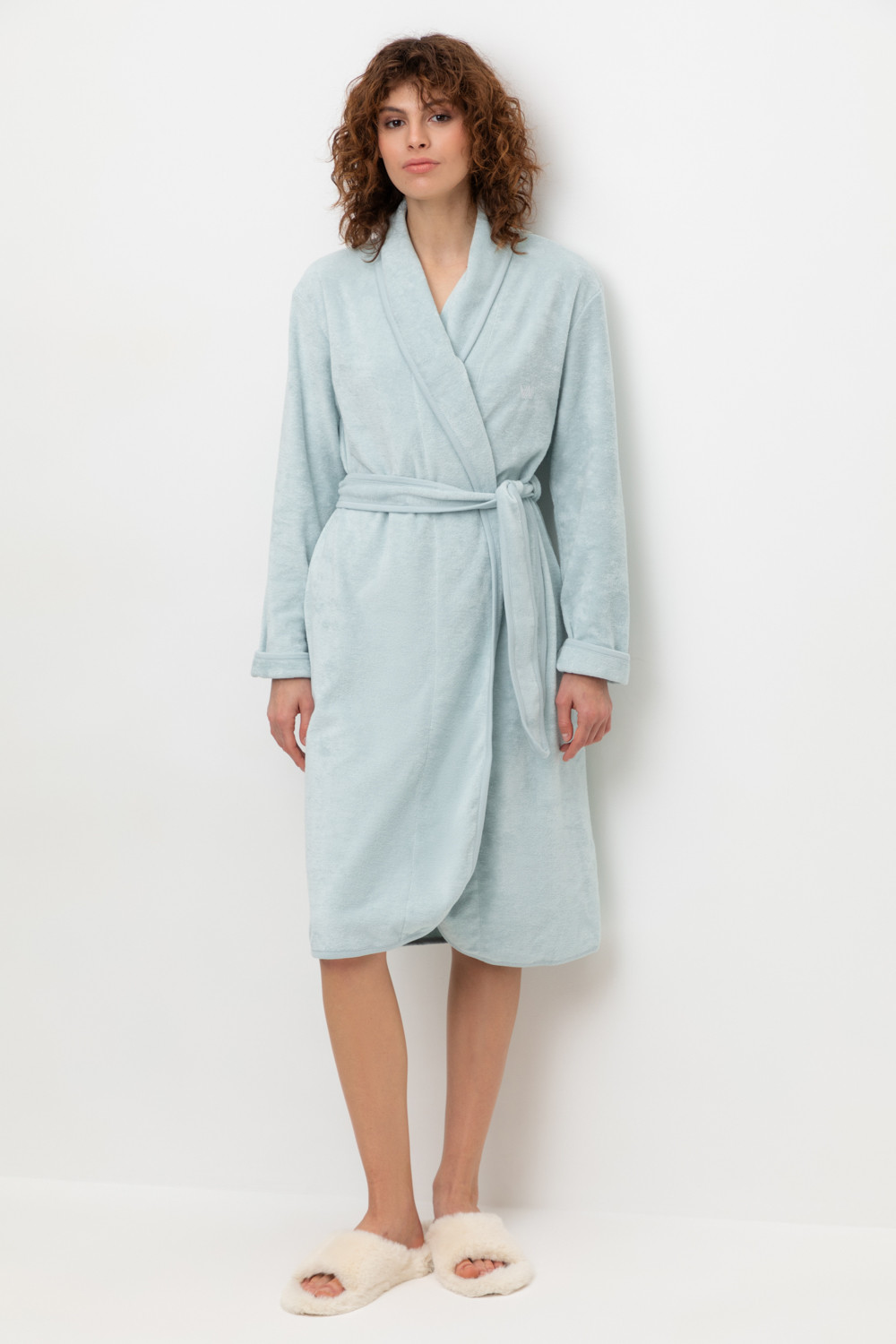 Уютный легкий махровый халат на запах с длинными рукавами. В боковых швах два удобных кармана. На груди вышивка. С помощью пояса можно регулировать посадку и силуэт. Материал приятен к телу и позволяет коже дышать.