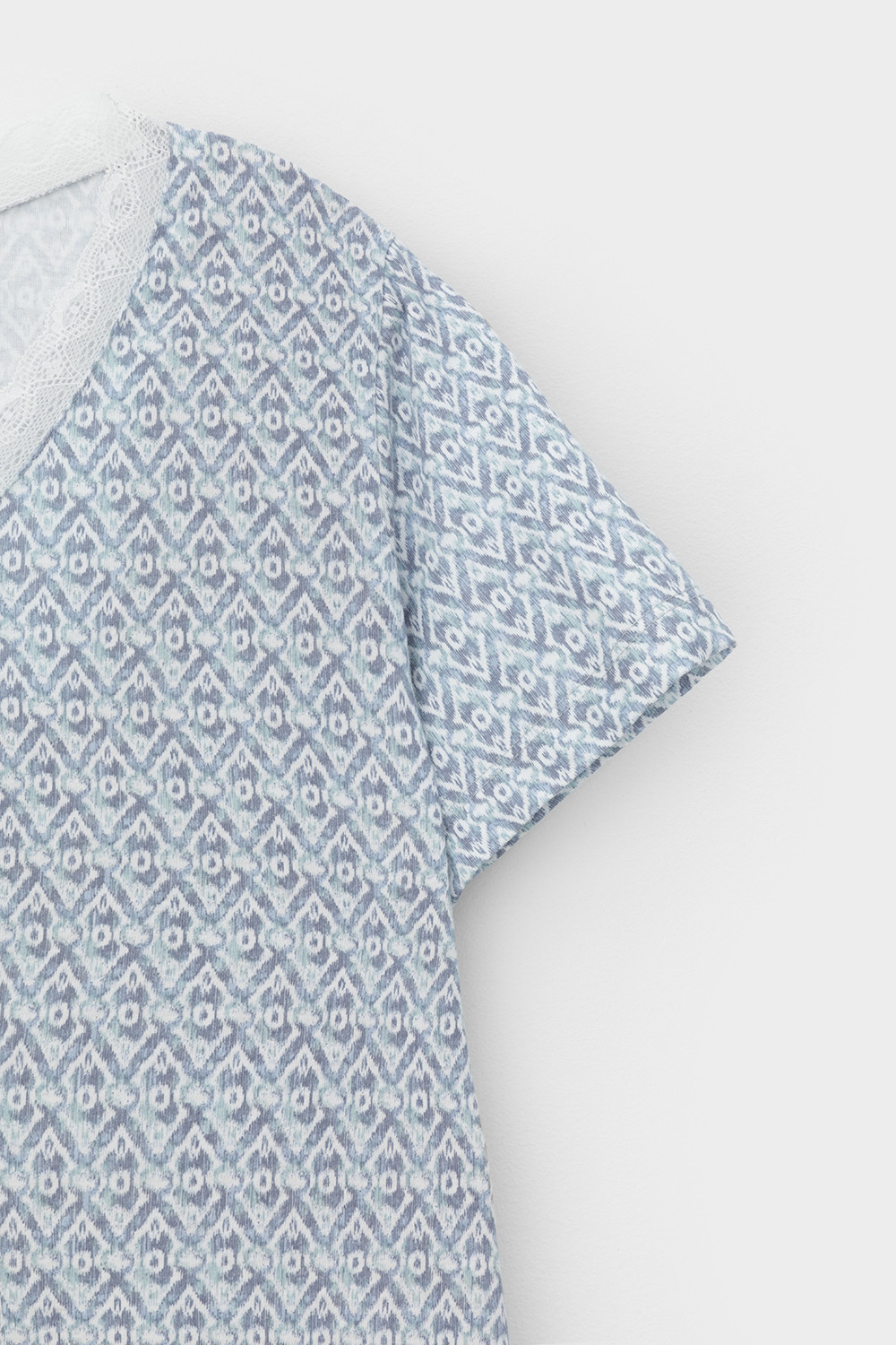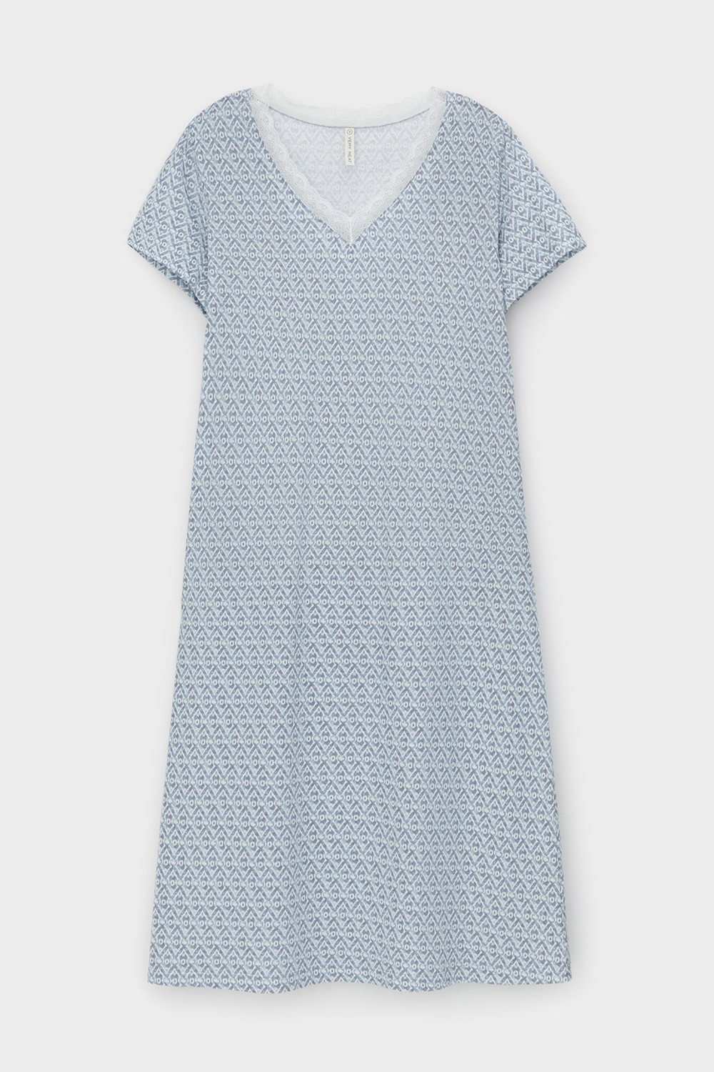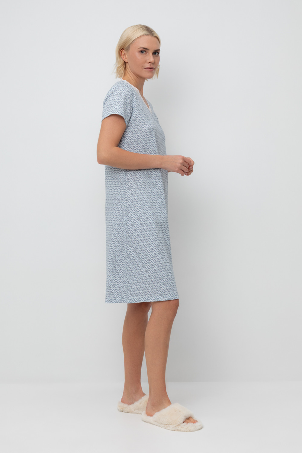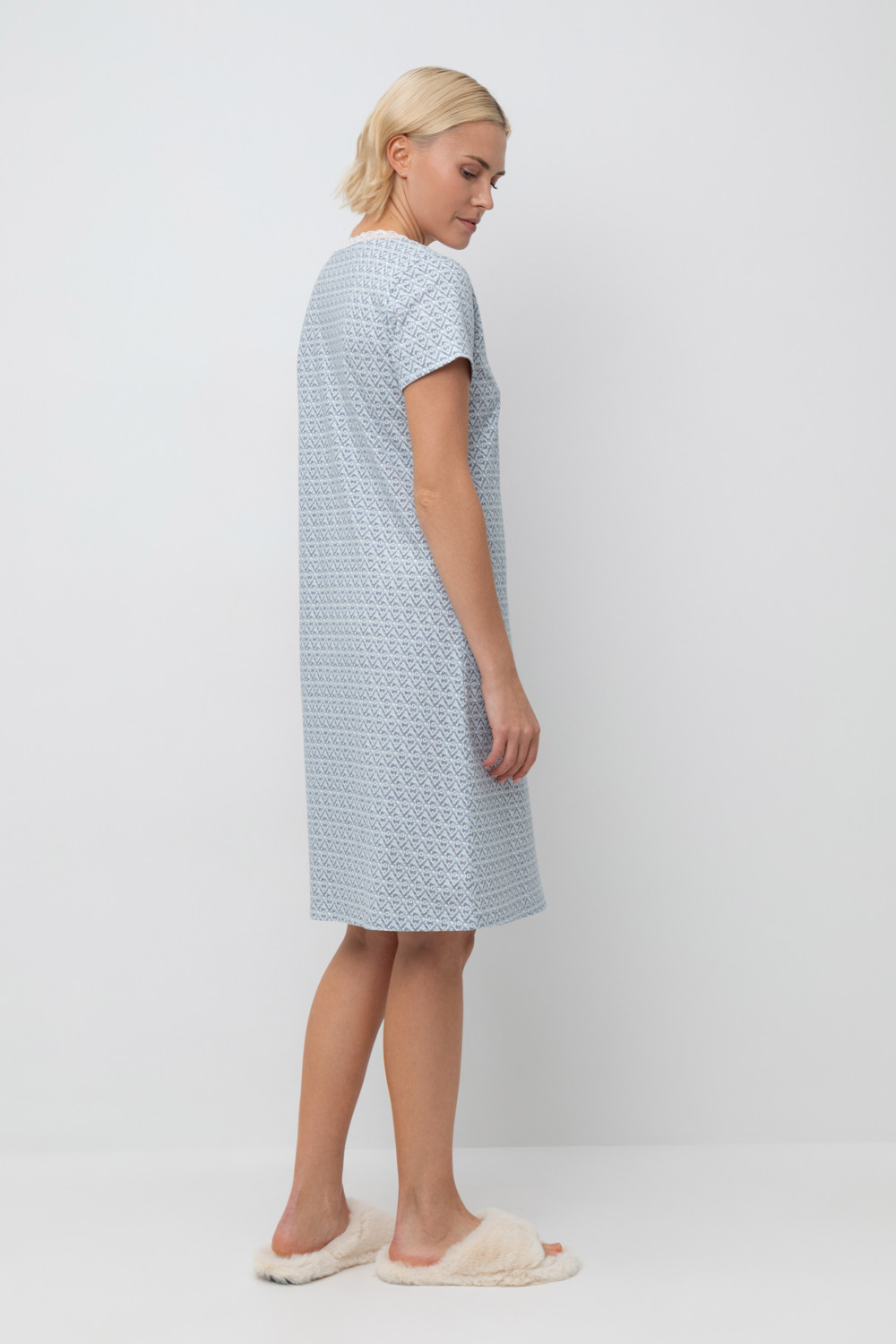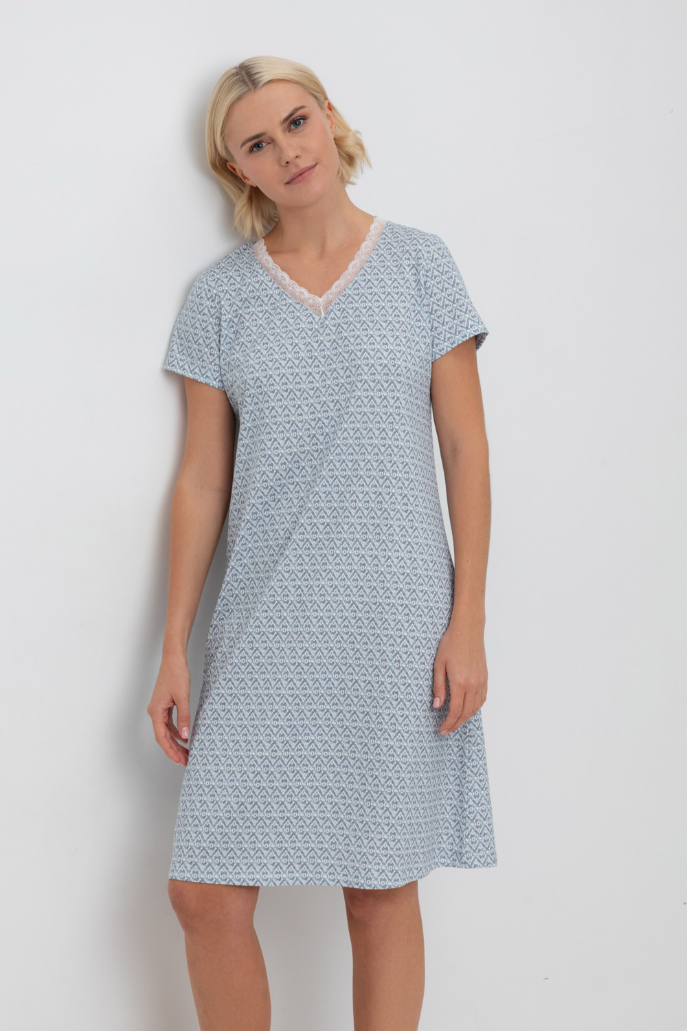 Комфортная сорочка с коротким рукавом выполнена из  высококачественного гребенного хлопка.  Эластичное кружево нежно обрамляет зону декольте, а свободный крой добавляет комфорта во время сна.