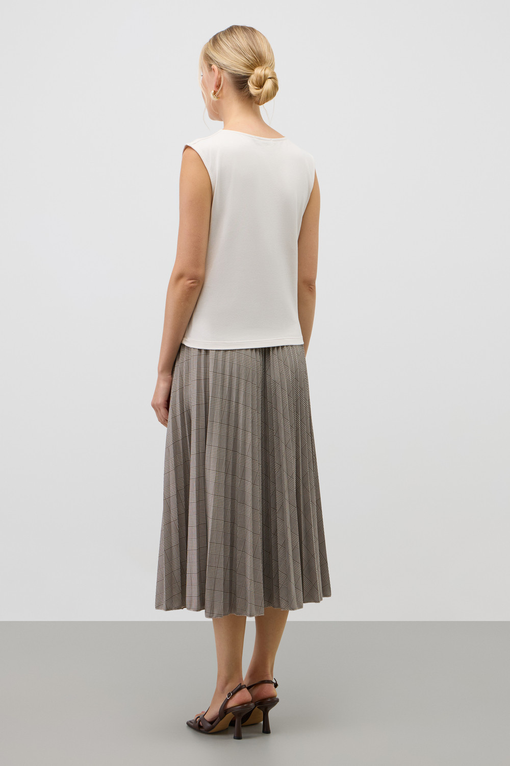 Юбка гофре, выполненная из высококачественного трикотажного полотна DOUBLE FACE, отличается особой легкостью и шелковистой текстурой благодаря силиконовой обработке ткани. Она элегантно струится, создавая ощущение легкости и воздушности. Мелкие складки визуально удлиняют силуэт, подчеркивая женственность.