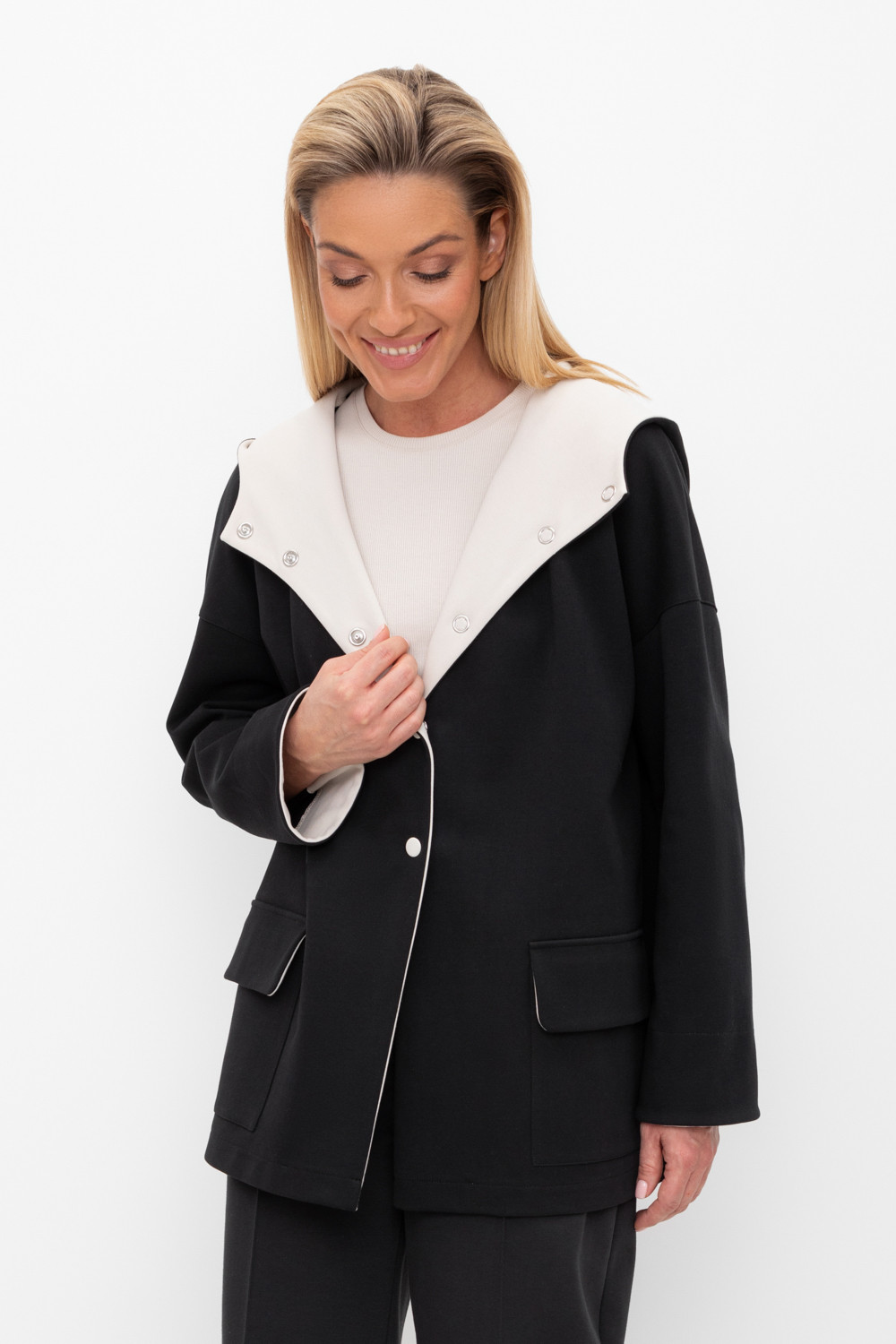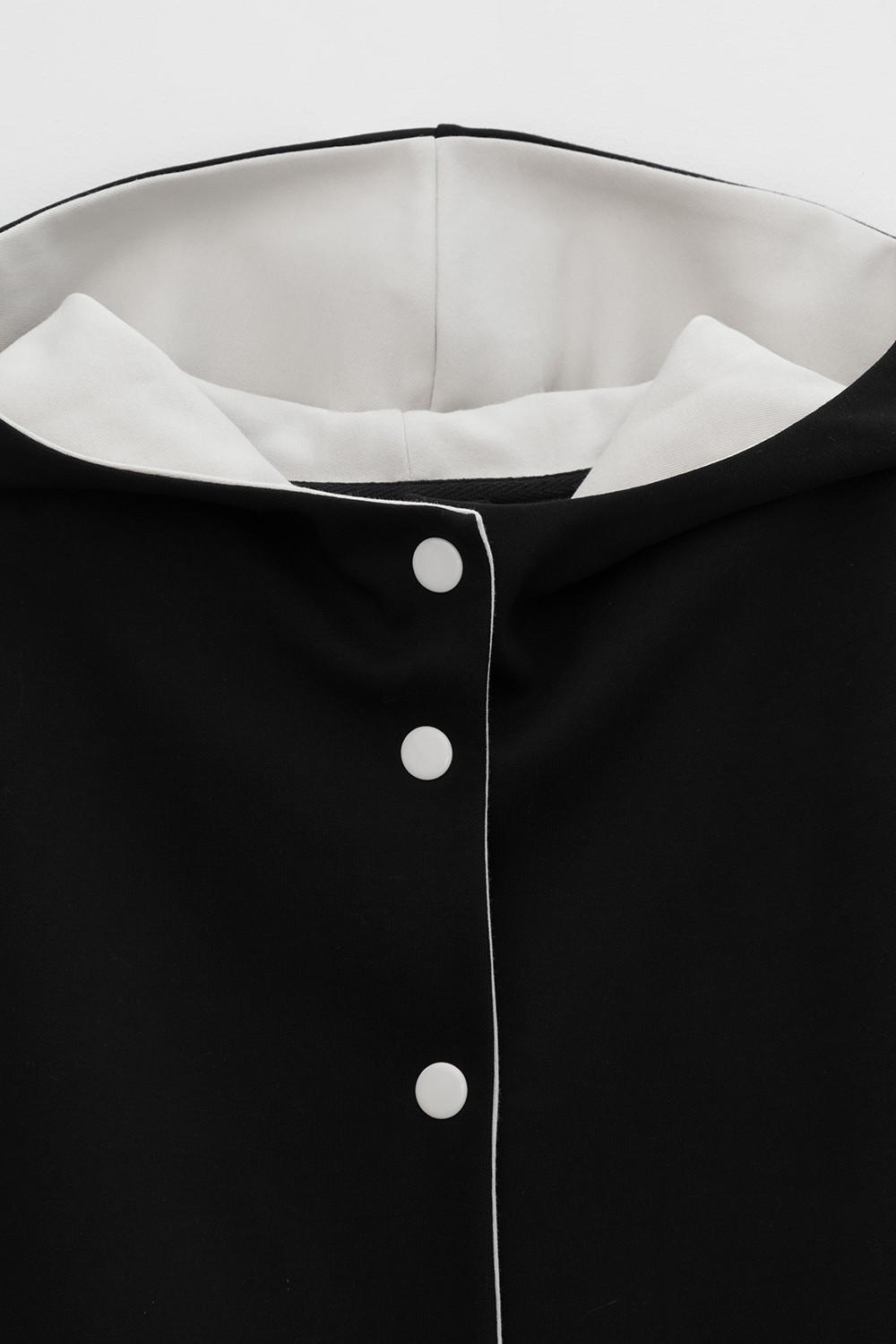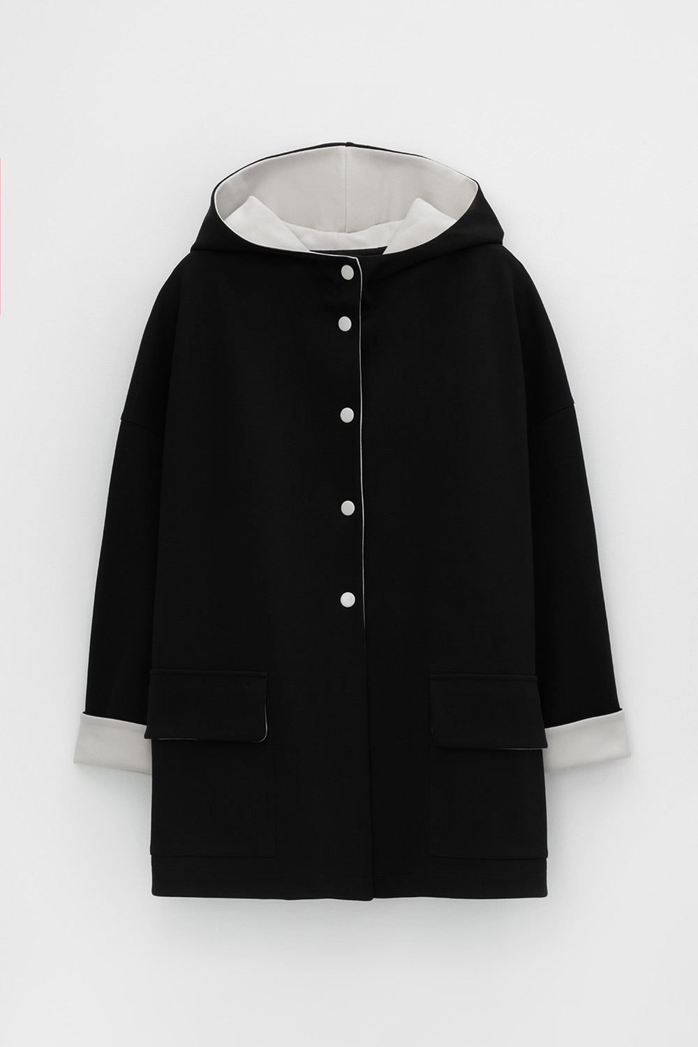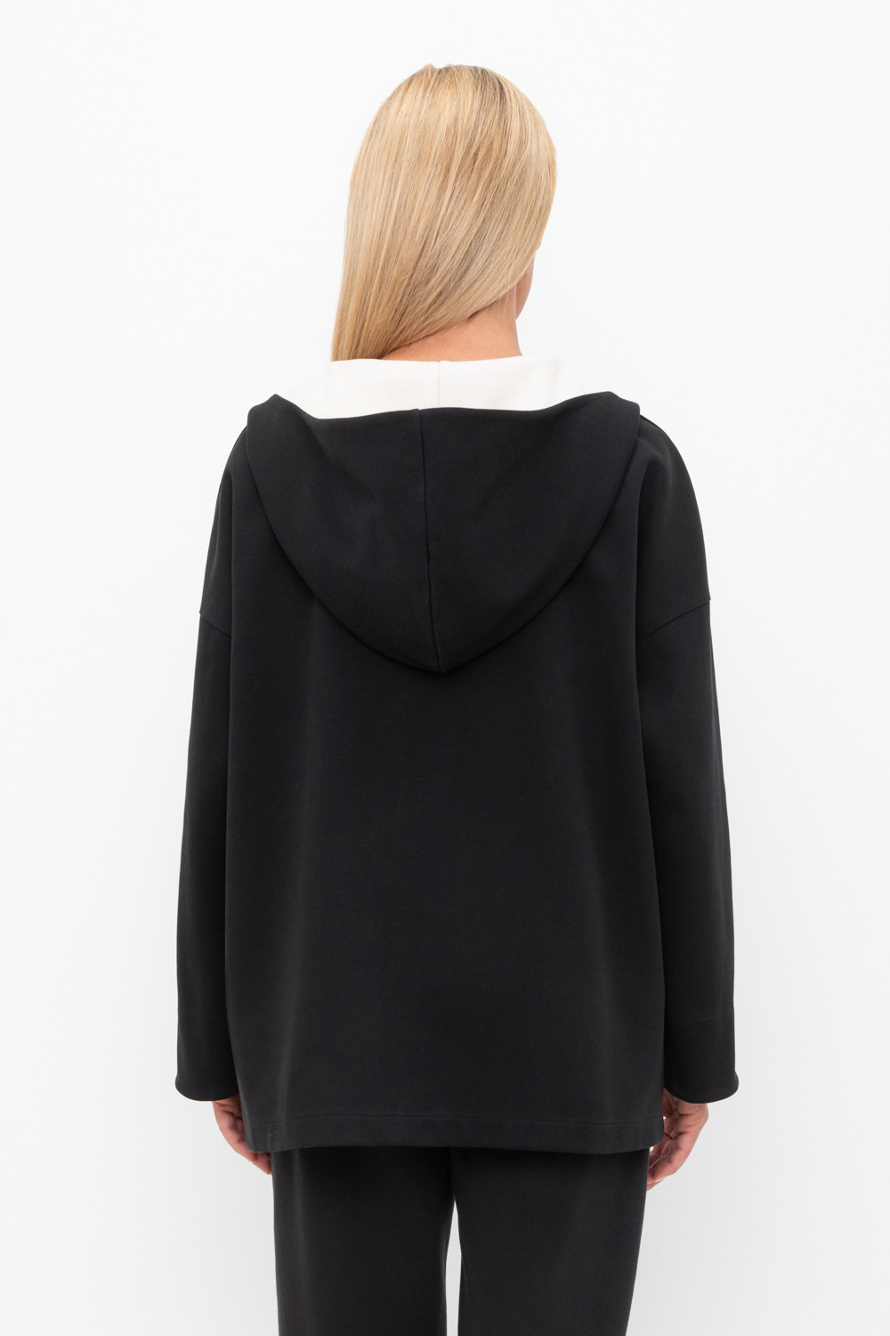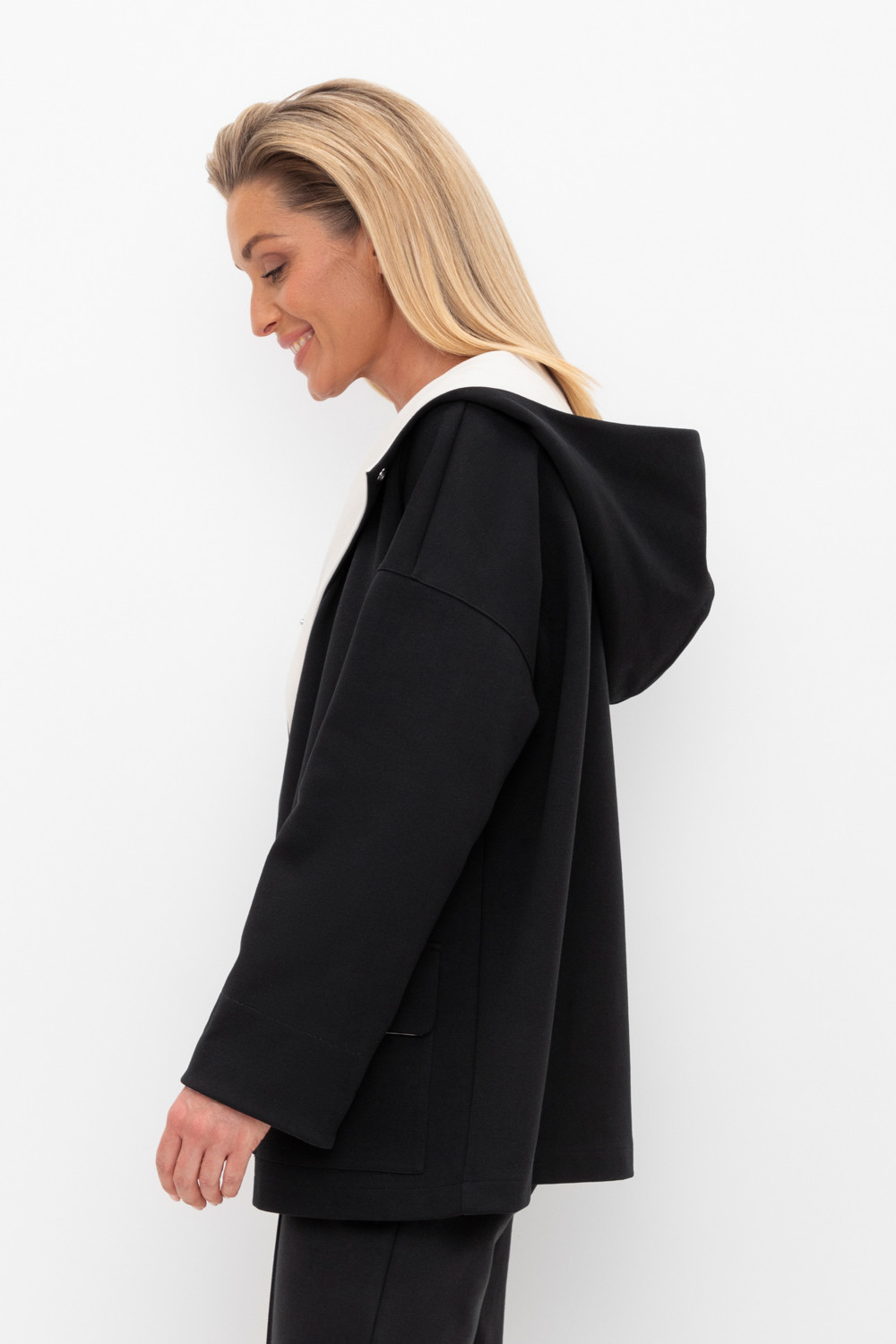 Женская куртка с капюшоном из плотного гладкого трикотажа интерлок со спандексом. Свободная модель с накладными карманами.  Гладкий и плотный материал на основе хлопка сохраняет форму.