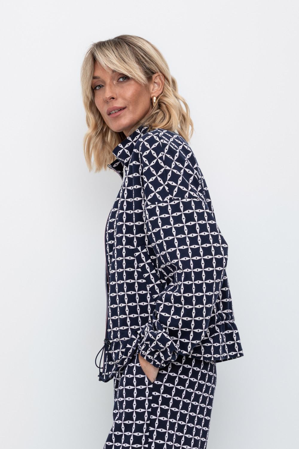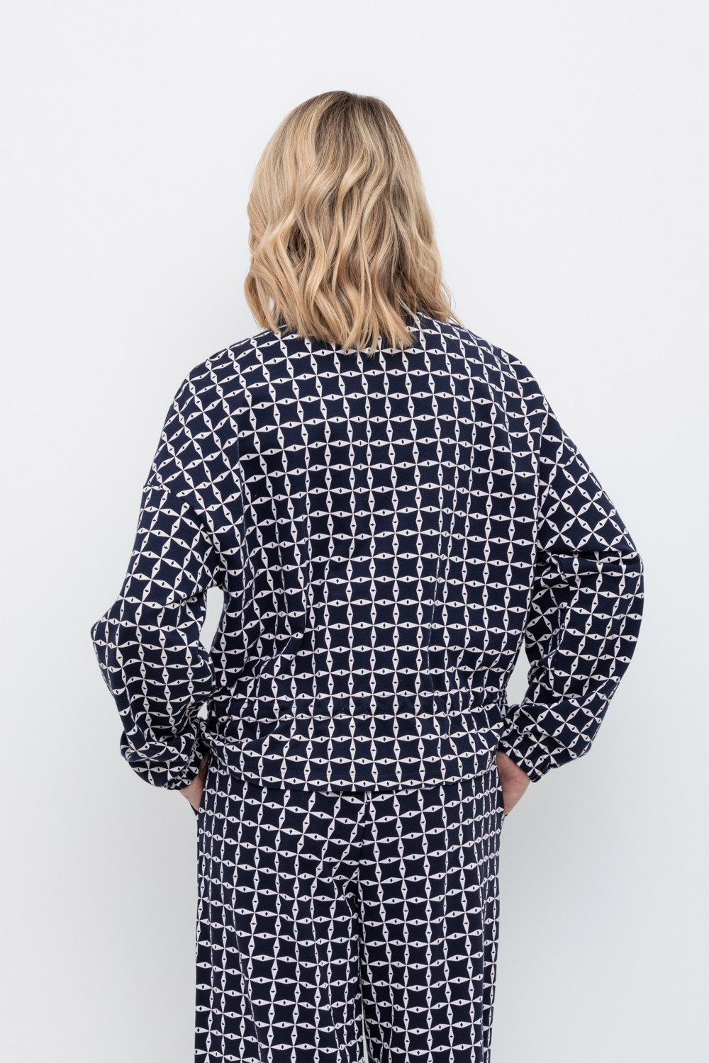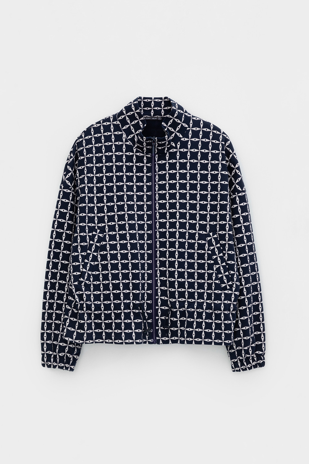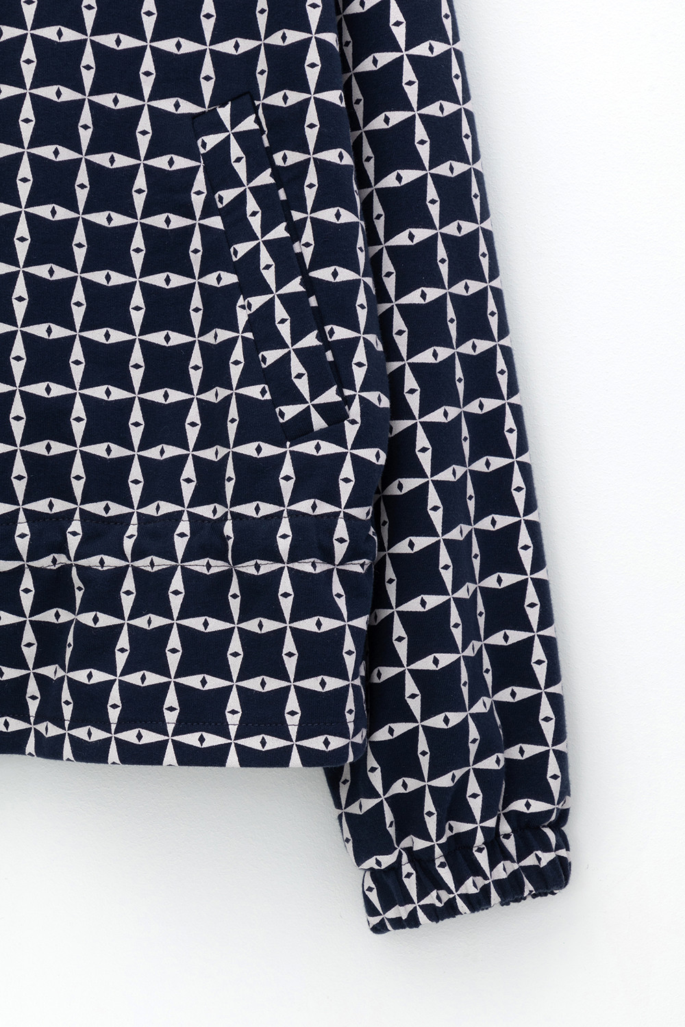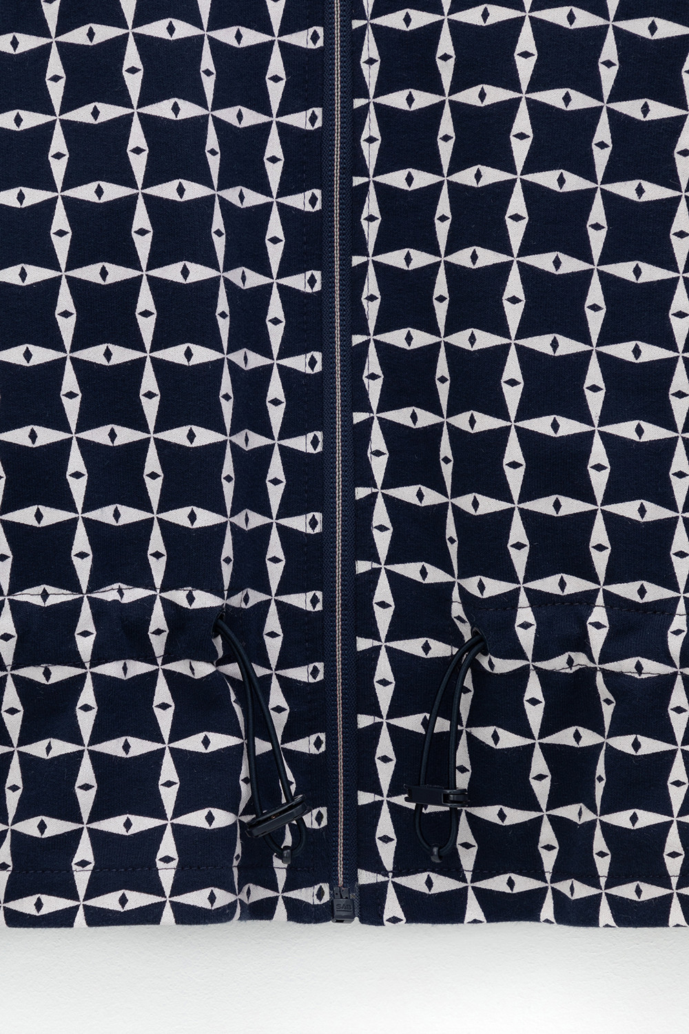 Укороченная трикотажная куртка на молнии с карманами и кулиской по низу. Произведена из мягкого набивного трикотажного футера. Спущенные рукава и манжеты на резинке добавляют объем.