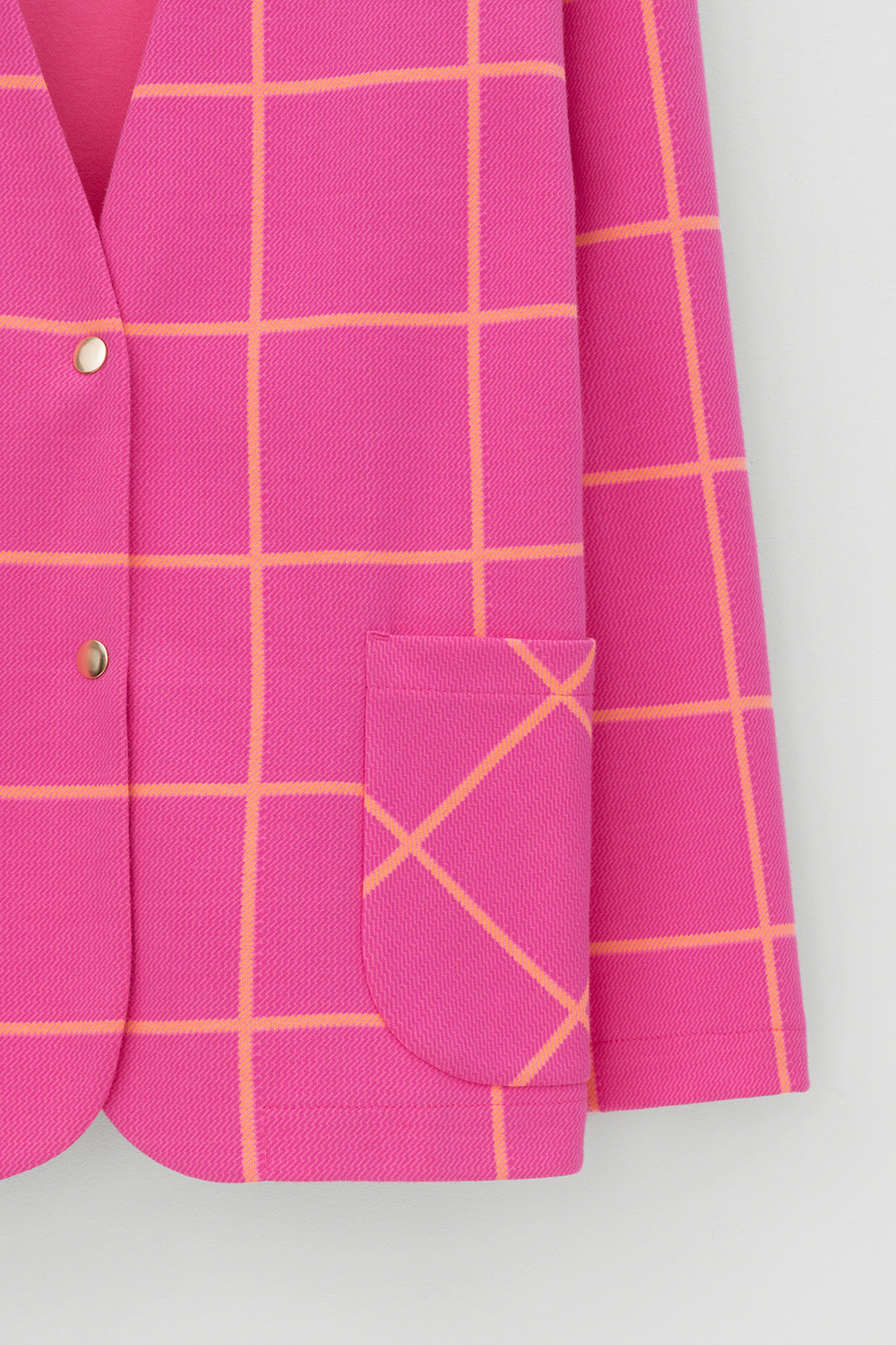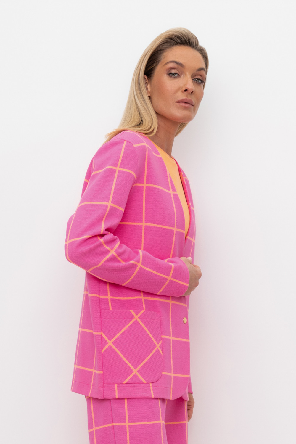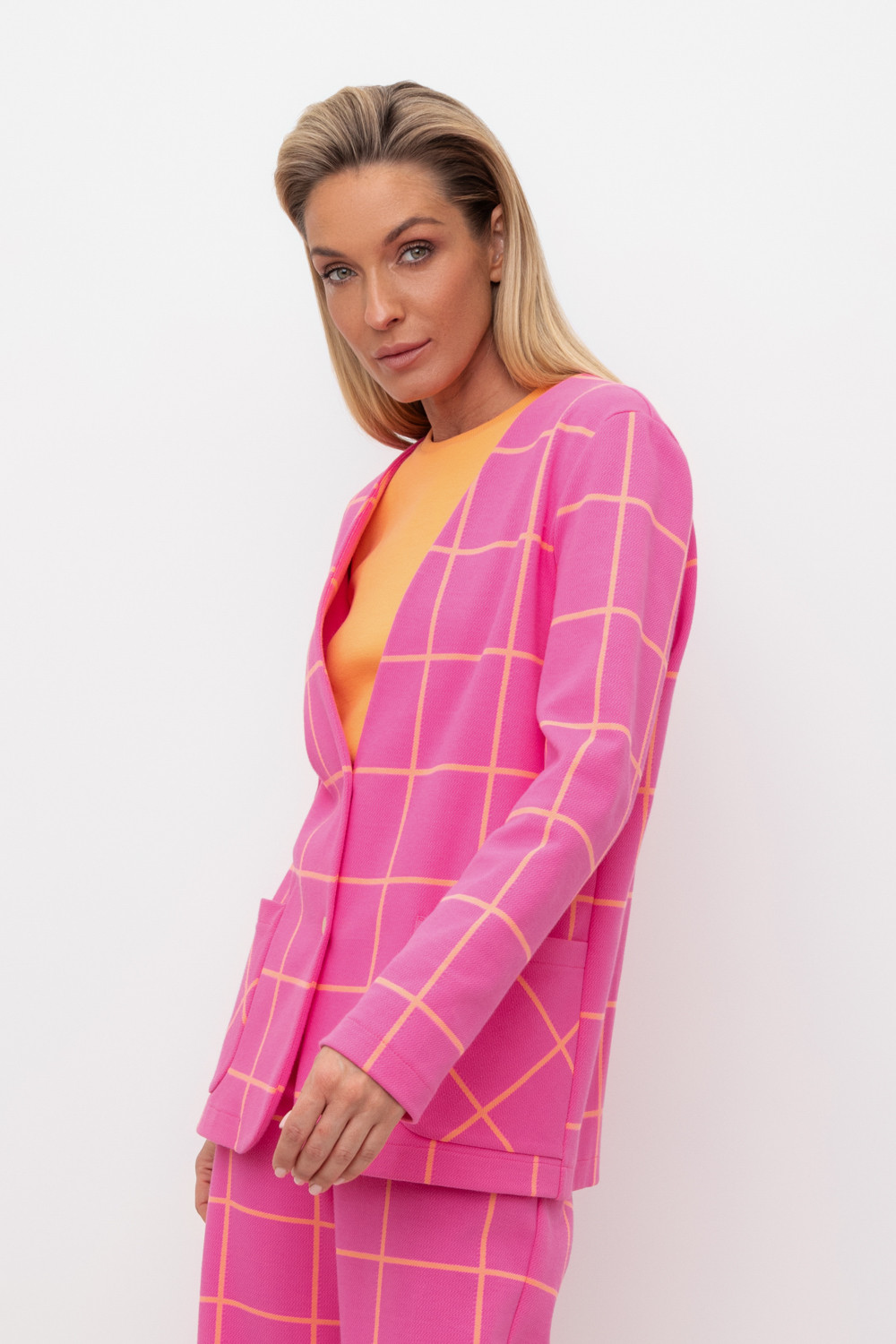 Однобортный, прямой немного удлиненный жакет с застежкой на кнопки и двумя накладными карманами из плотного набивного гладкого трикотажа интерлок.                                                                                                                                                                                                                  Все трикотажные изделия производятся в соответствии с нормами Швейцарского сертификата ЭкоТекс. Сделано в России                                                                                                                                                                                           - 80% хлопок, 20% ПЭ
