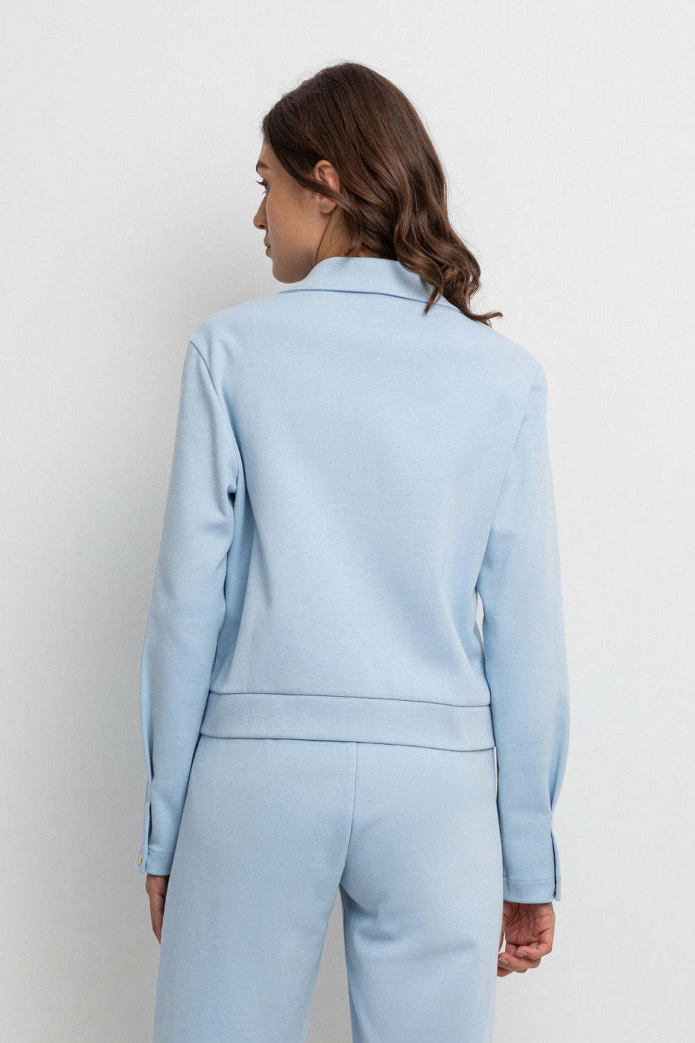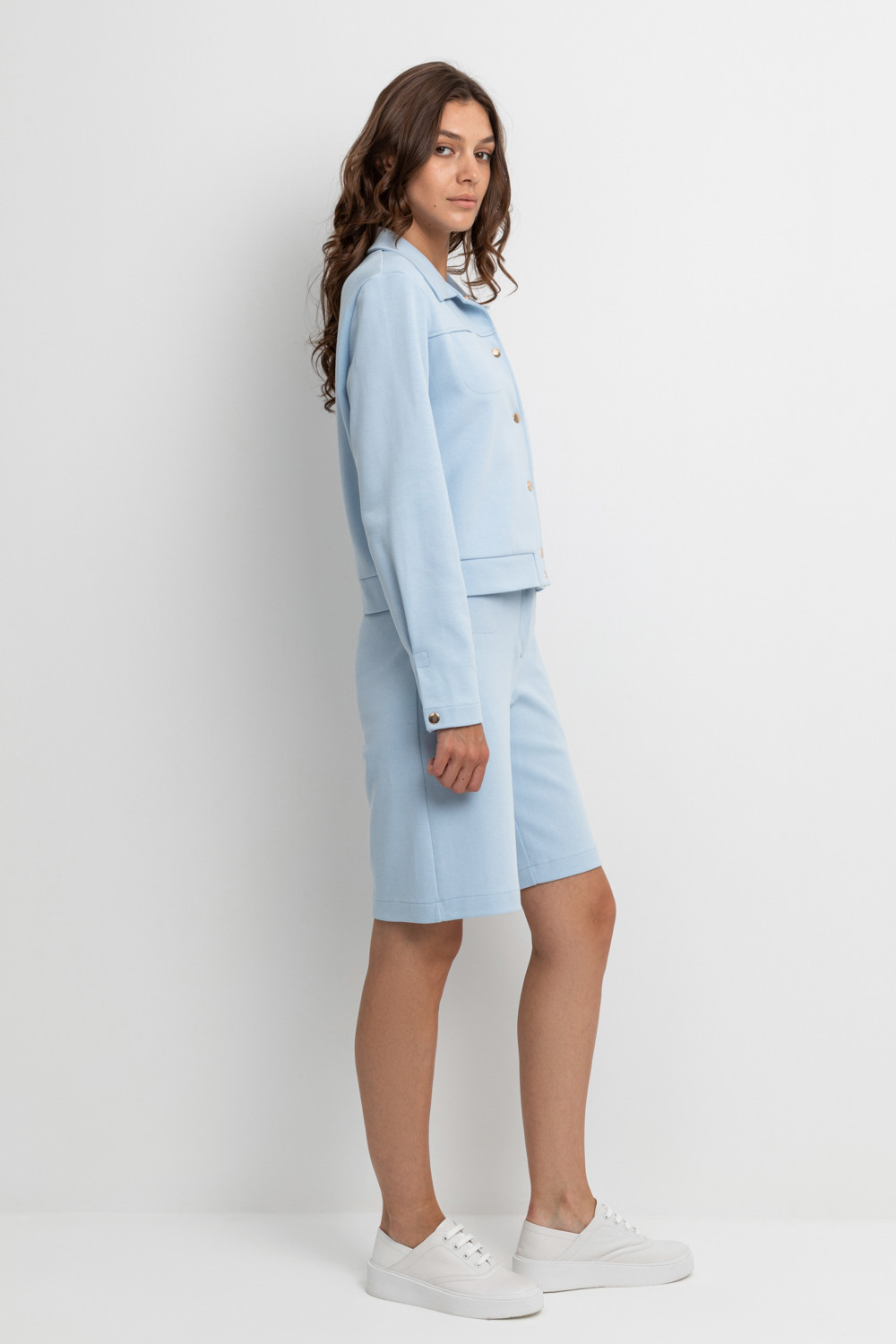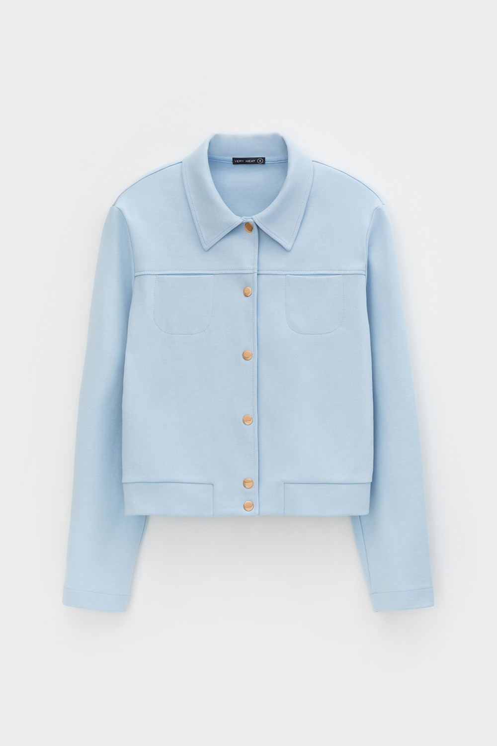 Укороченная куртка на кнопках с карманами из плотного гладкого трикотажа интерлок.