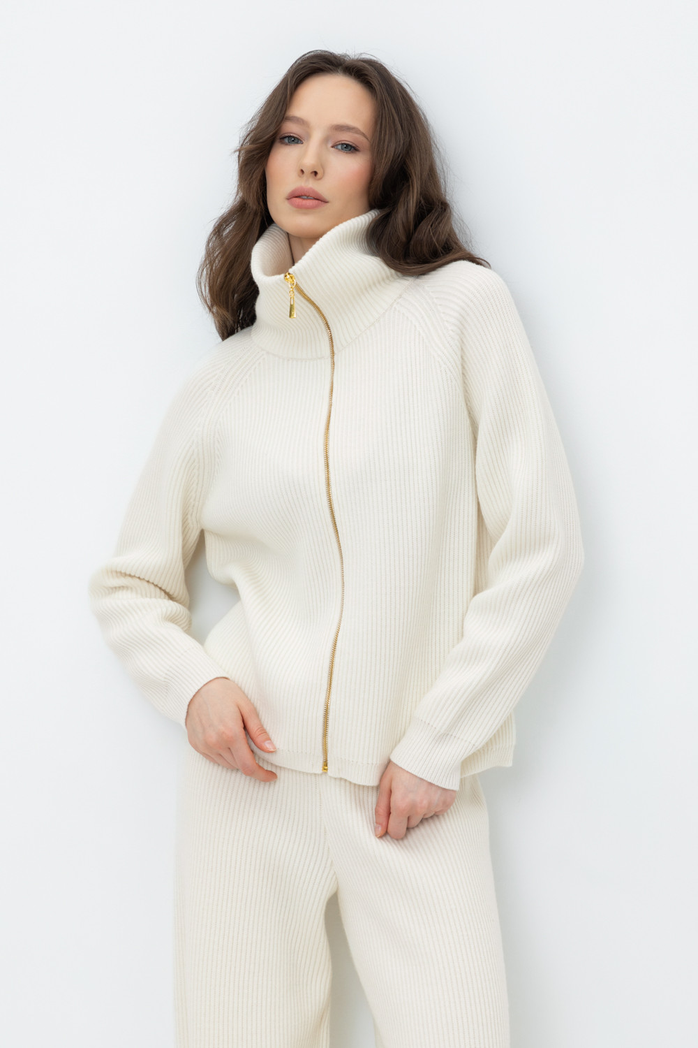 Кардиган вязаный на молнии. Изготовлен из мягкой полушерстяной пряжи. Шерсть мериноса в составе сохраняет тепло, акрил делает изделие мягким.