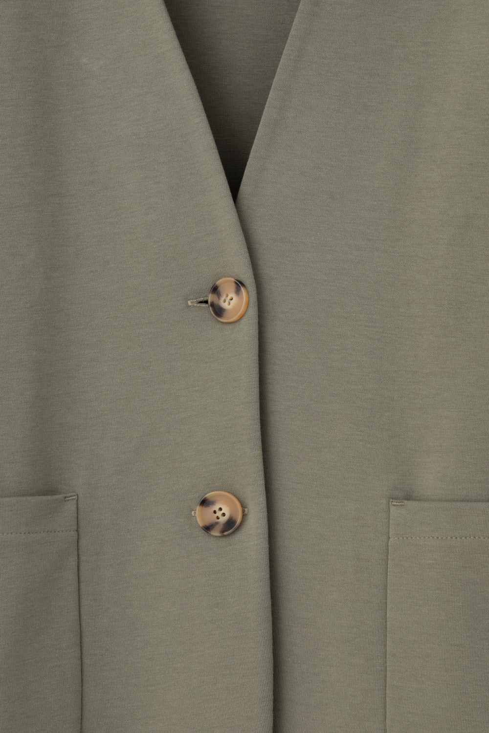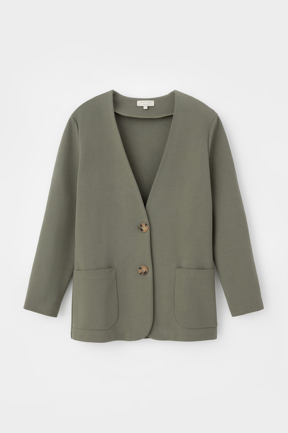 Однобортный, прямой немного удлиненный жакет с застежкой на пуговицы и двумя накладными карманами из плотного гладкого трикотажа интерлок.
