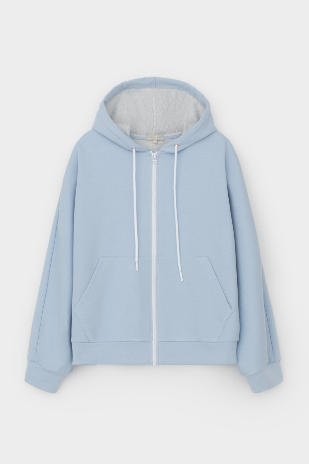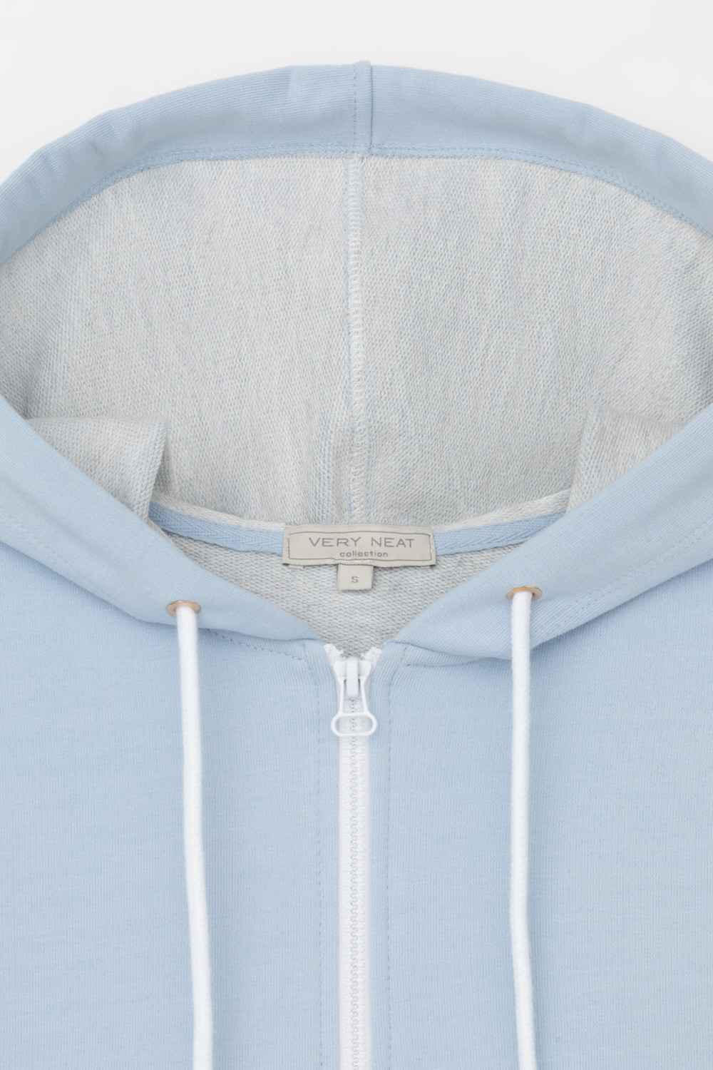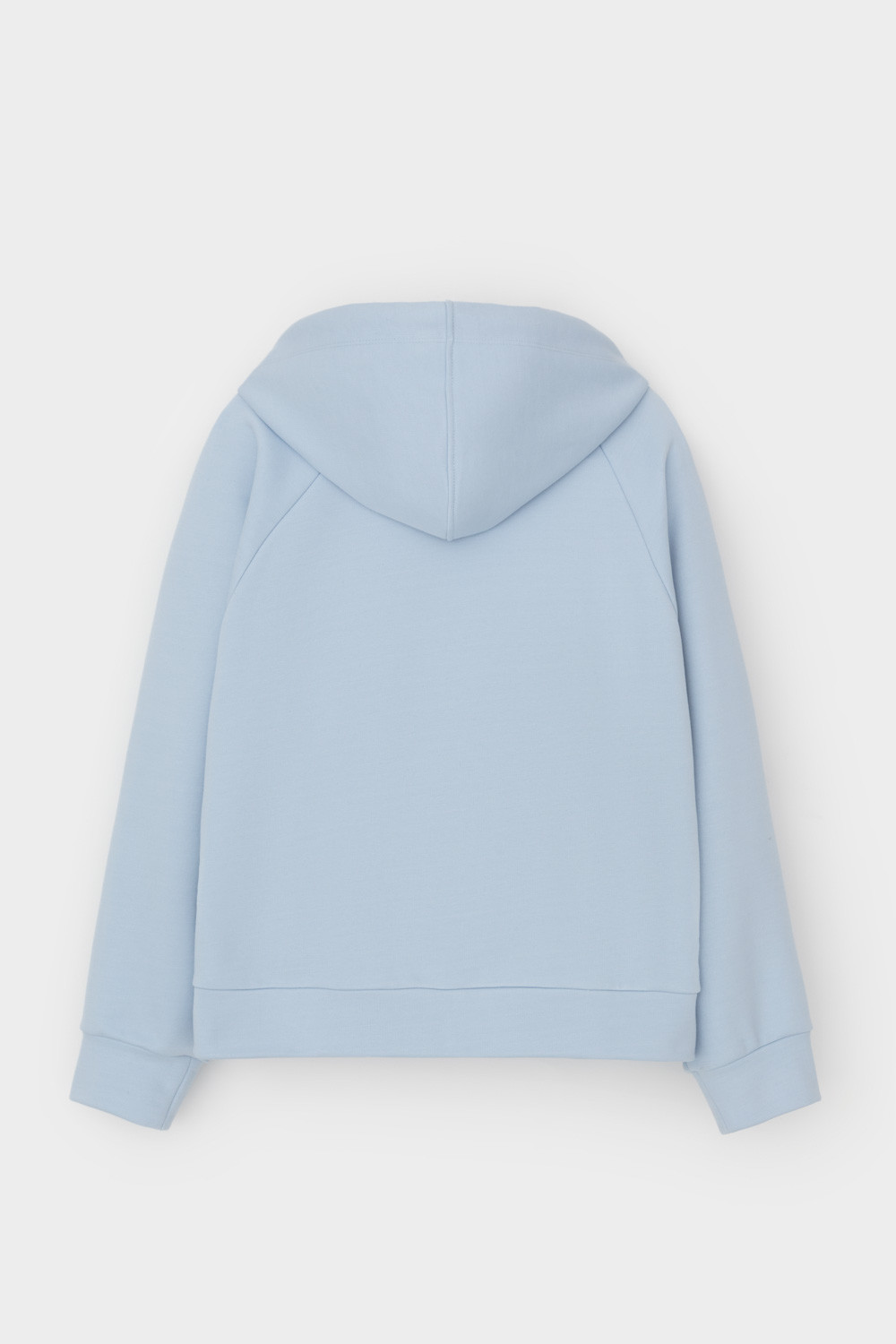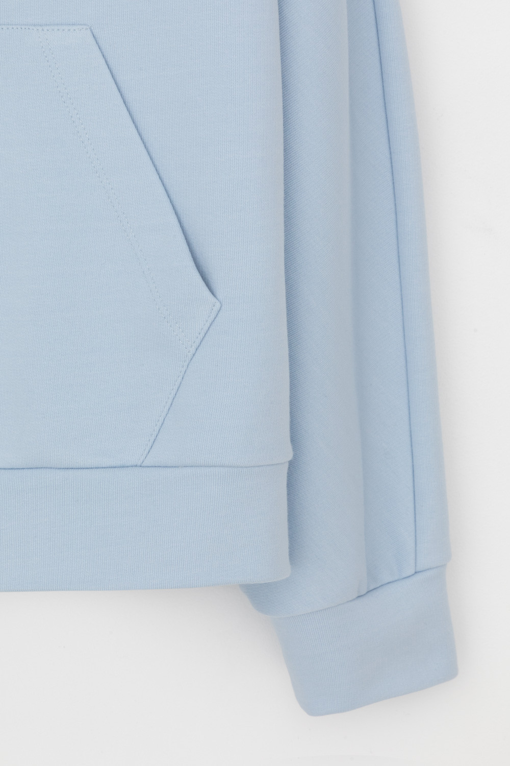 Объемная толстовка из двухцветного трикотажного футера. Внутренняя сторона изделия представлена в натуральном цвете хлопка, внешняя в нежно-голубом. За счет использования крашенной пряжи данный вид полотна прошел минимальную обработку, что придало изделию мягкость и шелковистость.