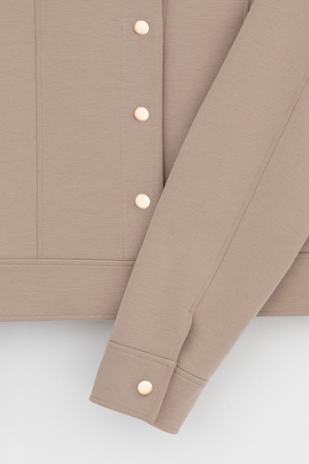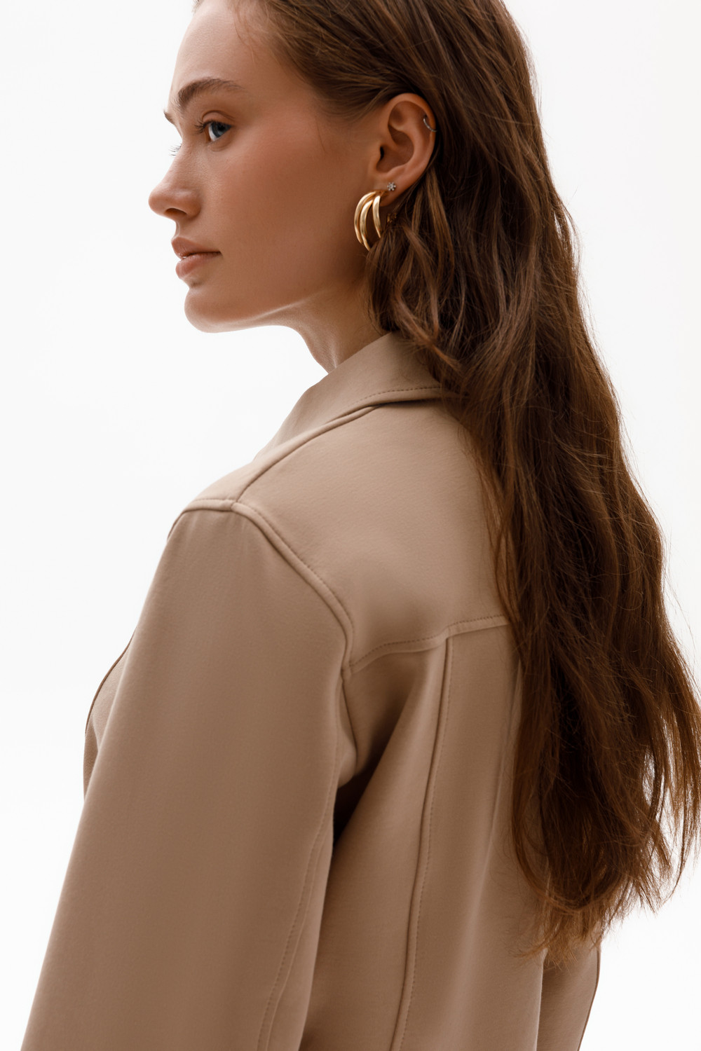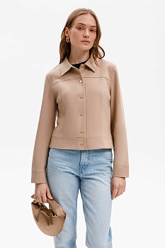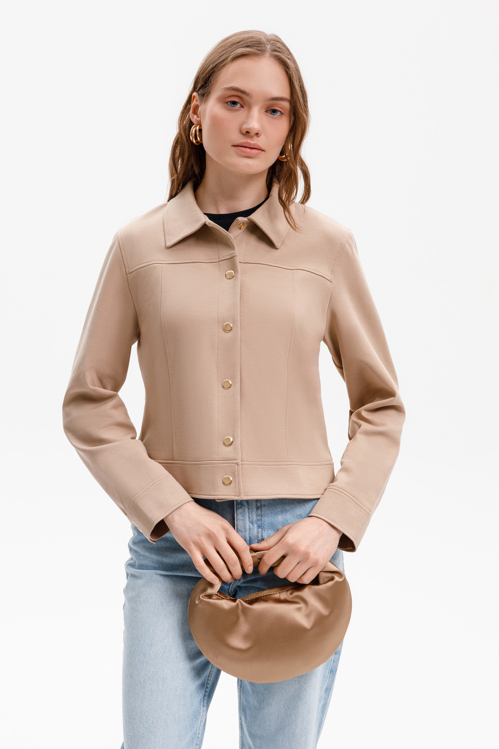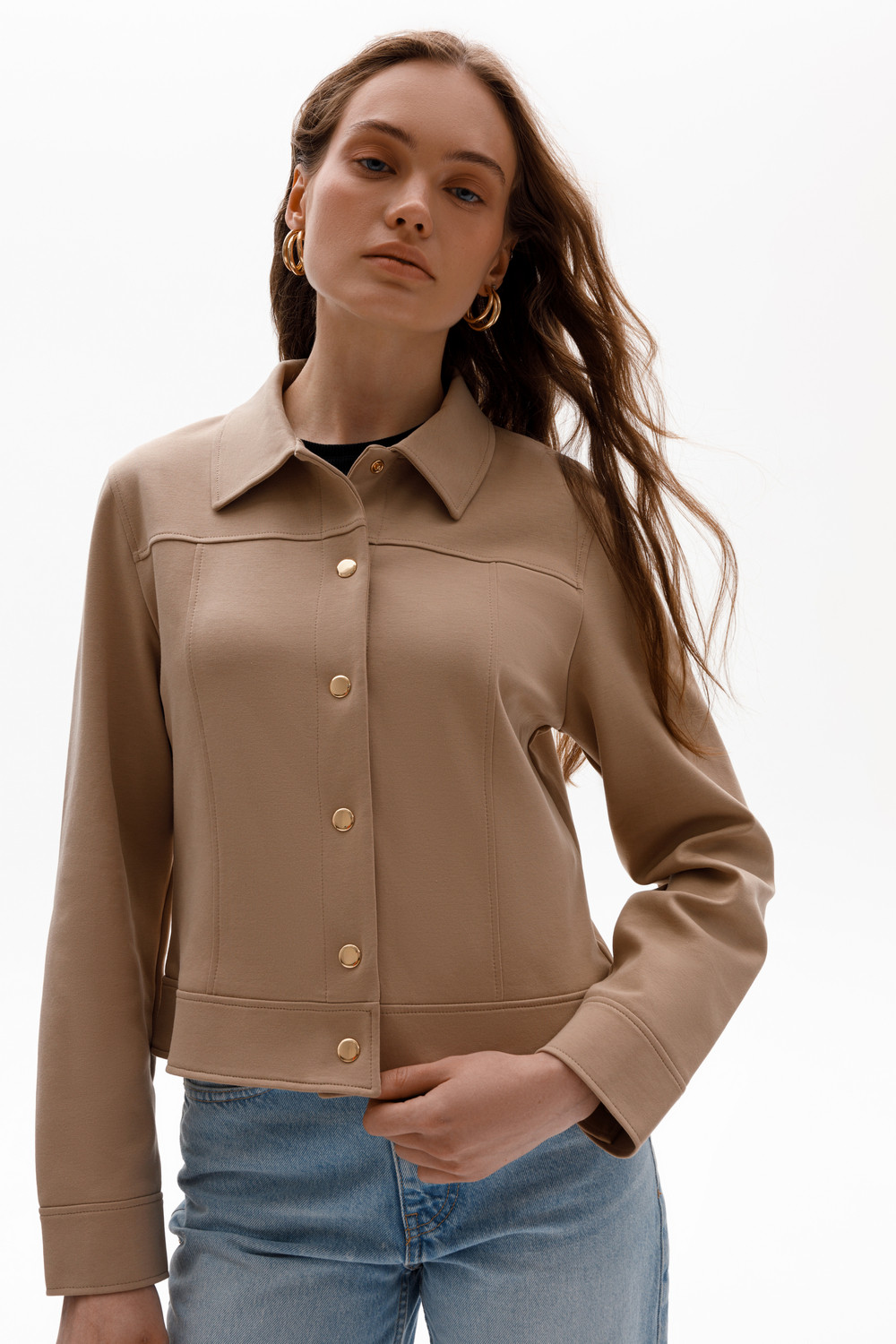 Укорочённый жакет, изготовленный из премиального трикотажного полотна DOUBLE FACE с добавлением спандекса. За счет фактуры переплетения и специальных обработок сохраняет силуэт и форму, что позволяет сочетать его как с юбкой, так и с брюками. Хлопок в составе добавит комфорта при носке.