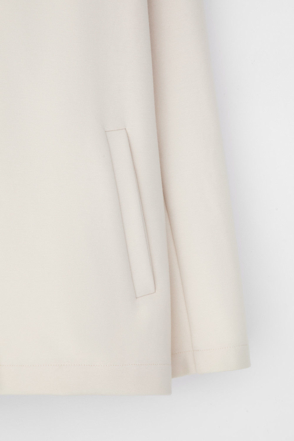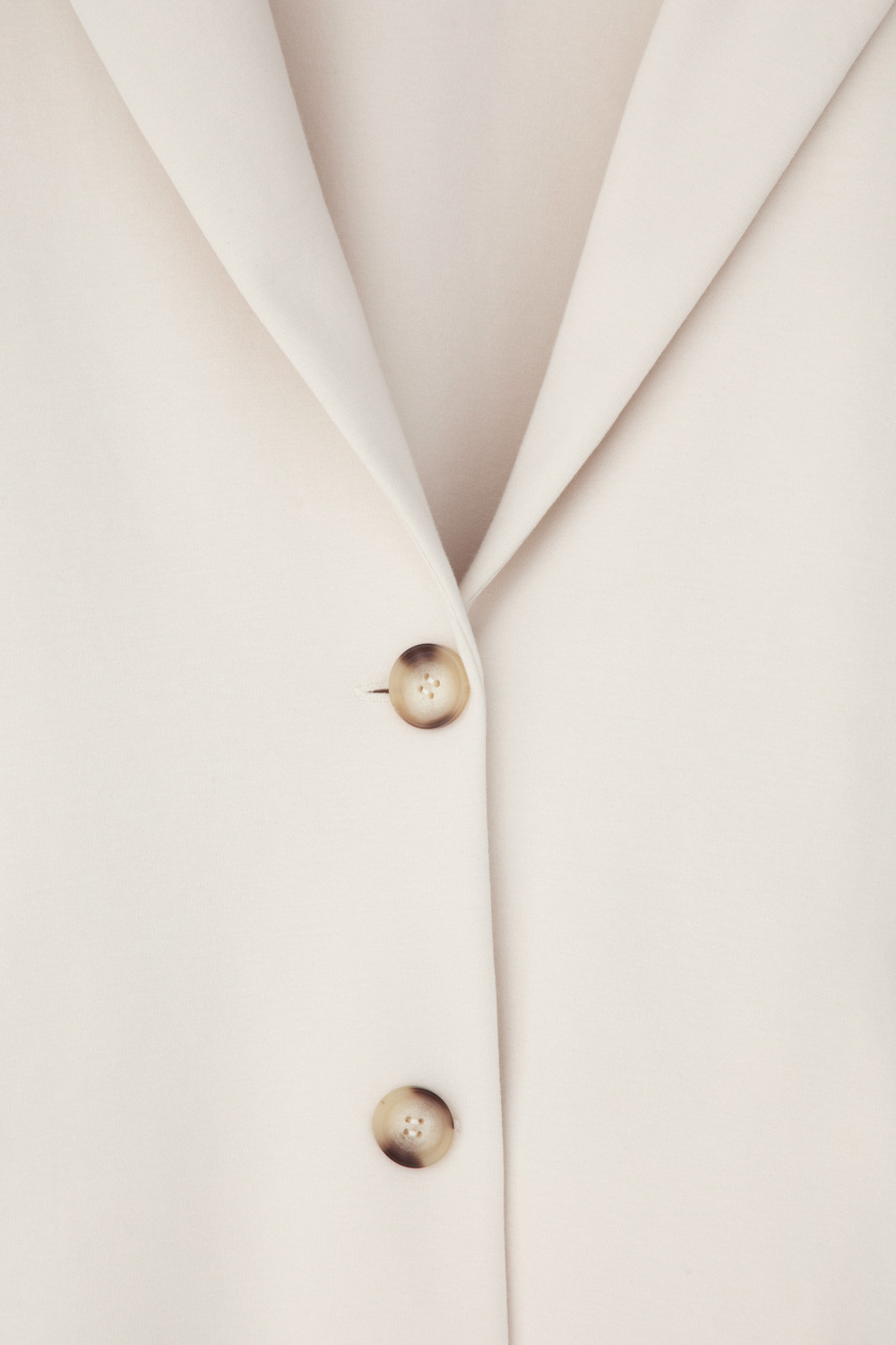 Однобортный жакет приталенного силуэта из премиального трикотажа DOUBLE FACE. За счет фактуры переплетения, добавления спандекса и специальных обработок сохраняет силуэт и форму. Хлопок в составе добавляет комфорта при носке.