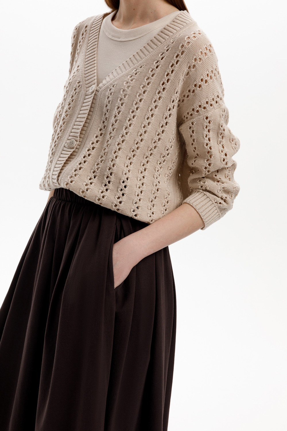 Итальянская пряжа на основе хлопка стала основой для мягкого кардигана. Ажурная вязка придает ему текстуру и объем, хлопок в составе, форму и ощущение комфорта во время носки. Незаменим в повседневном летнем гардеробе