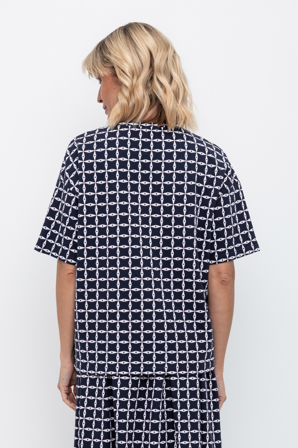 Свободная футболка из набивного пике из длинноволокнистого гребенного хлопка. Спущенное плечо придает изделию свободный силуэт.