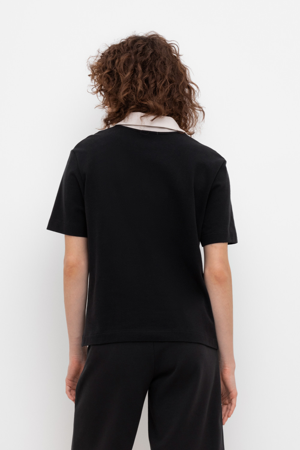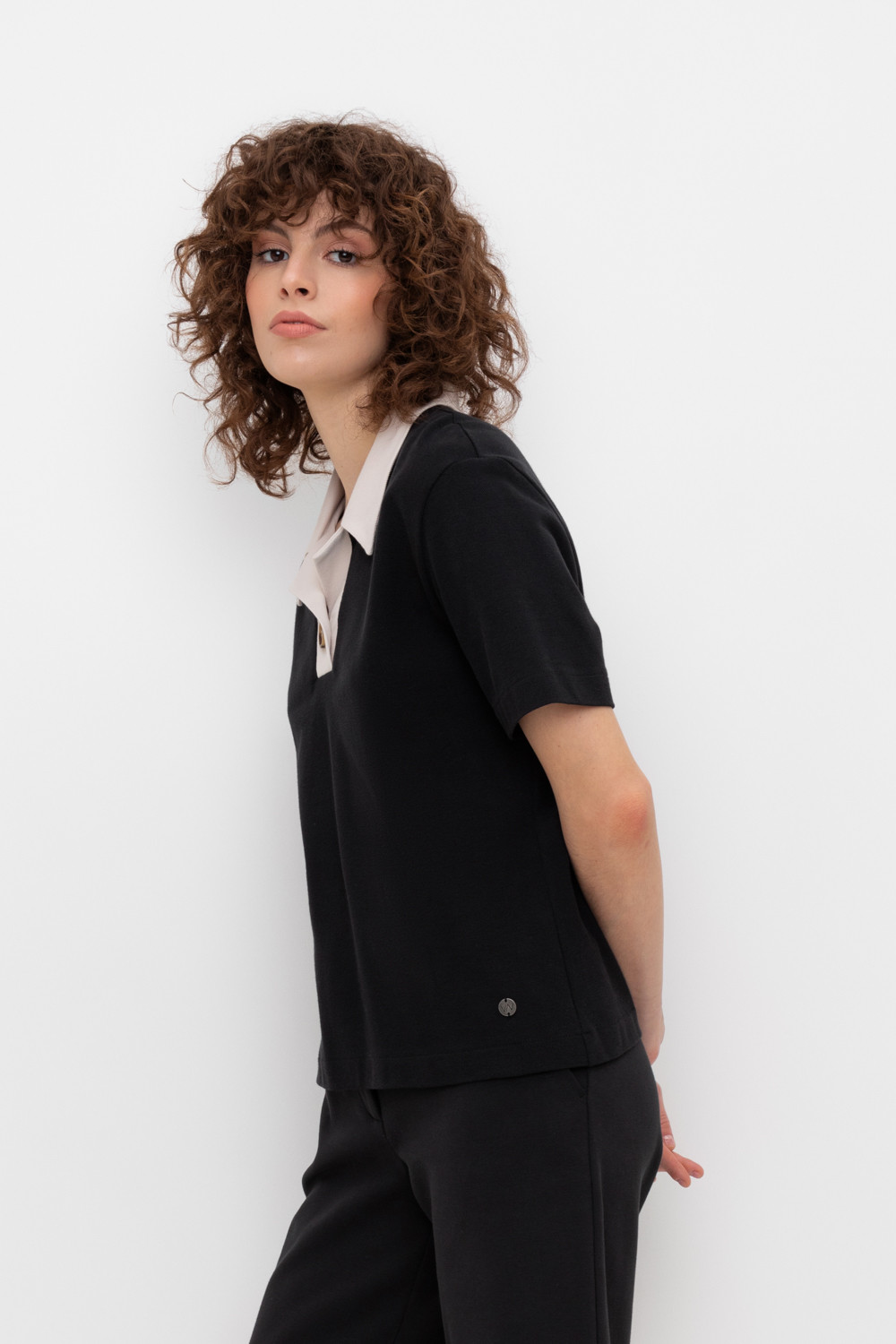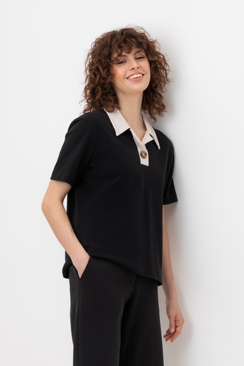Джемпер поло с короткими рукавами из пике с V-образным вырезом и декоративной пуговицей.