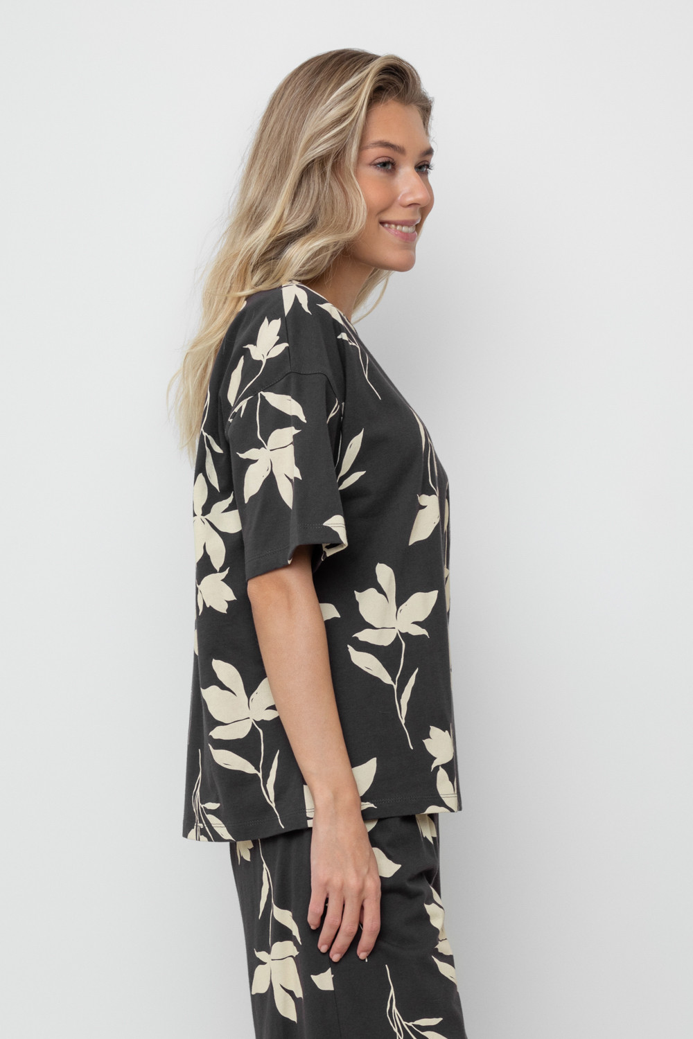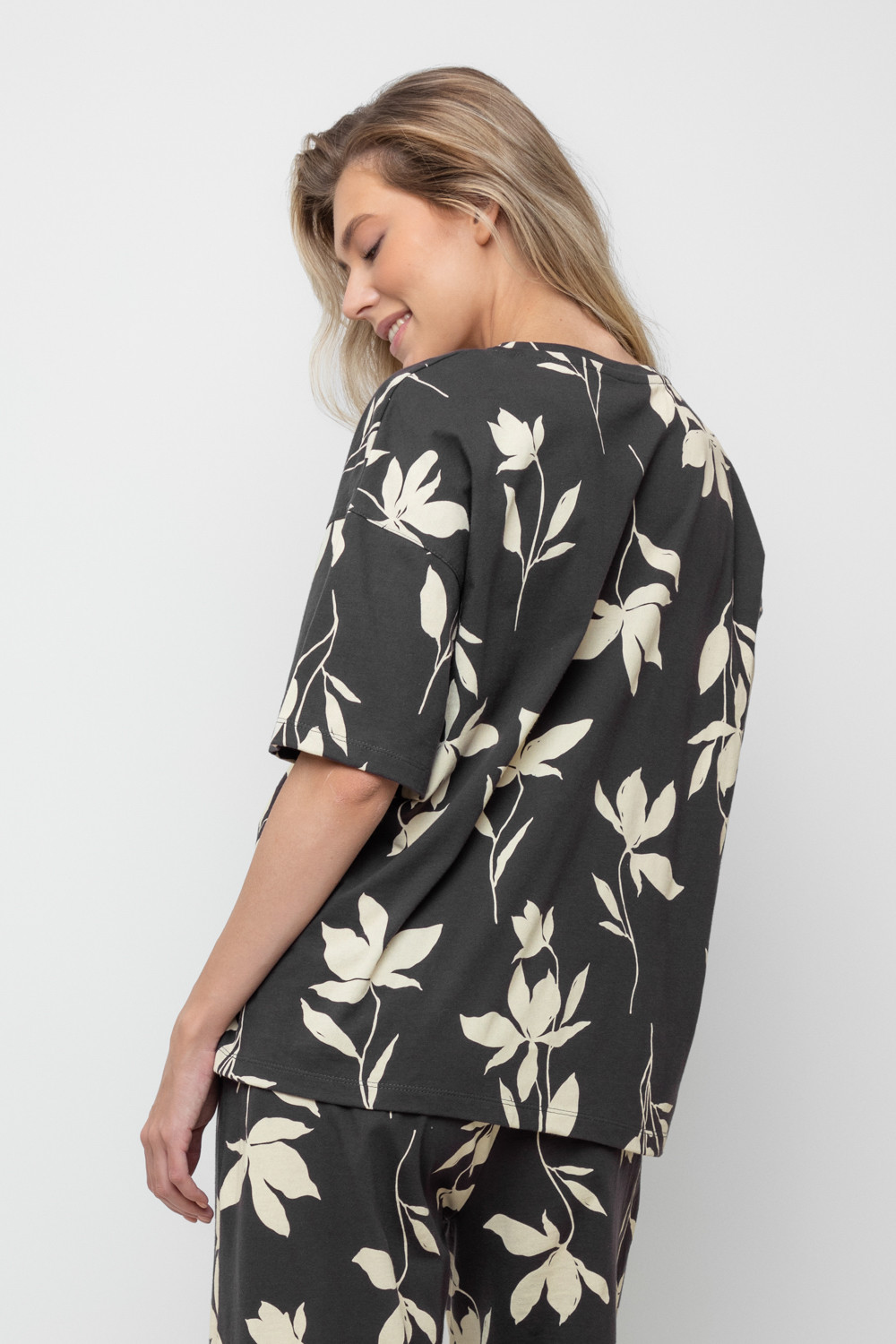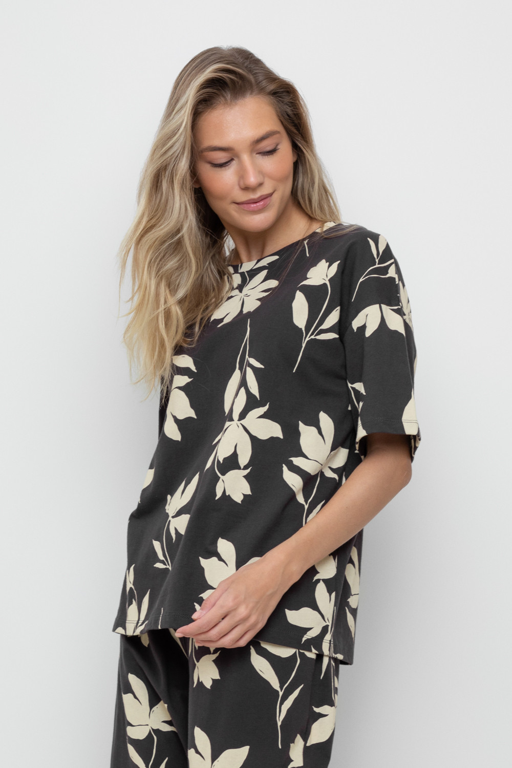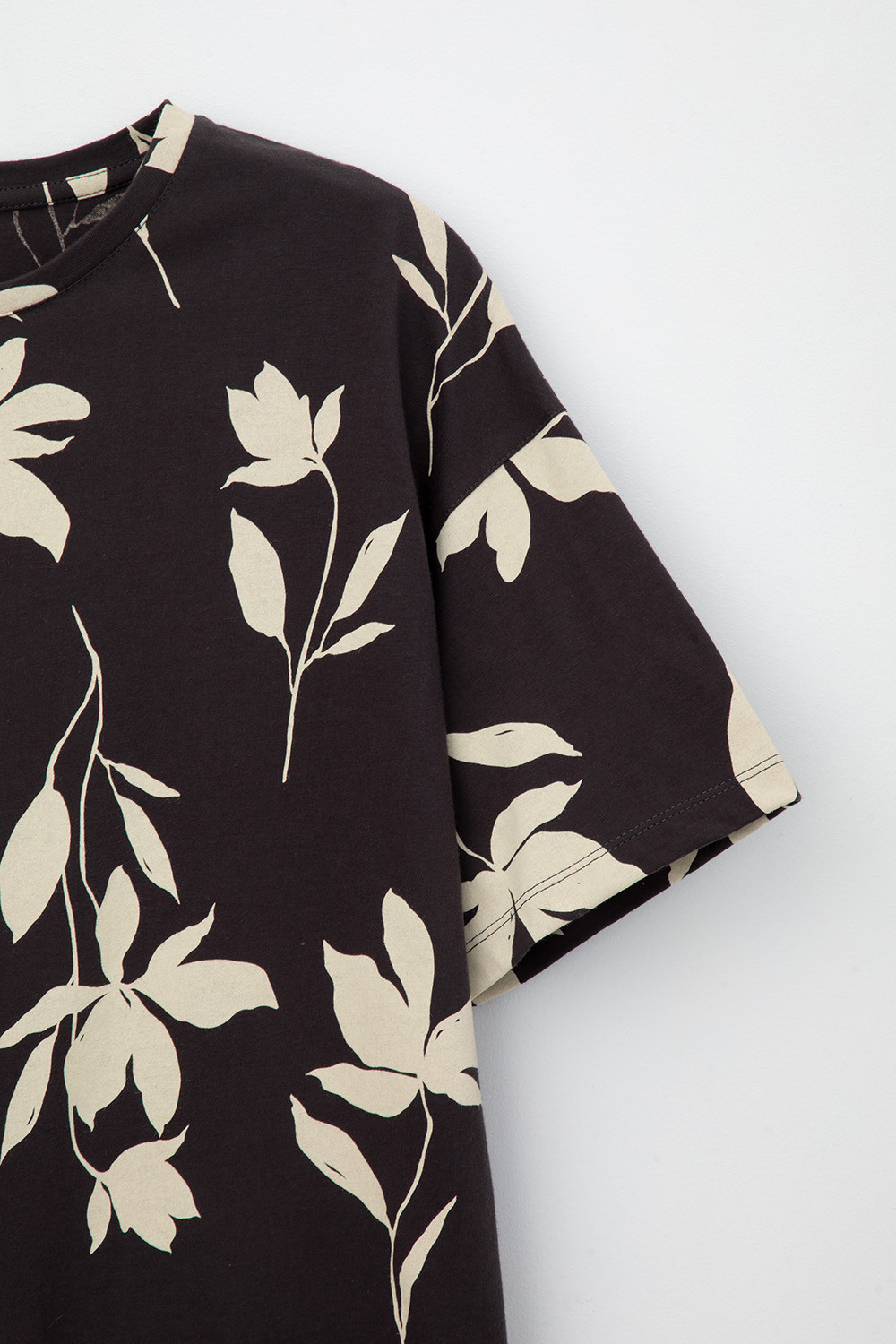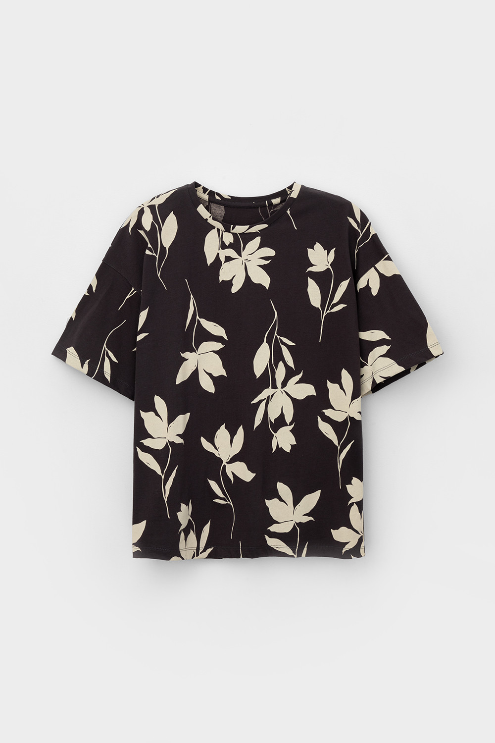Свободная футболка из набивного трикотажа супрем. Спущенное плечо придает изделию свободный силуэт.