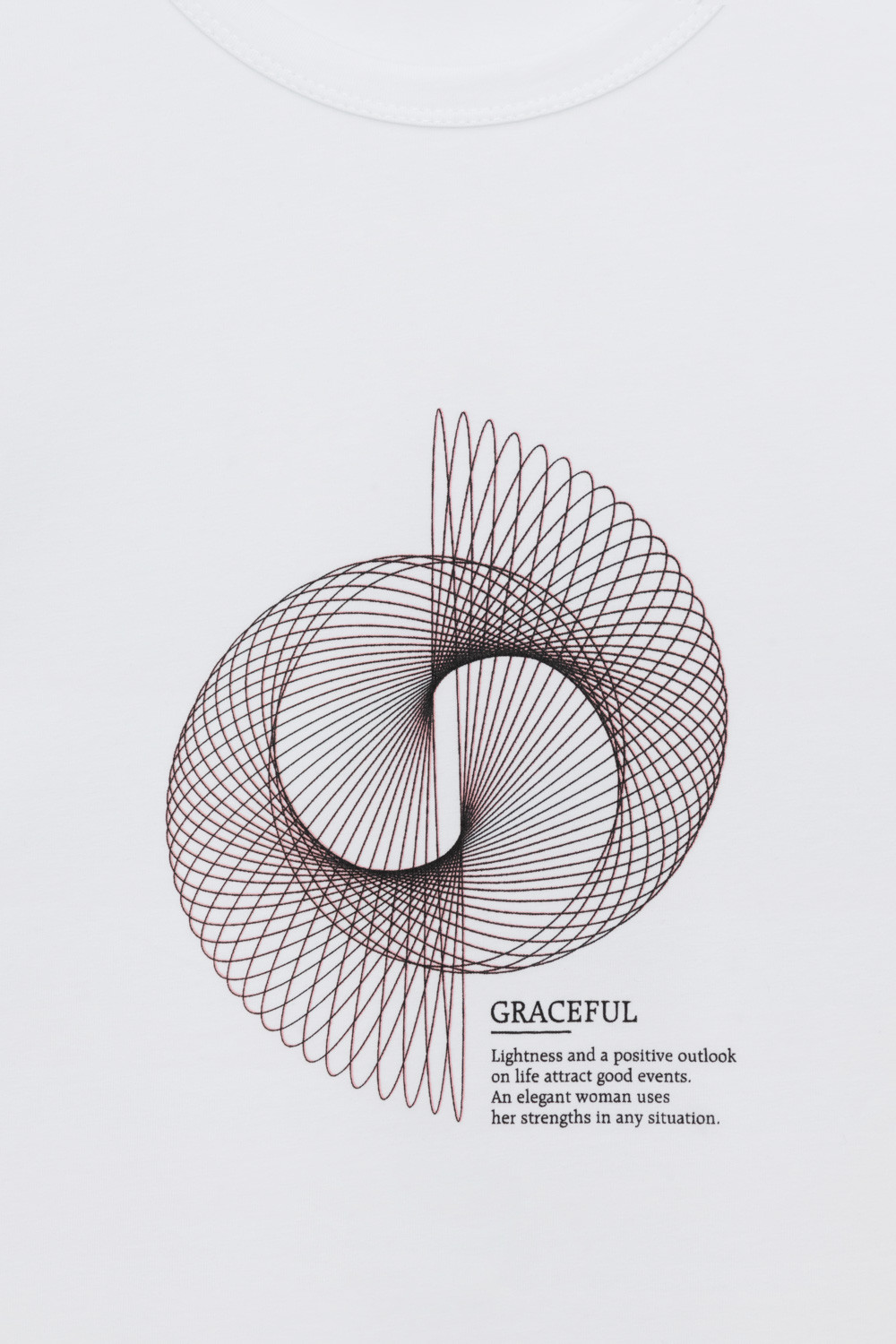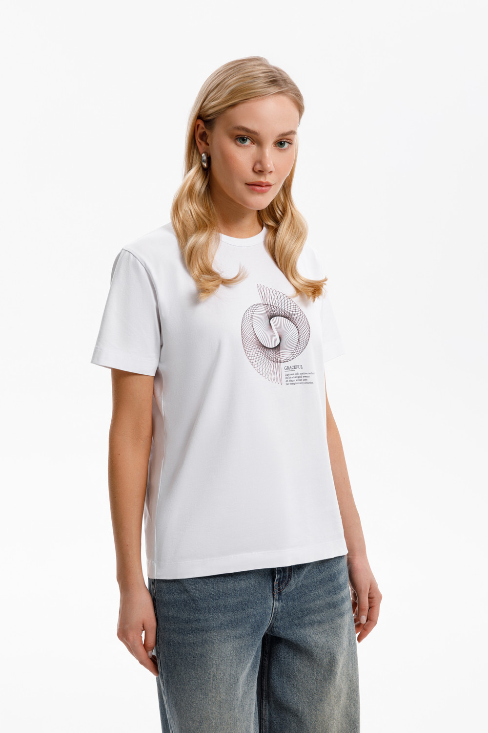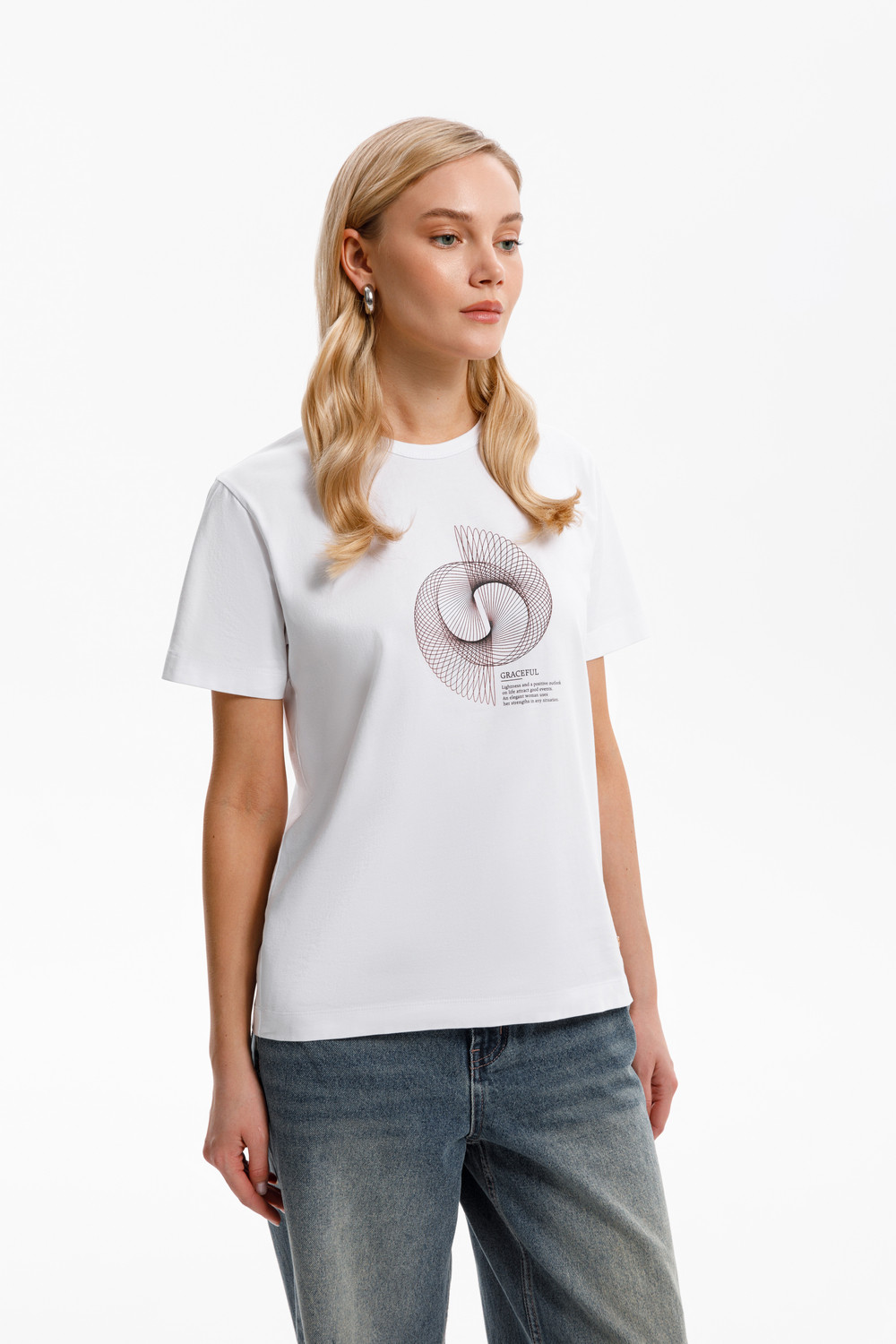 Футболка прямого силуэта из высококачественного гребенного хлопка с добавлением эластана. Мягкий на ощупь принт выполнен из водных красок, что обеспечивает устойчивость к многократным стиркам.