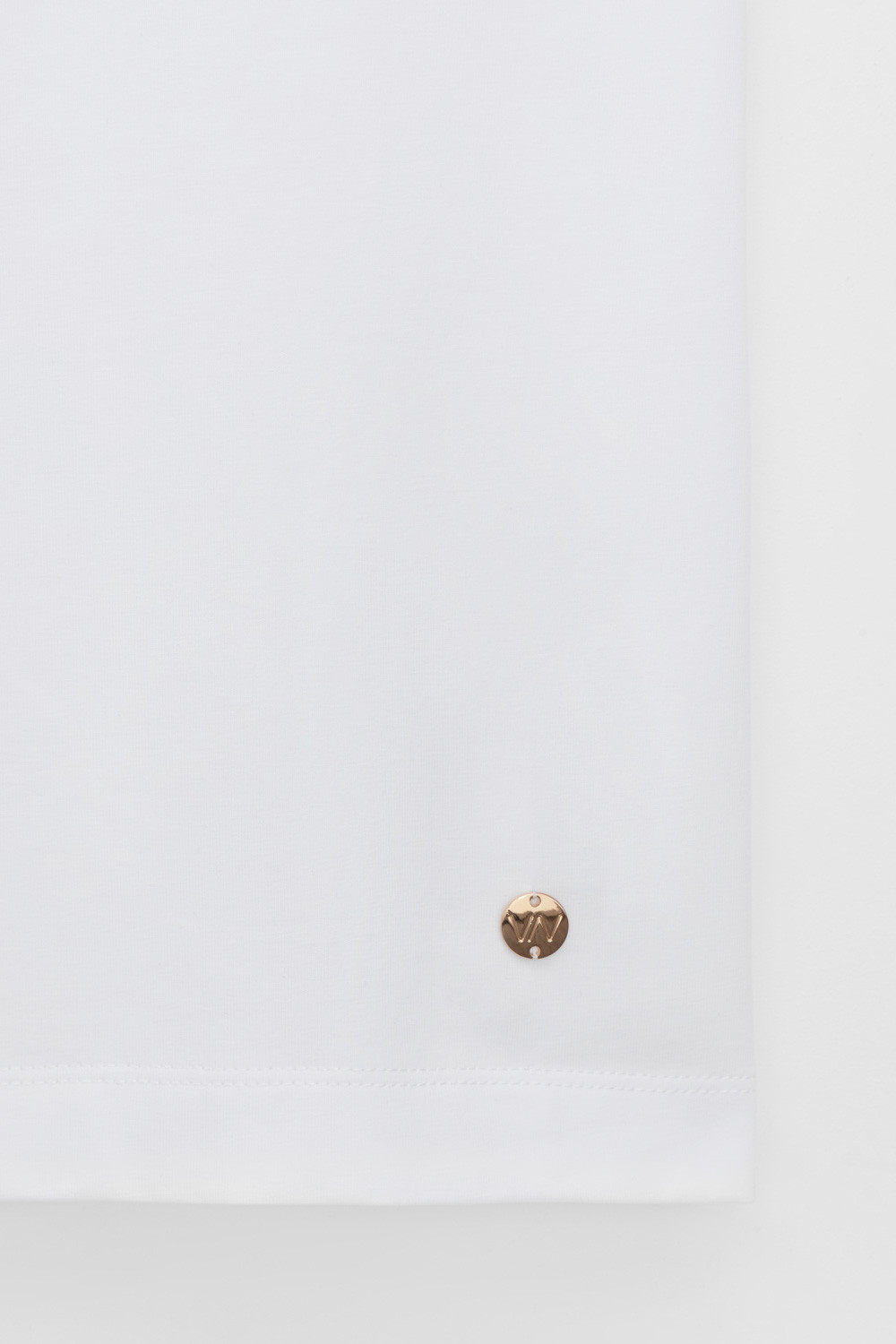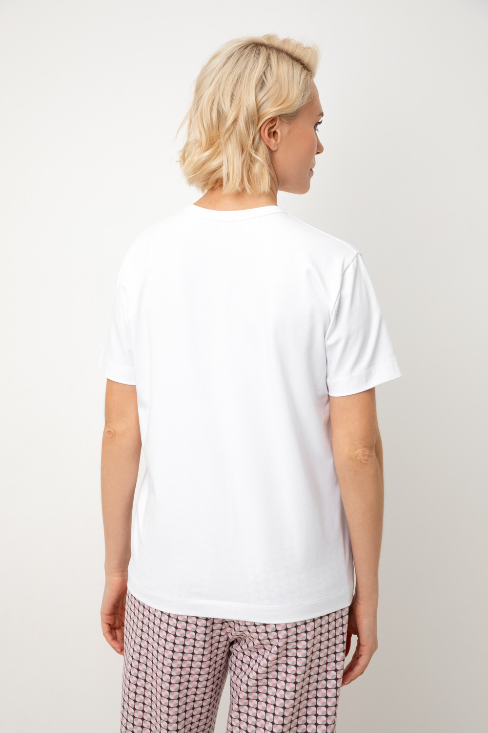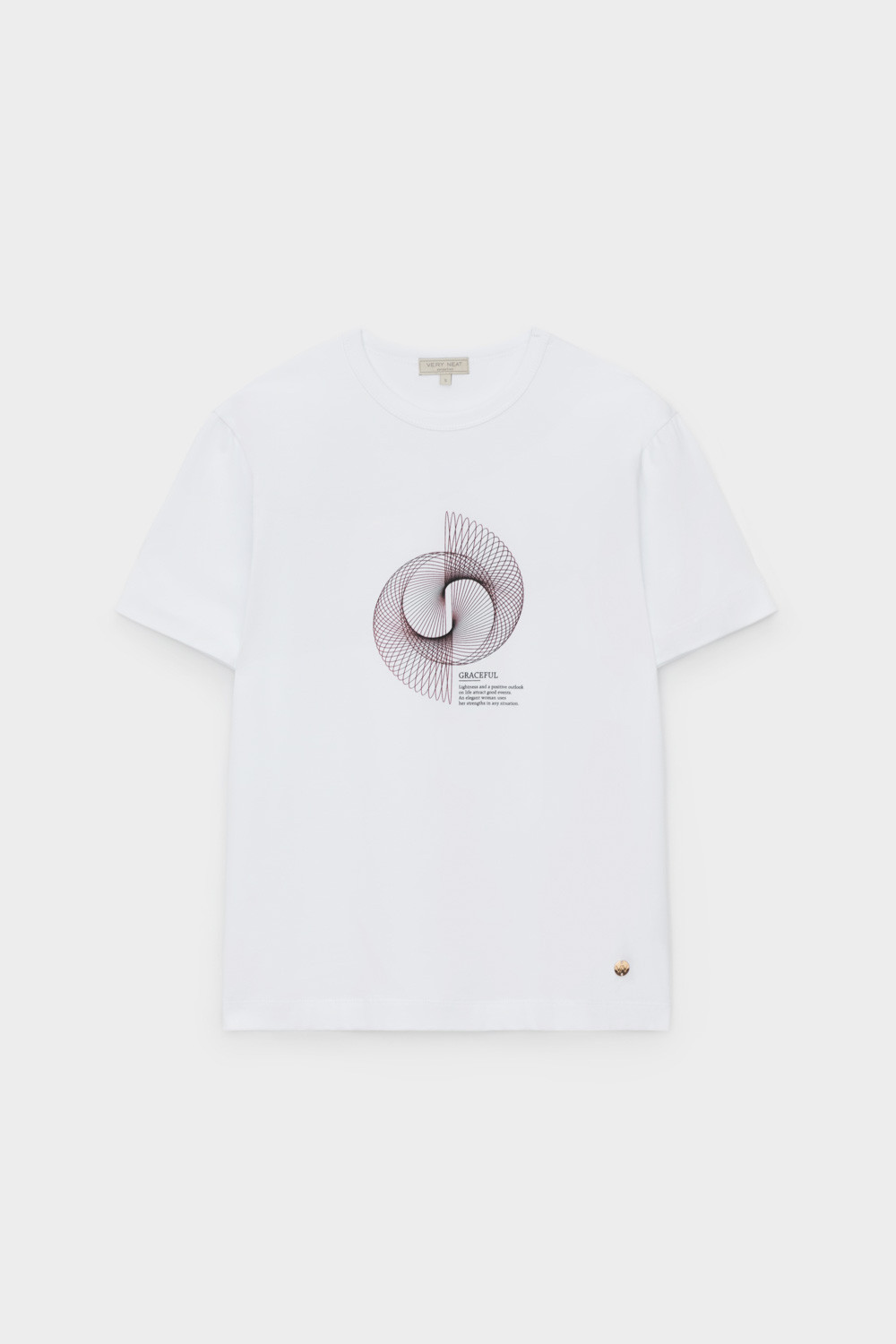 Футболка прямого силуэта из высококачественного гребенного хлопка с добавлением эластана. Мягкий на ощупь принт выполнен из водных красок, что обеспечивает устойчивость к многократным стиркам.