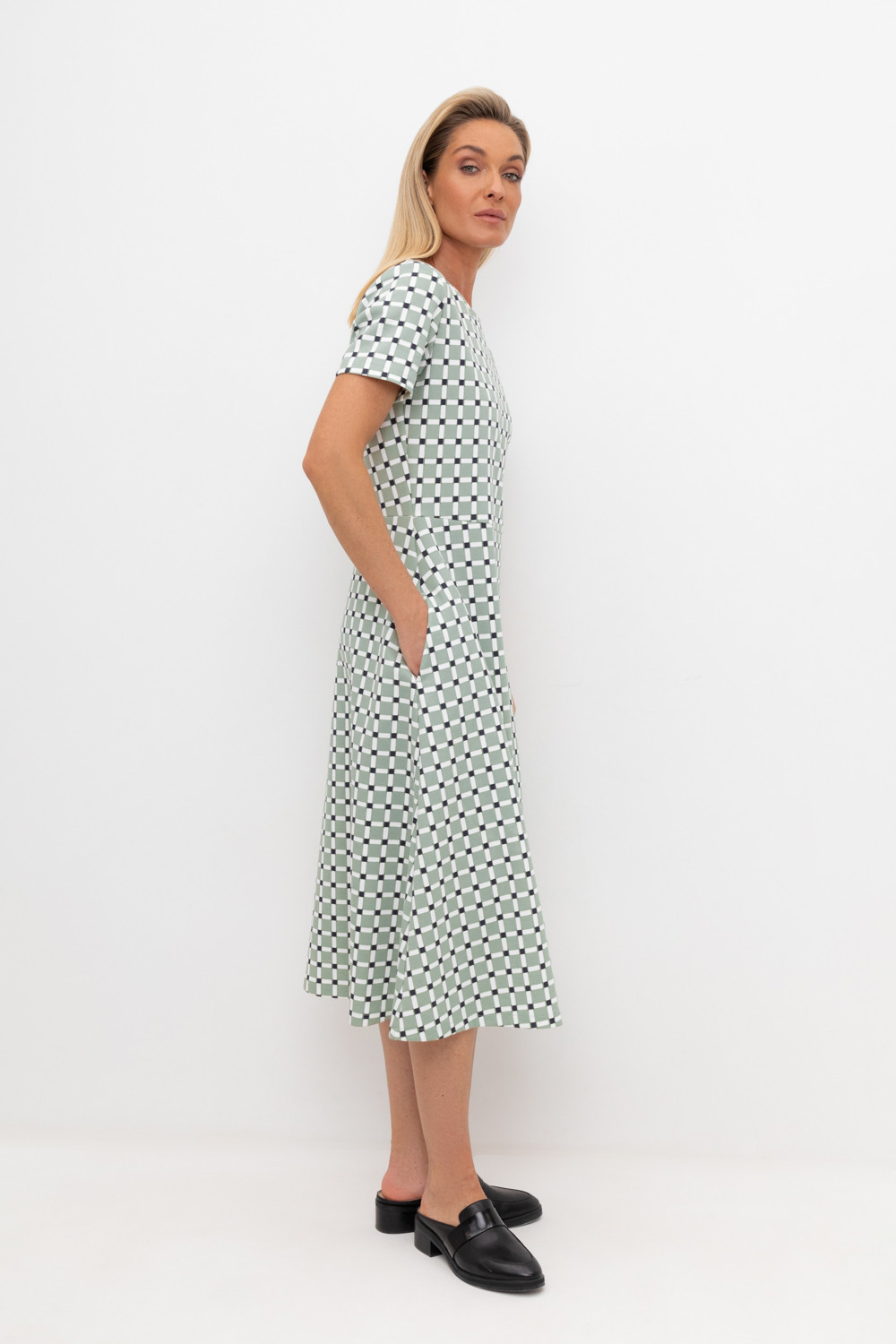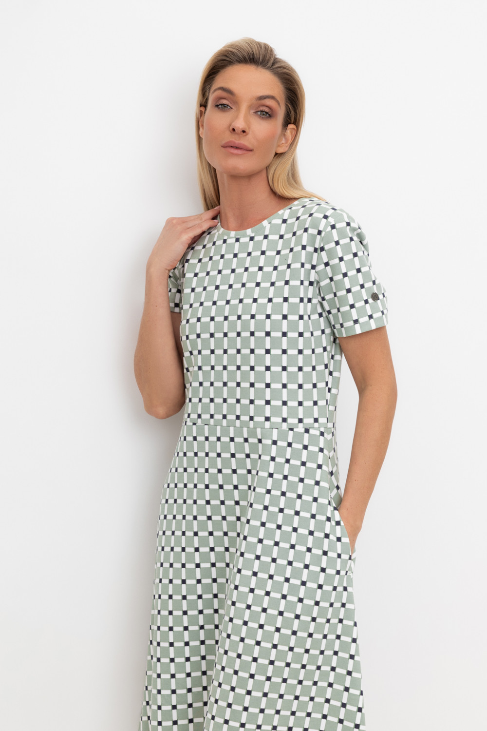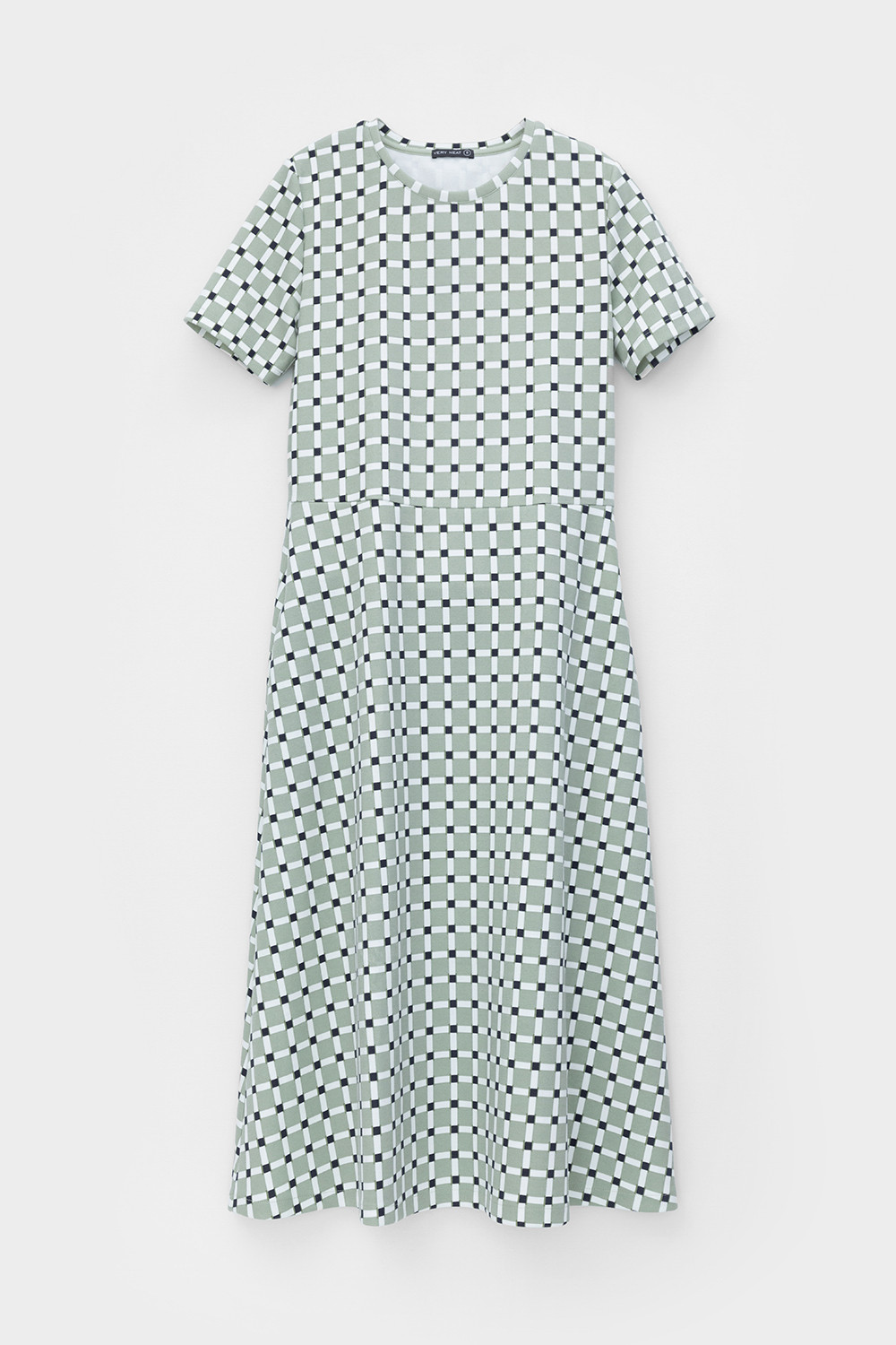 Платье  с короткими рукавами из плотного набивного трикотажа интерлок . Модель с трапициевидной юбкой и боковыми карманами.