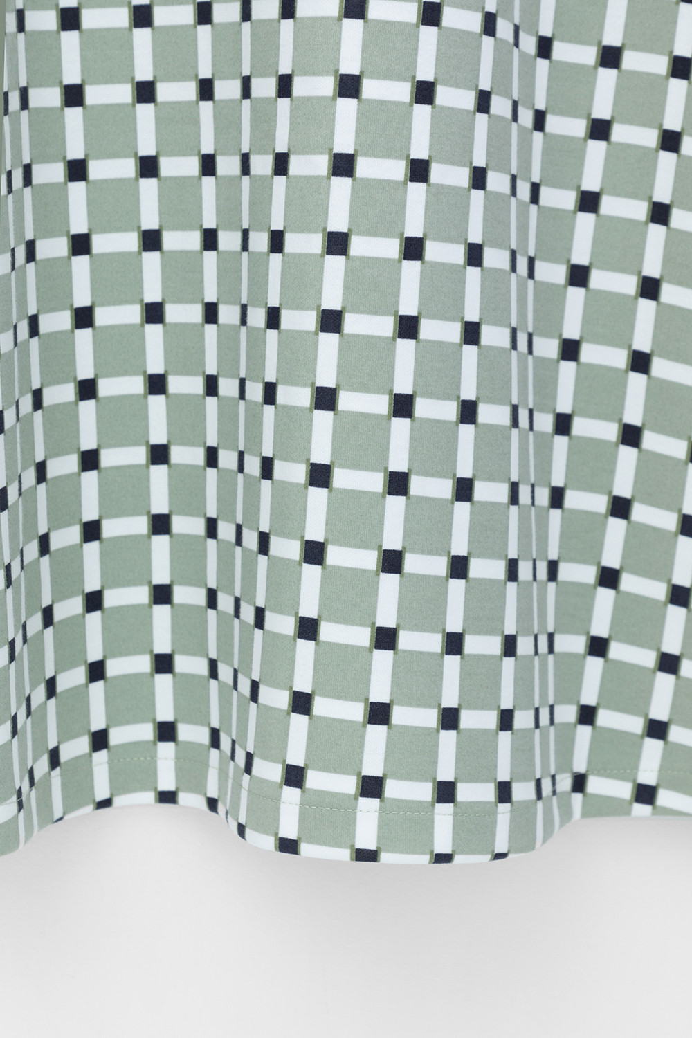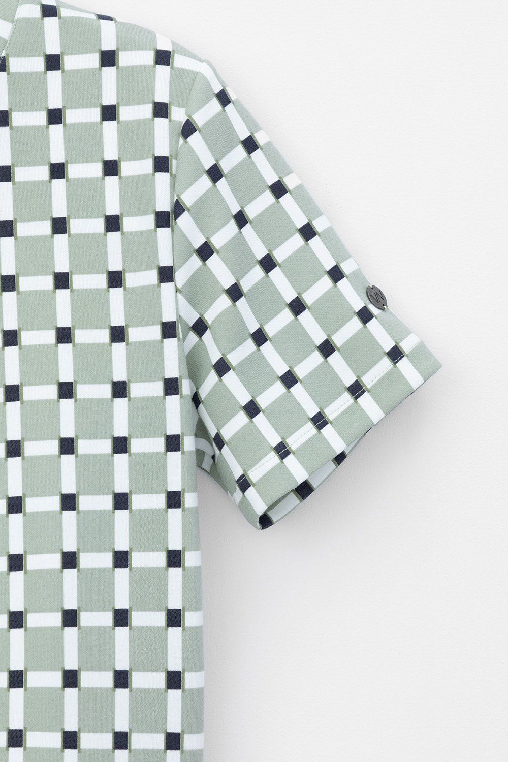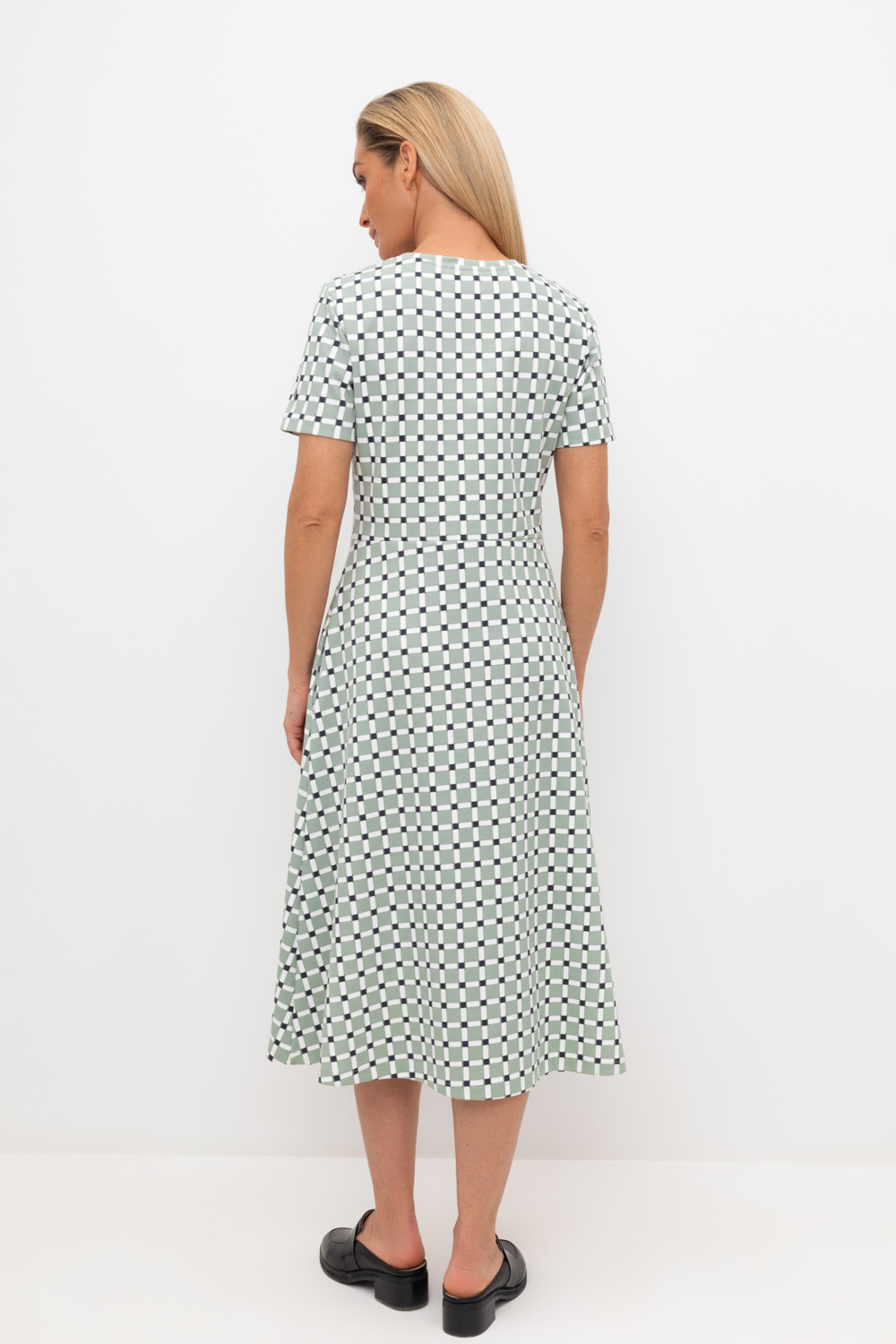 Платье  с короткими рукавами из плотного набивного трикотажа интерлок . Модель с трапициевидной юбкой и боковыми карманами.