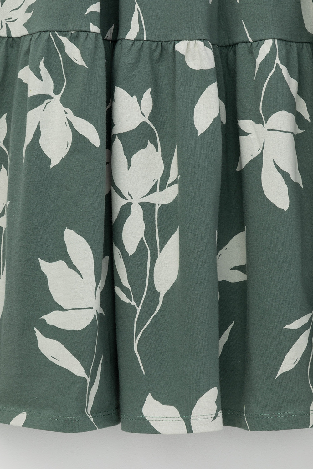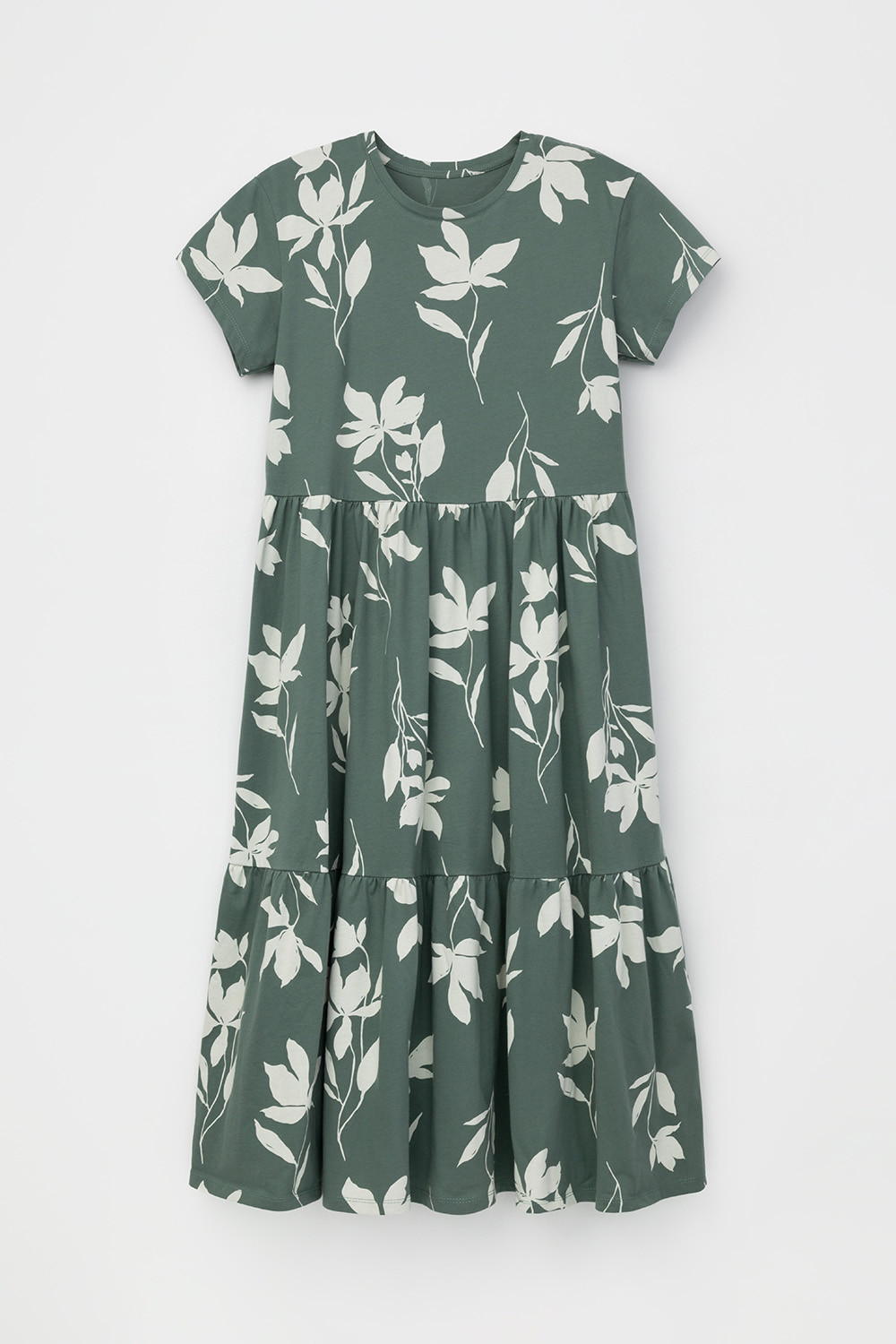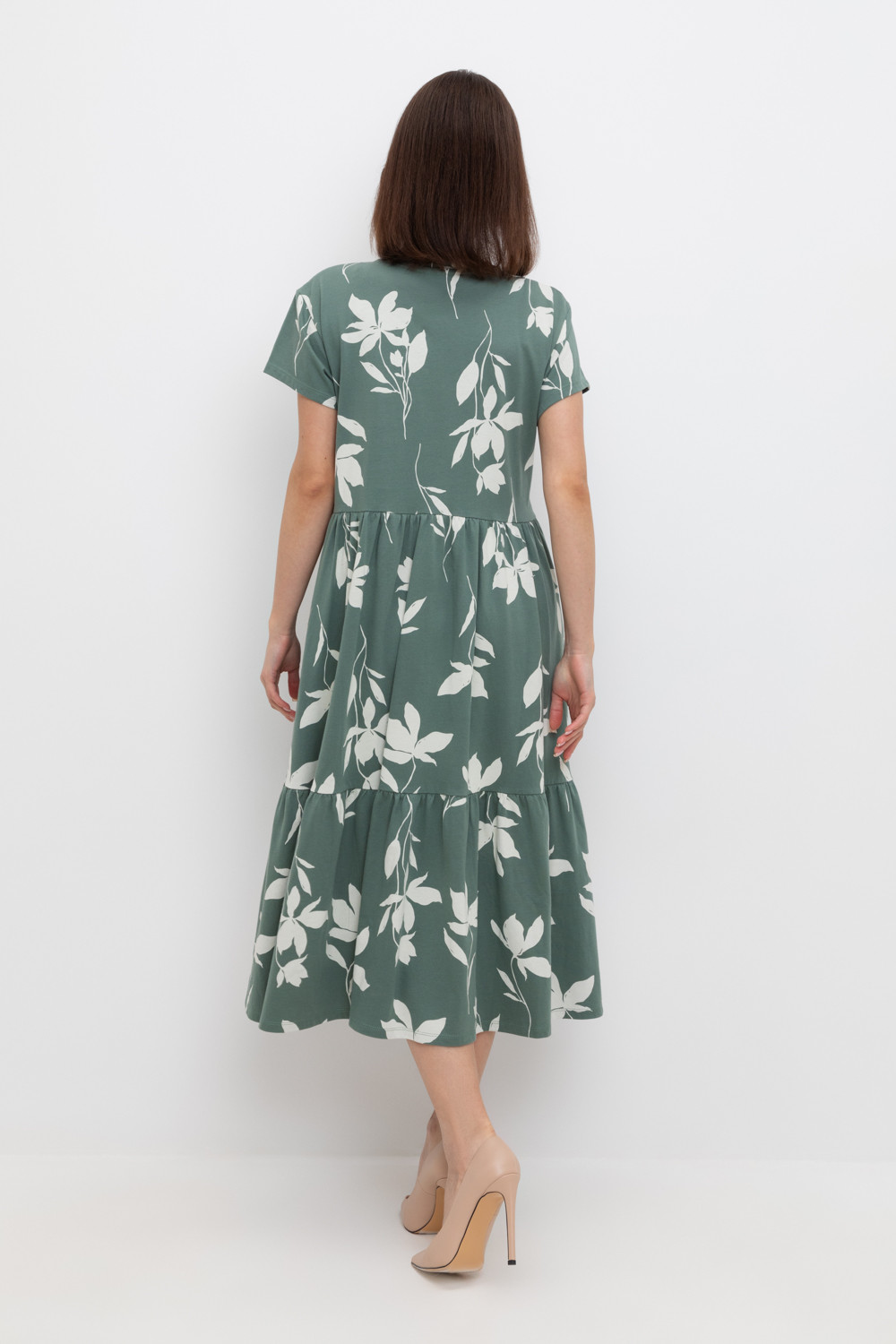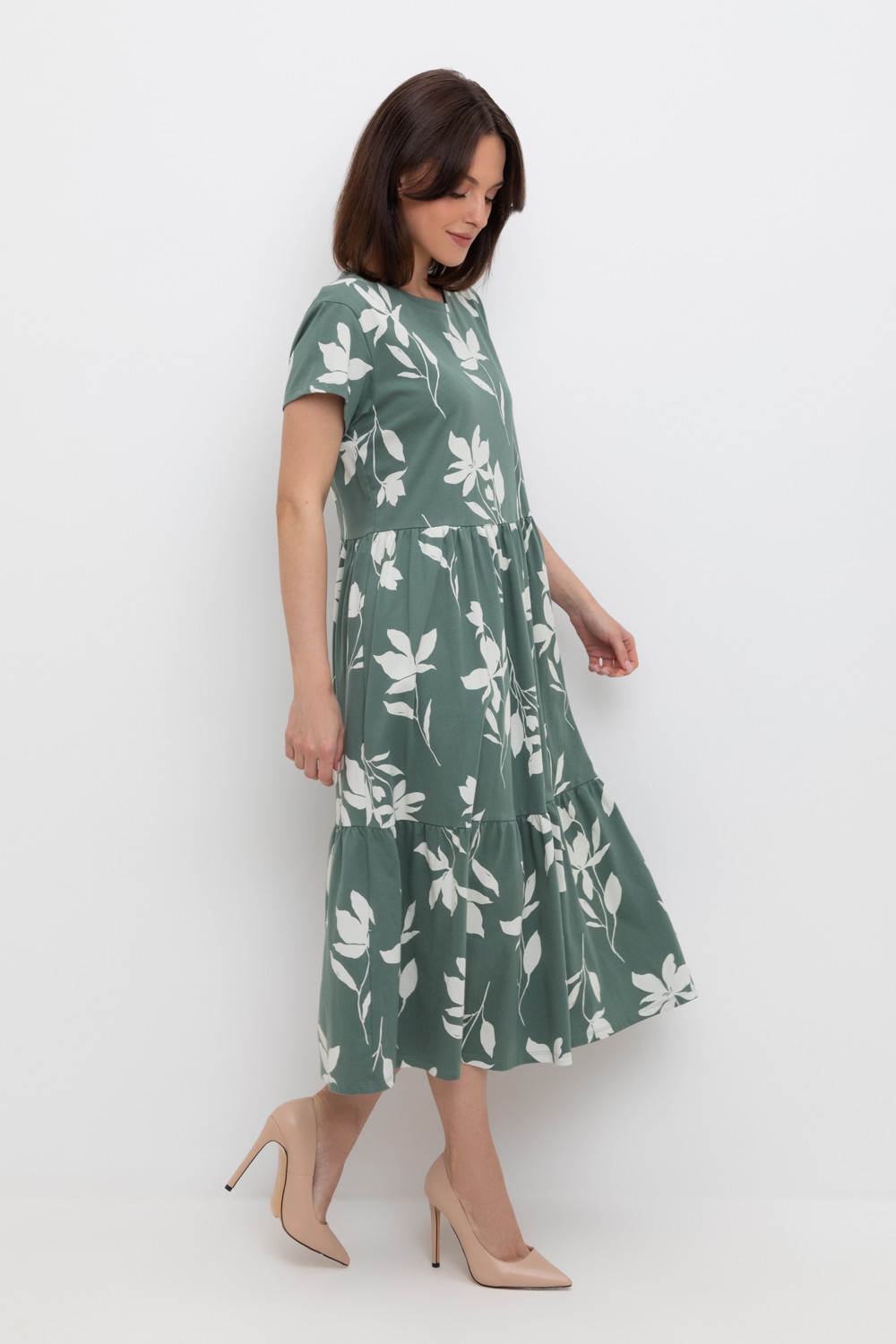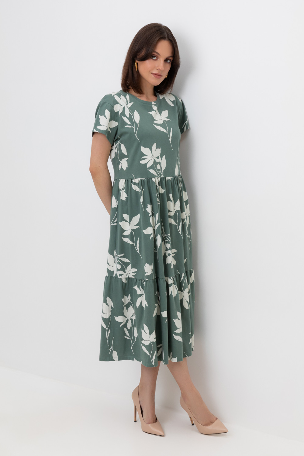 Легкое платье с круглым вырезом со сборками, короткими рукавами из набивного трикотажа супрем.                                                                                                                                                       Все трикотажные полотна производятся в соответствии с нормами Швейцарского сертификата ЭкоТекс. Сделано в России