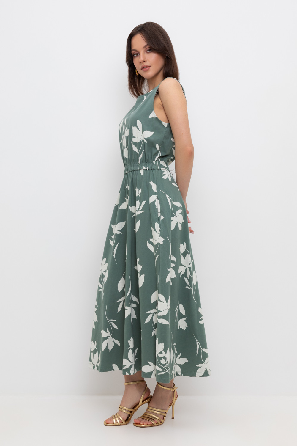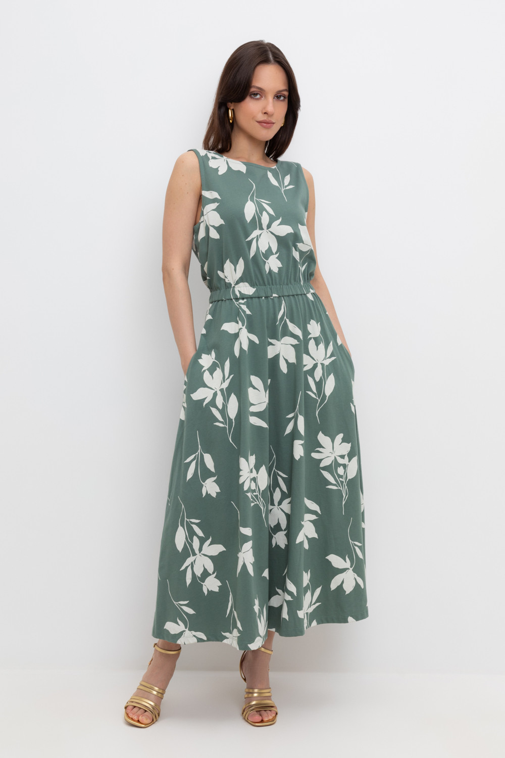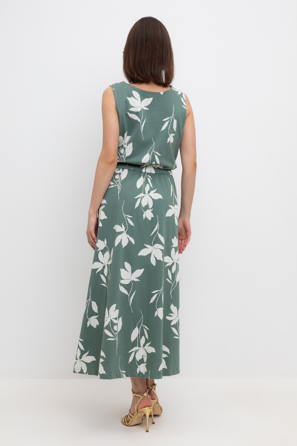 Легкое платье с круглым вырезом, короткими рукавами и поясом на резинке из набивного трикотажа супрем.