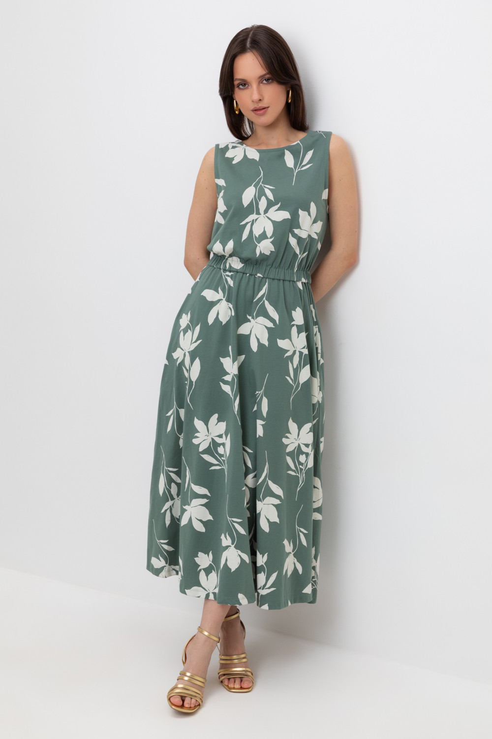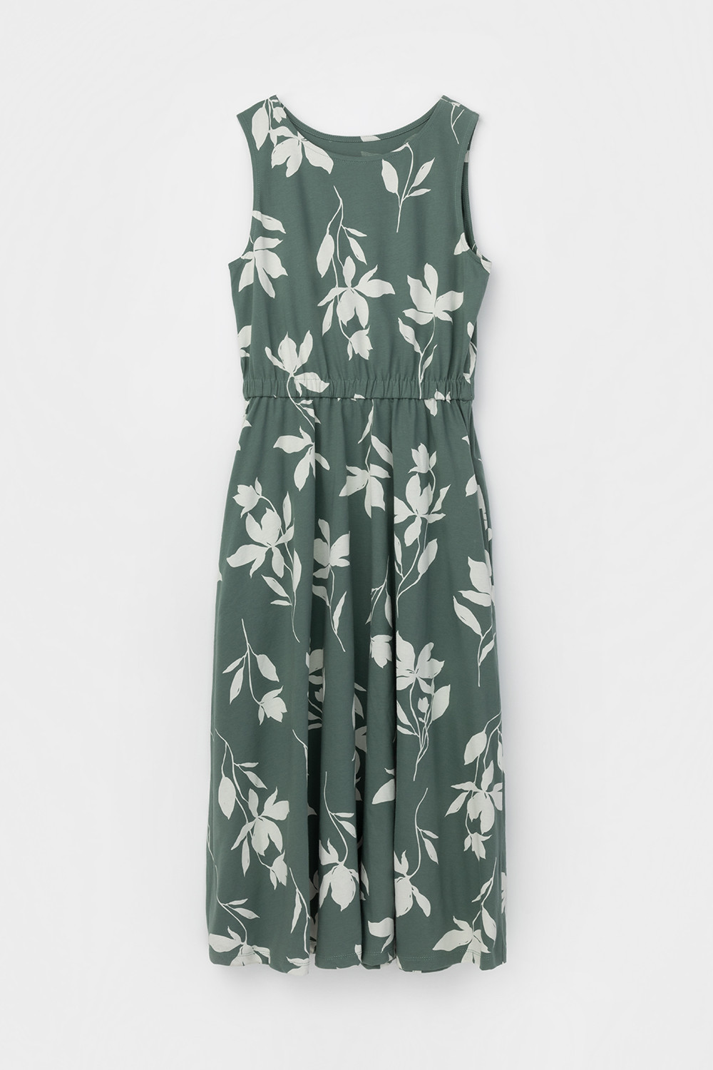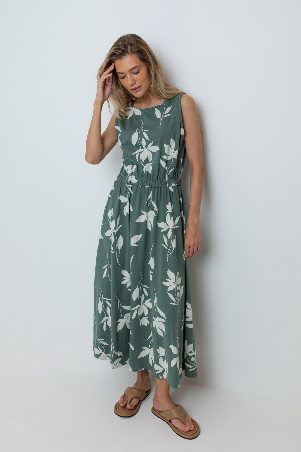 Легкое платье с круглым вырезом, короткими рукавами и поясом на резинке из набивного трикотажа супрем.
