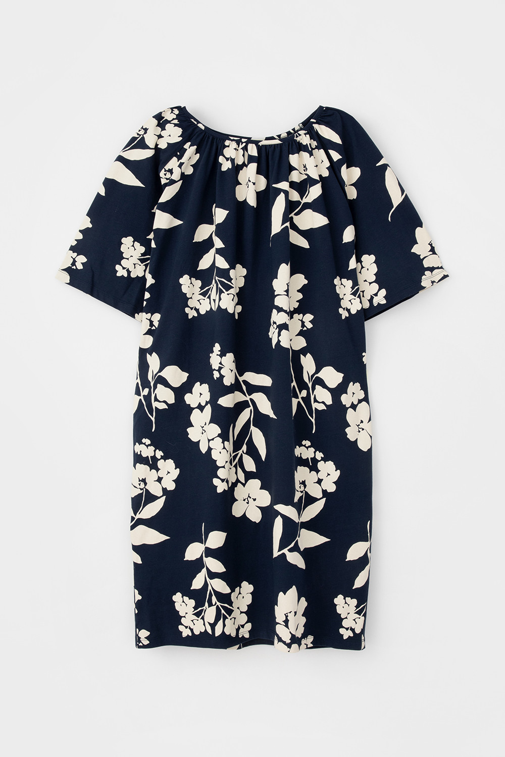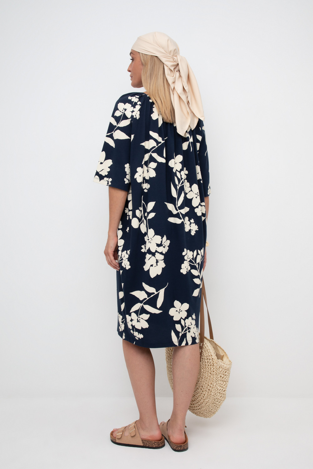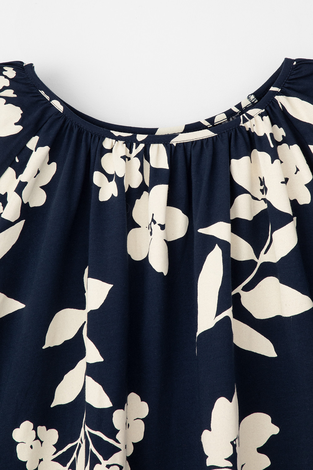 Легкое свободное платье с круглым вырезом на сборке, короткими рукавами из набивного трикотажа супрем.
