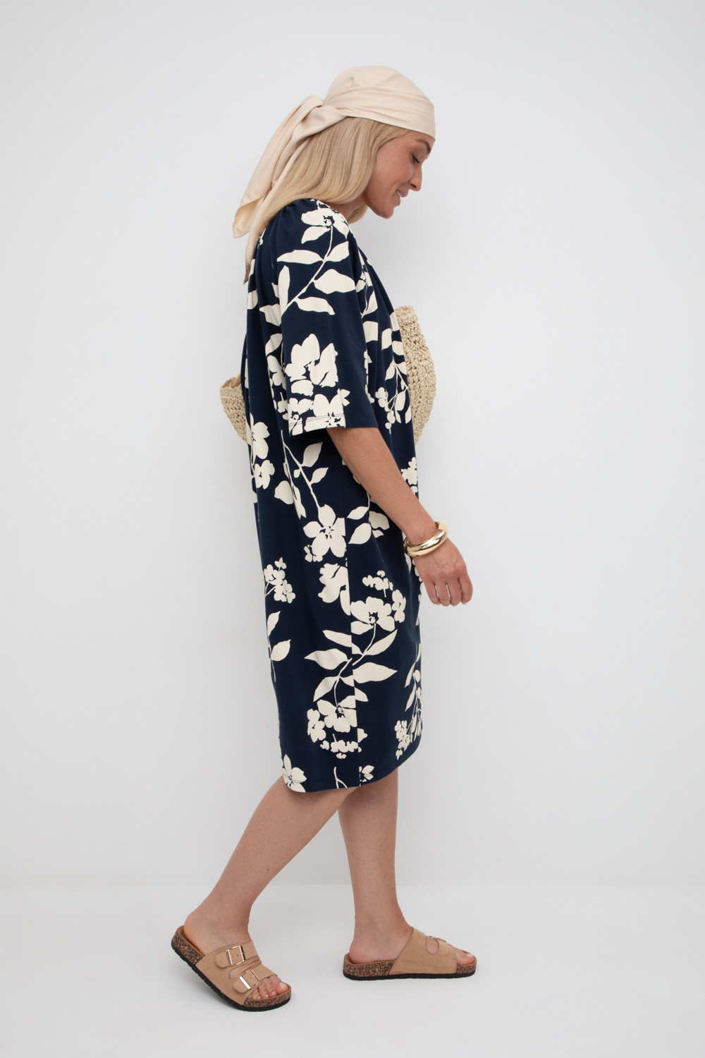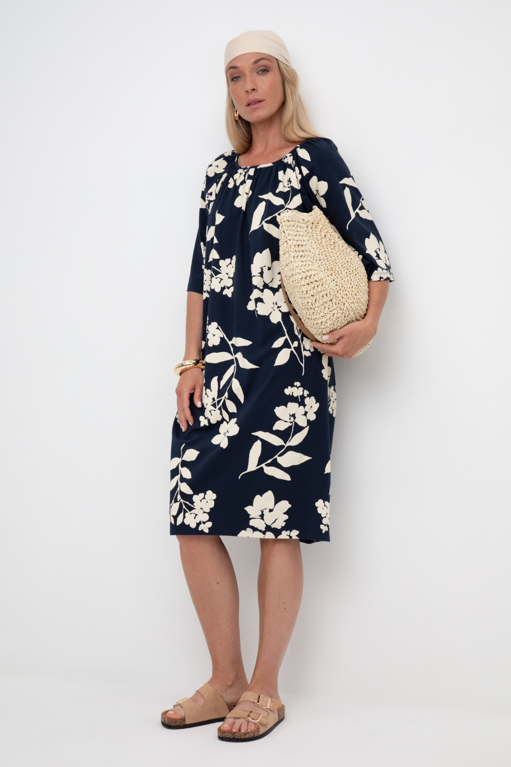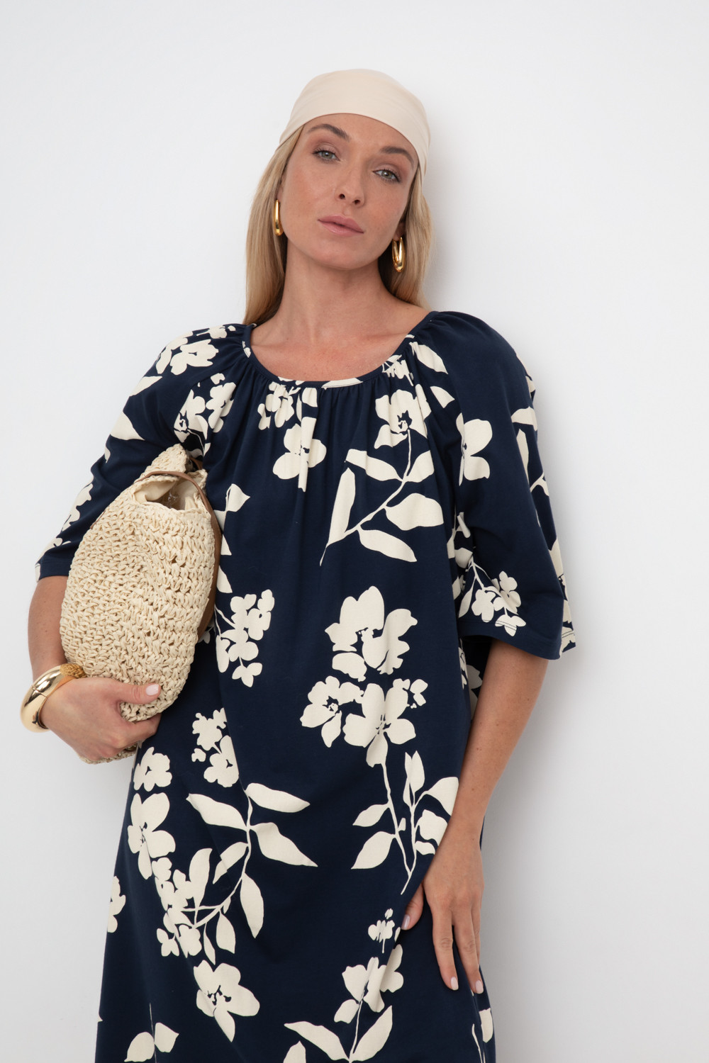 Легкое свободное платье с круглым вырезом на сборке, короткими рукавами из набивного трикотажа супрем.