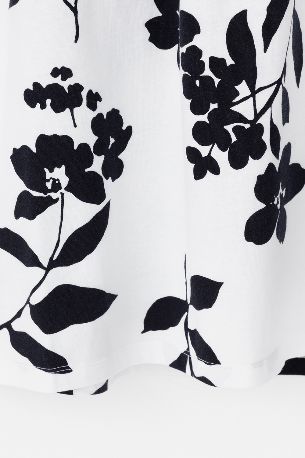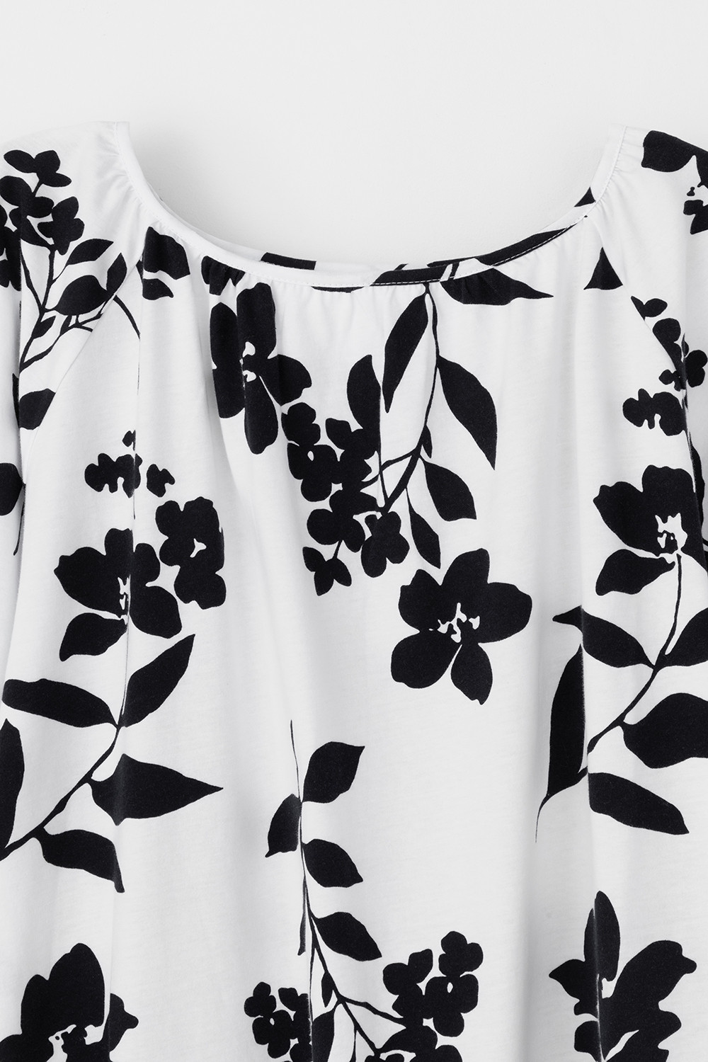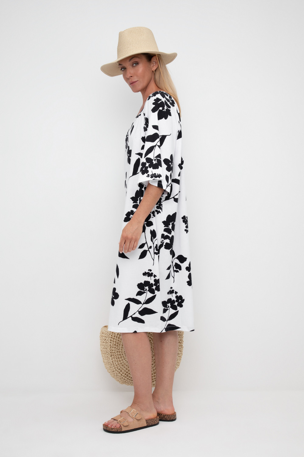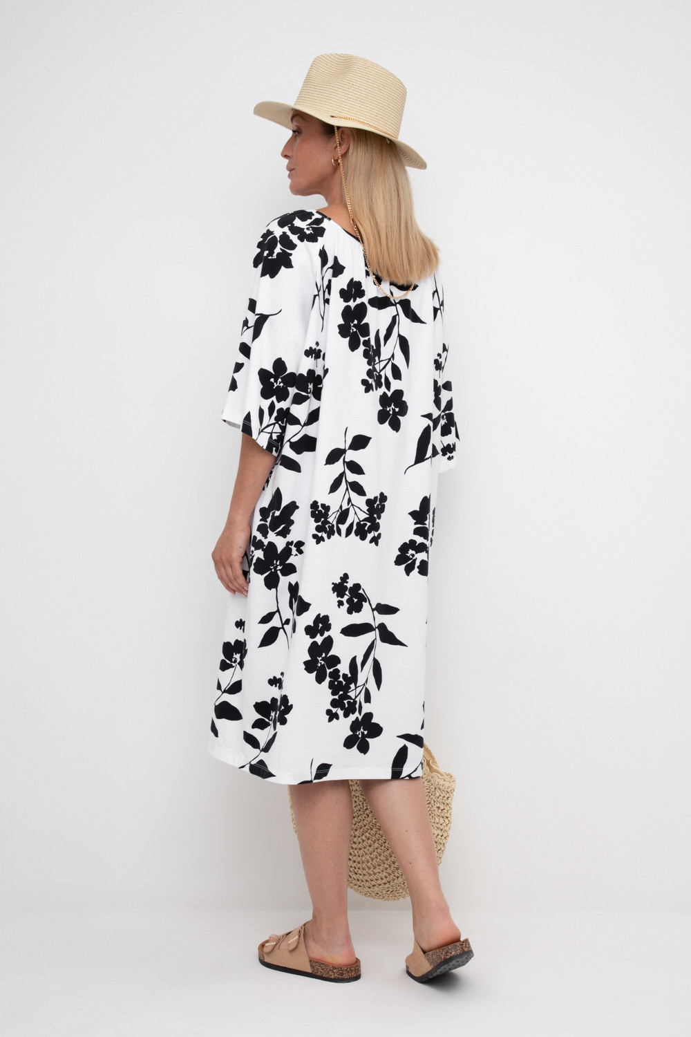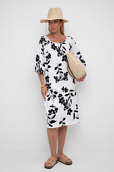Легкое свободное платье с круглым вырезом на сборке, короткими рукавами из набивного трикотажа супрем.