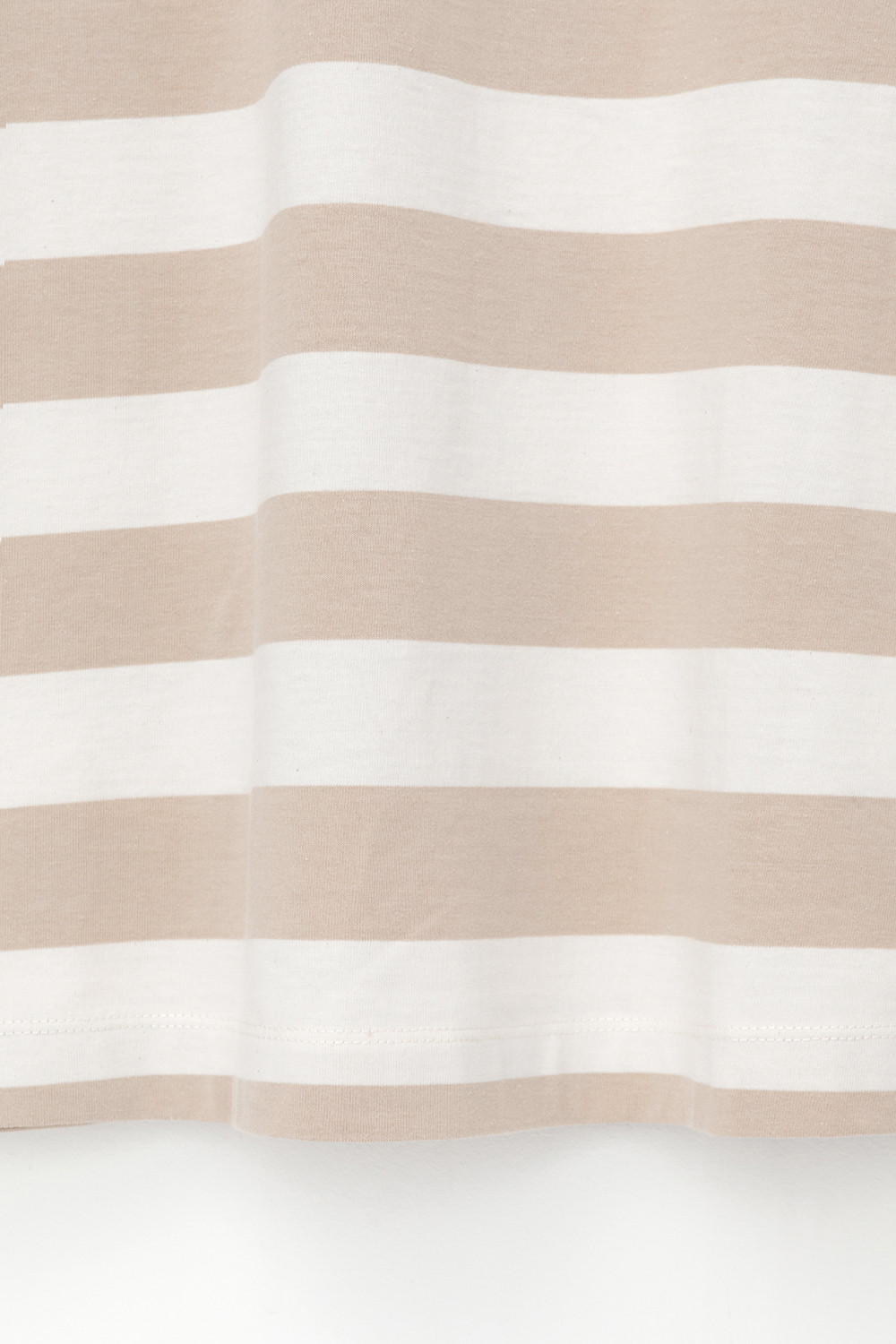 Трикотажное платье в полоску из длинноволокнистого гребенного хлопка. Спущенное плечо придает изделию свободный силуэт.