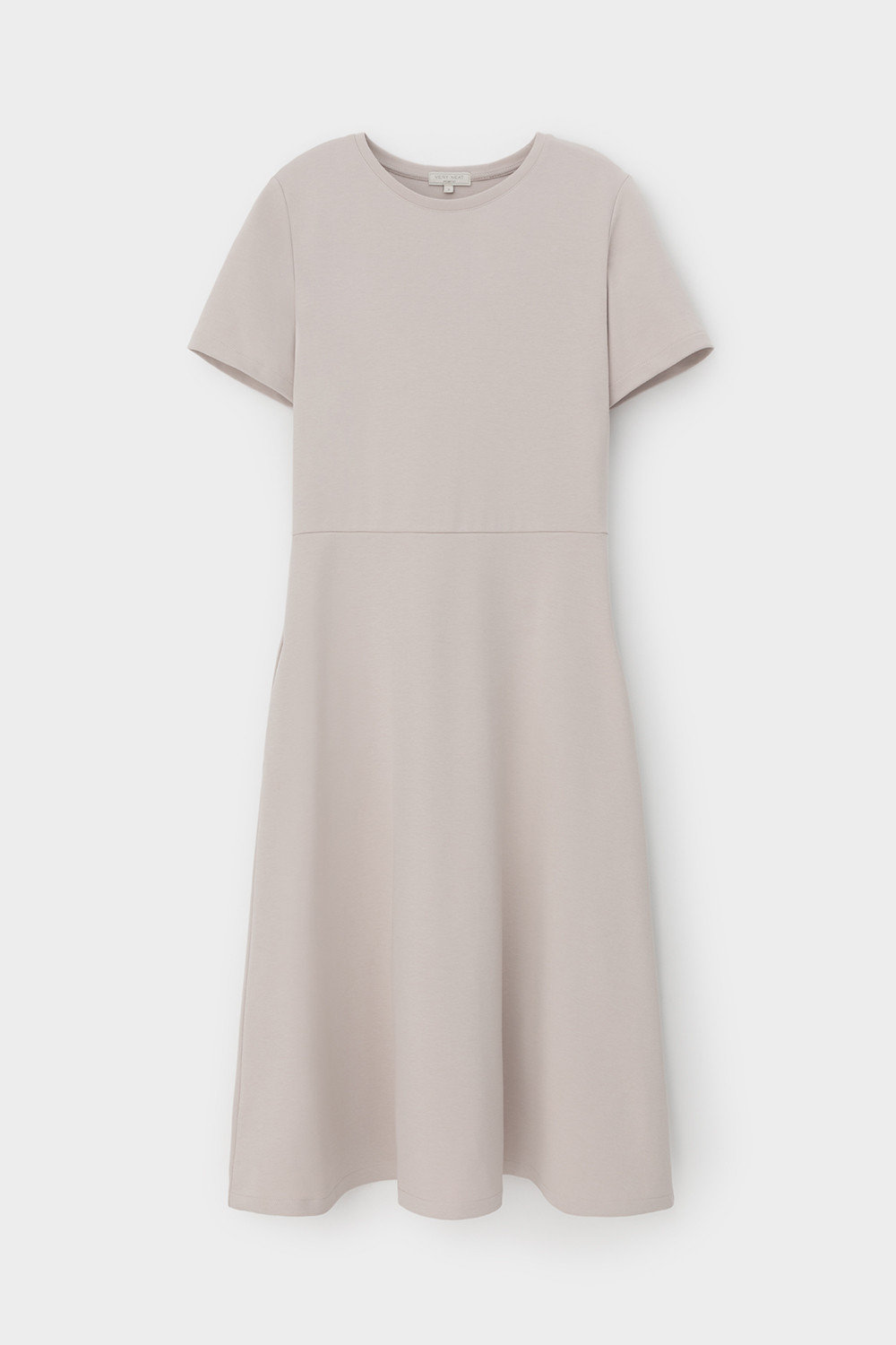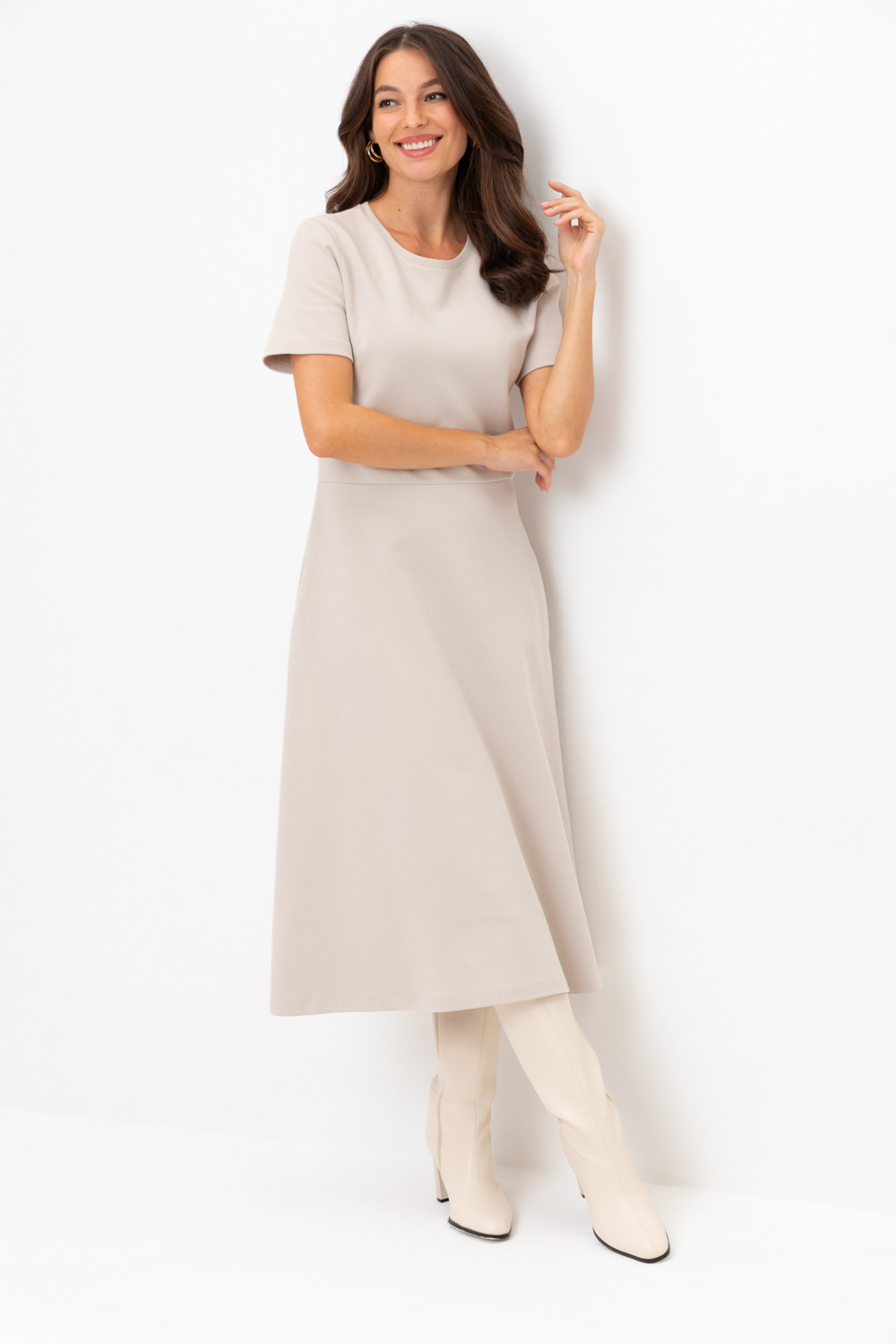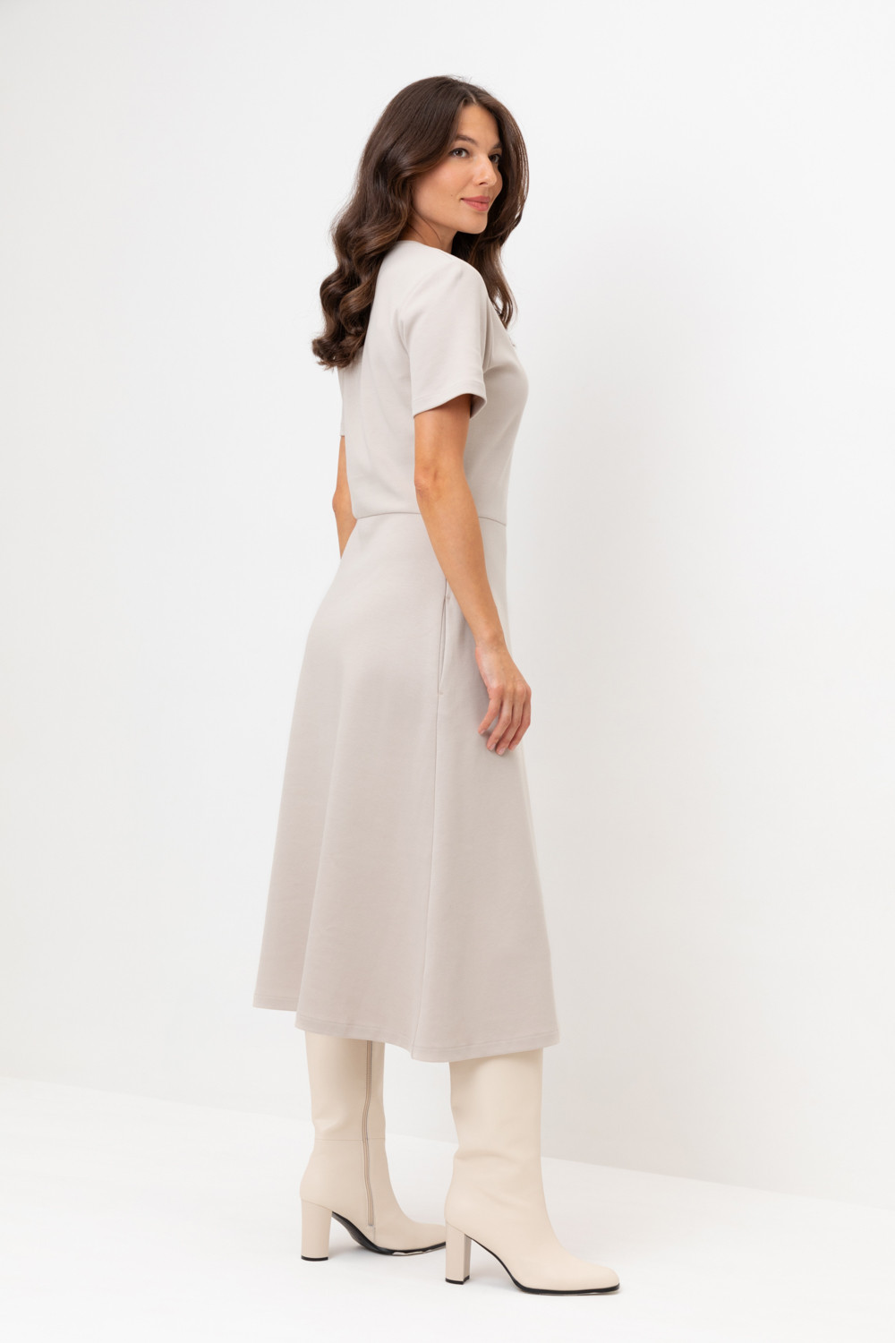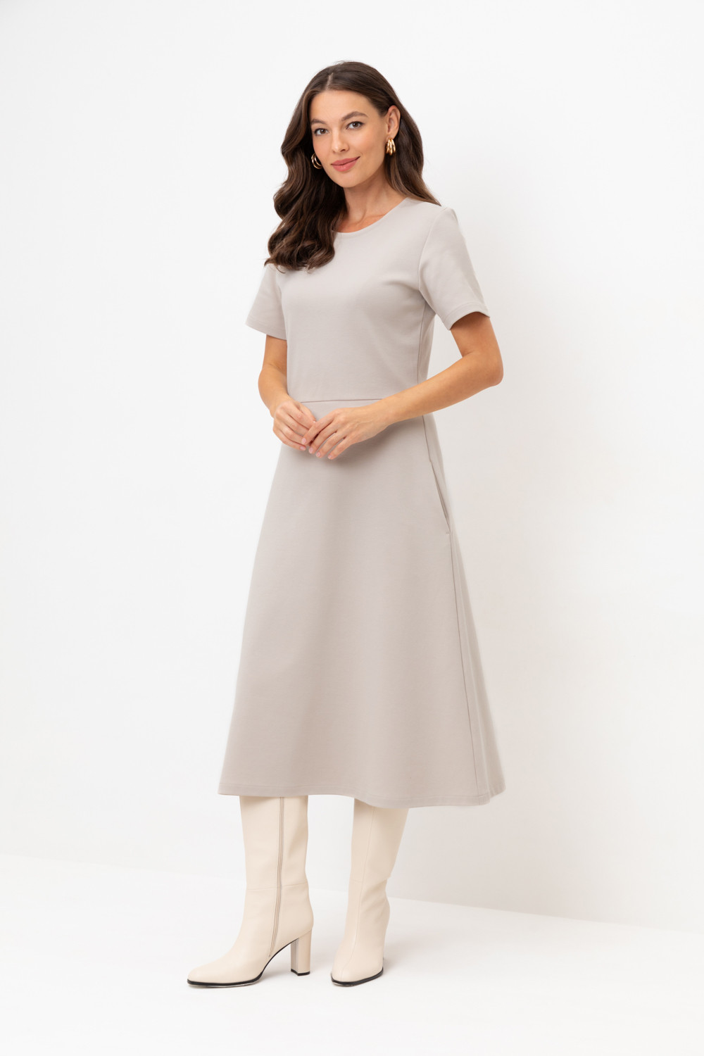 Платье с круглым вырезом и короткими рукавами из плотного трикотажа интерлок. Модель с трапециевидной юбкой и боковыми карманами.