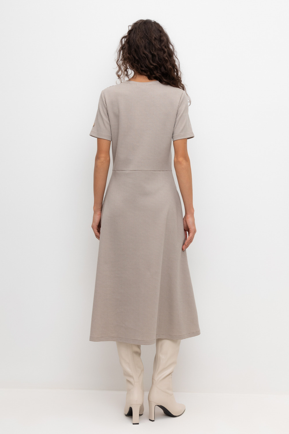 Платье с круглым вырезом и короткими рукавами из плотного набивного трикотажа интерлок. Модель с трапециевидной юбкой и боковыми карманами.