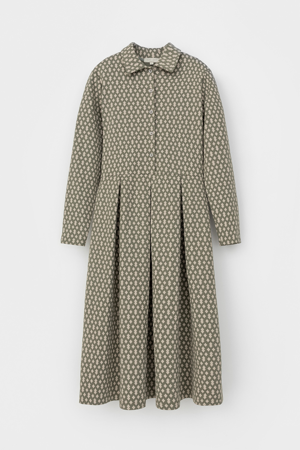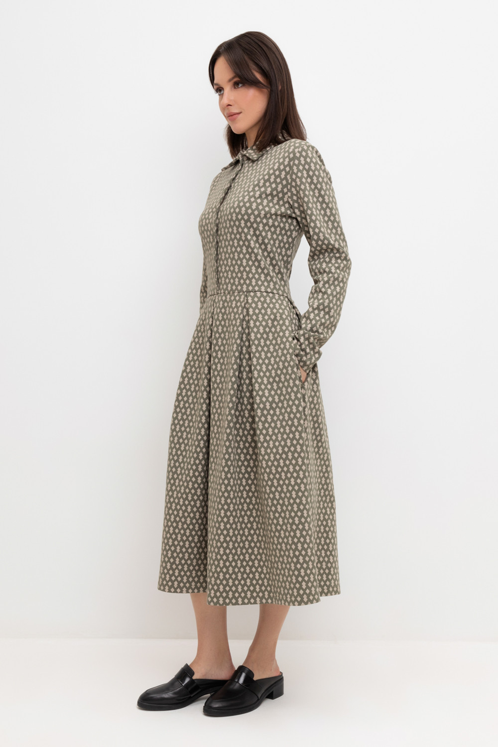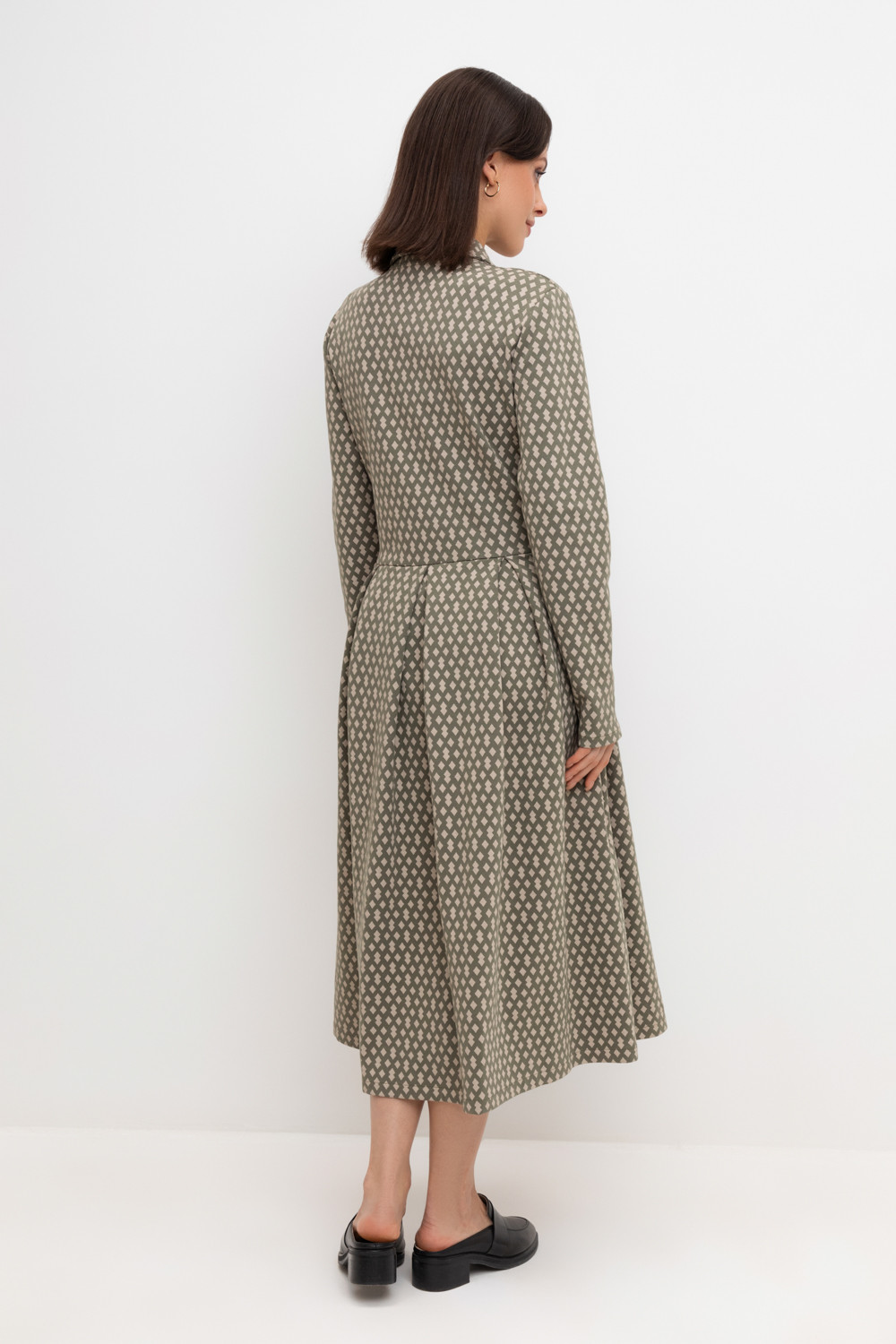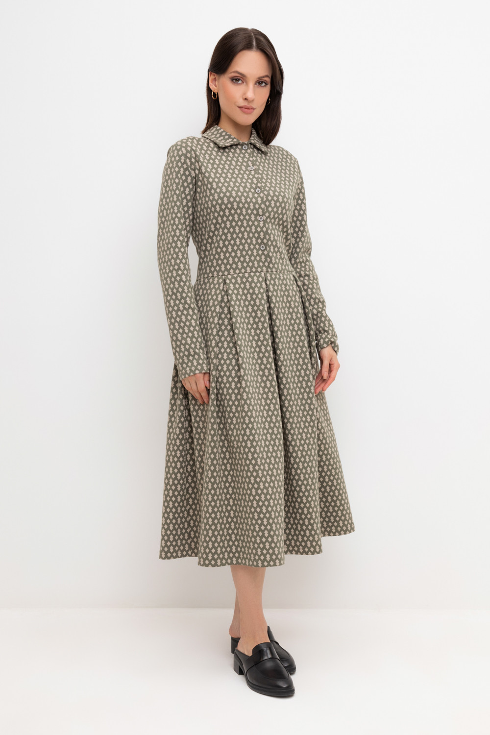 Платье с воротником из плотного набивного трикотажа интерлок. Модель с длинными рукавами и юбкой в складку.     Все трикотажные полотна производятся в соответствии с нормами Швейцарского сертификата ЭкоТекс. Сделано в России