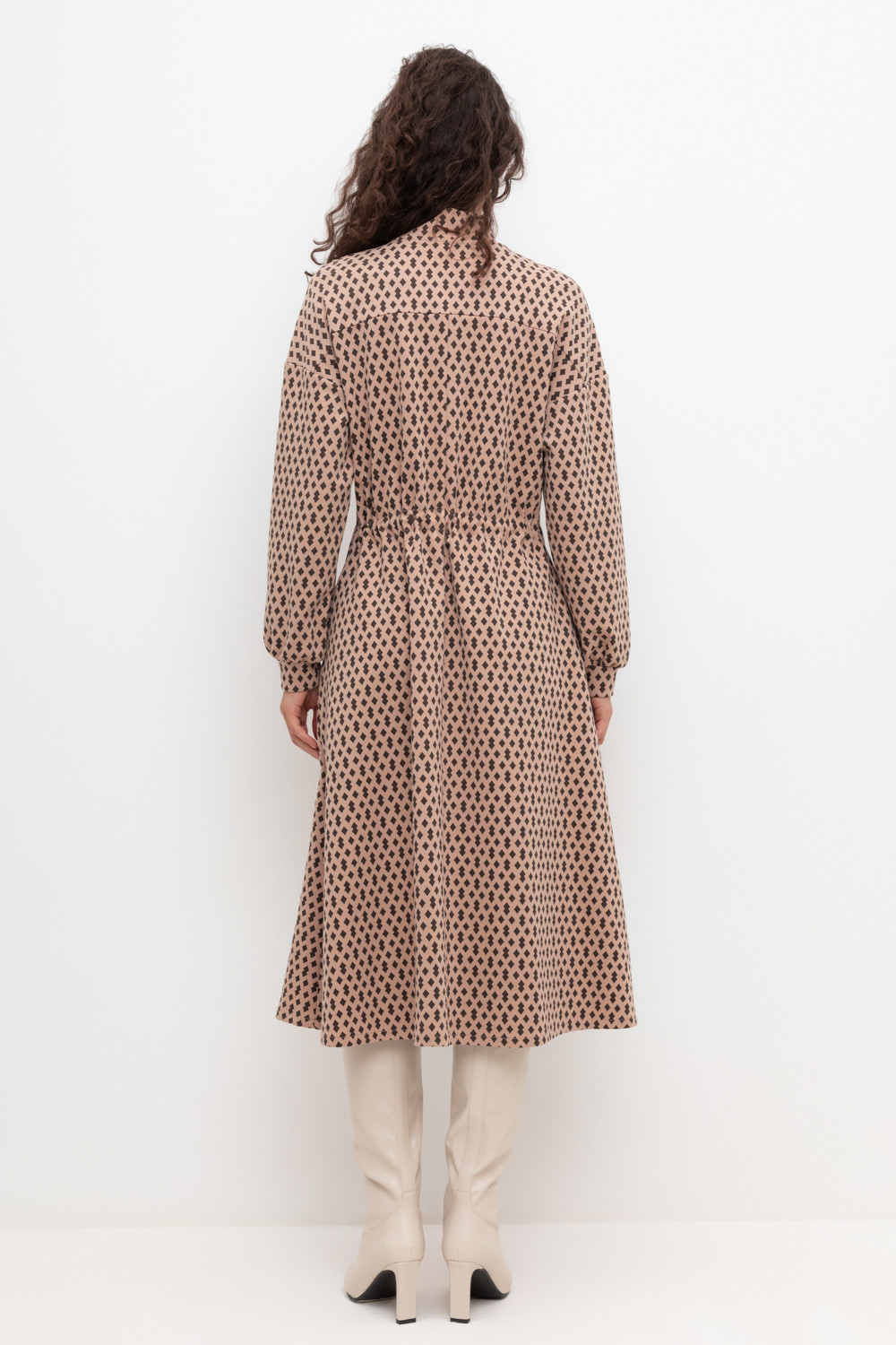 Платье с кулиской из плотного гладкого трикотажа интерлок с застежкой на молнию. Кулиска по линии талии подчеркивает женственность пропорций. Шнурок с наконечниками для утяжки служит украшением. Спущенное плечо придает изделию свободный силуэт.